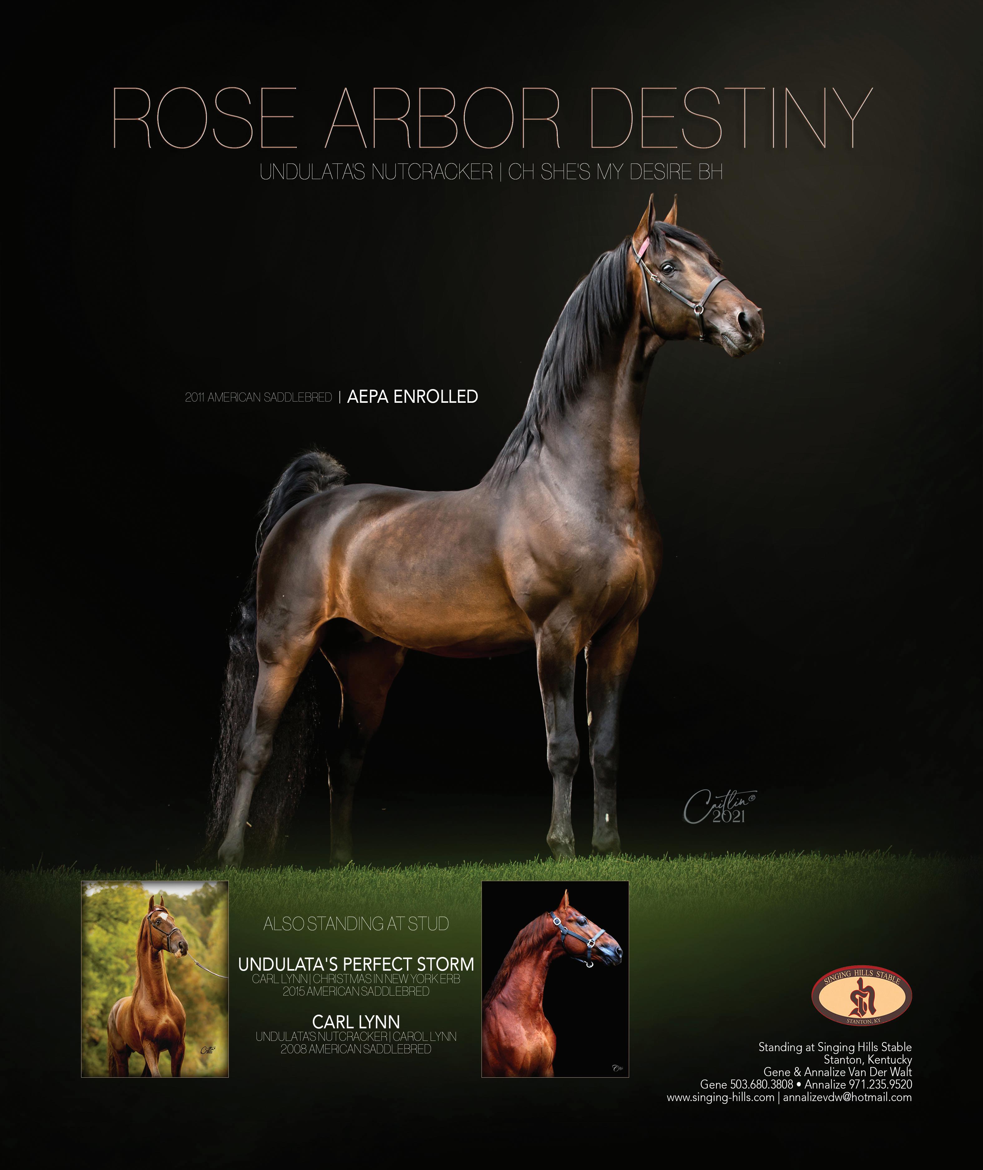 Add in his career as a sire, which has inspired English enthusiasts to predict that he might replicate *Bask’s influence in the discipline. It has not been unusual to see his sons and daughters make up as much as half of a championship line-up, and in AEPA competition alone, he has sired 58 titlists to date. In the last 10 years, his youngsters have won the AHT $100,000 Saddle Seat Futurity six times, and in both 2016 and 2021, one was champion and another reserve. Perhaps more importantly, most of his get have continued to build their resumes, accounting for U.S.