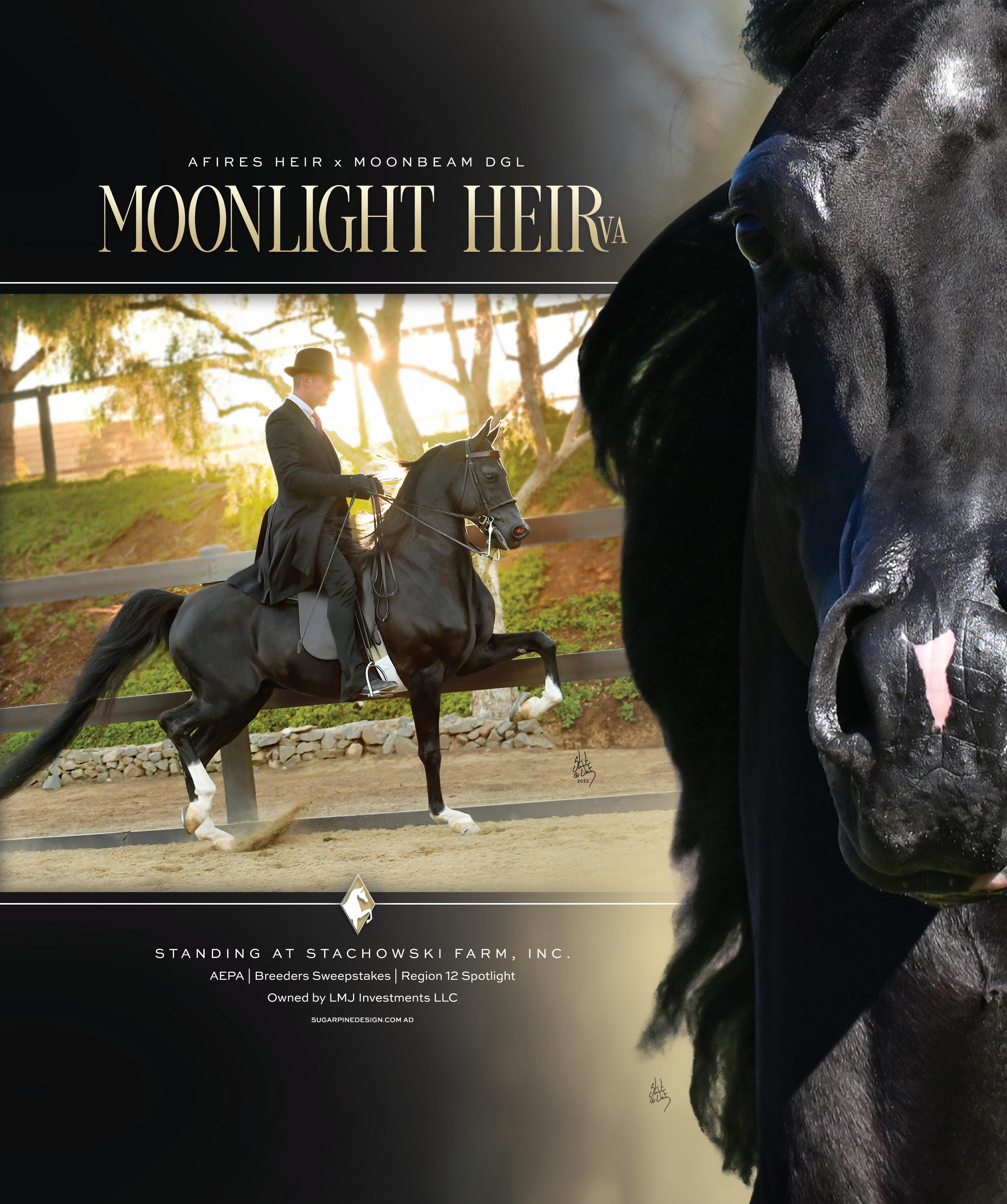 Perhaps the stallion’s biggest challenge is reproducing a son as good as he is, but with several national champion sons on the ground, his team enjoys looking forward to the future. Already he has a daughter writing history. Heirs Noble Love’s show record, with ten national championships (four in open English Pleasure) is even more stellar than her sire’s, and her breeding career looks like a capsule version of his, with a growing list of nationally decorated