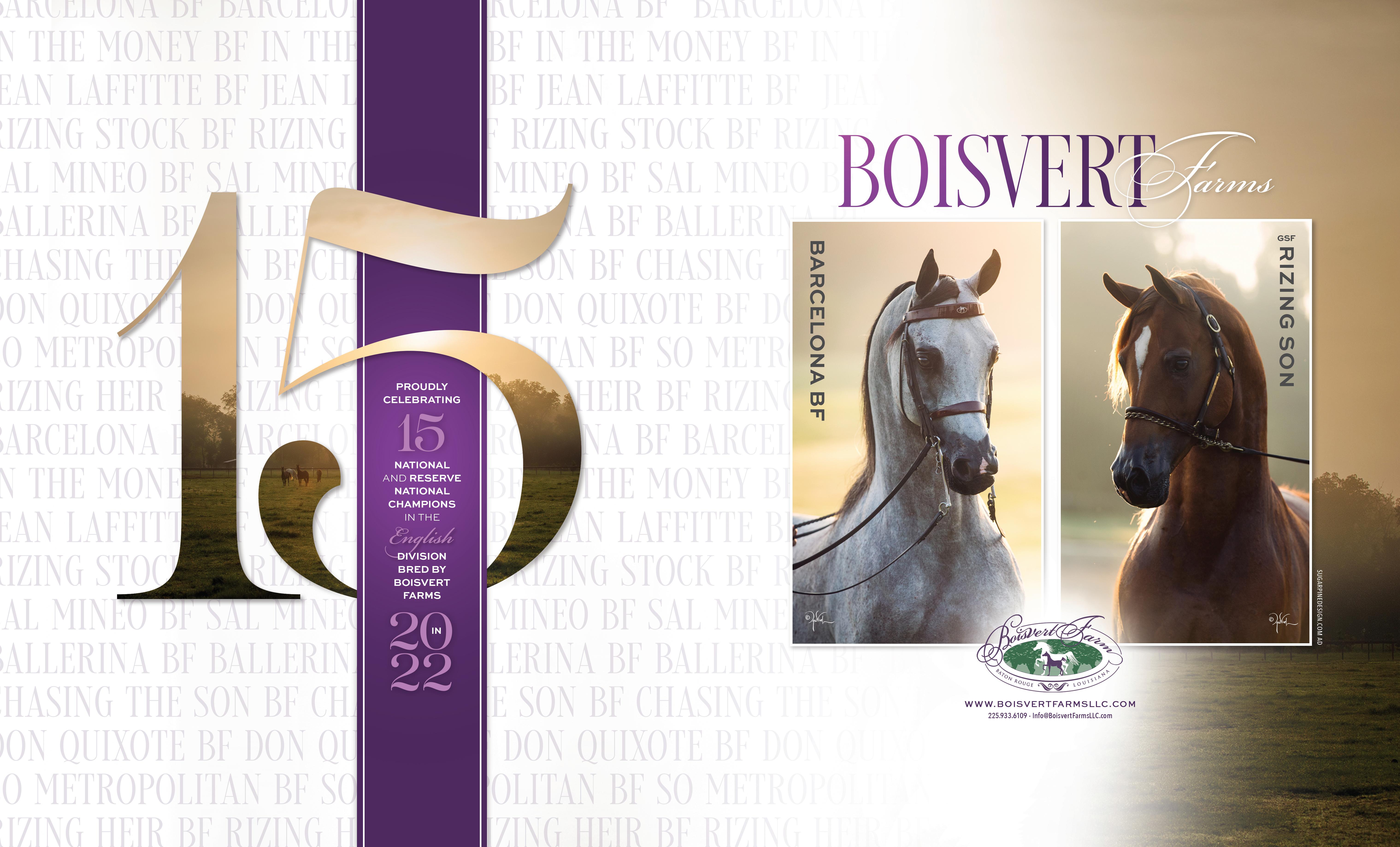 At the 2022 U.S. Nationals, the Inception son Bourbon Street SHF, showing with Andy Dearing, earned reserve in the English Pleasure Futurity—the same class in which In Quest, accompanied by Shan Wilson, was named 2022 U.S. National Top Ten. (One judge selected Bourbon Street as the champion, with In Quest reserve.)