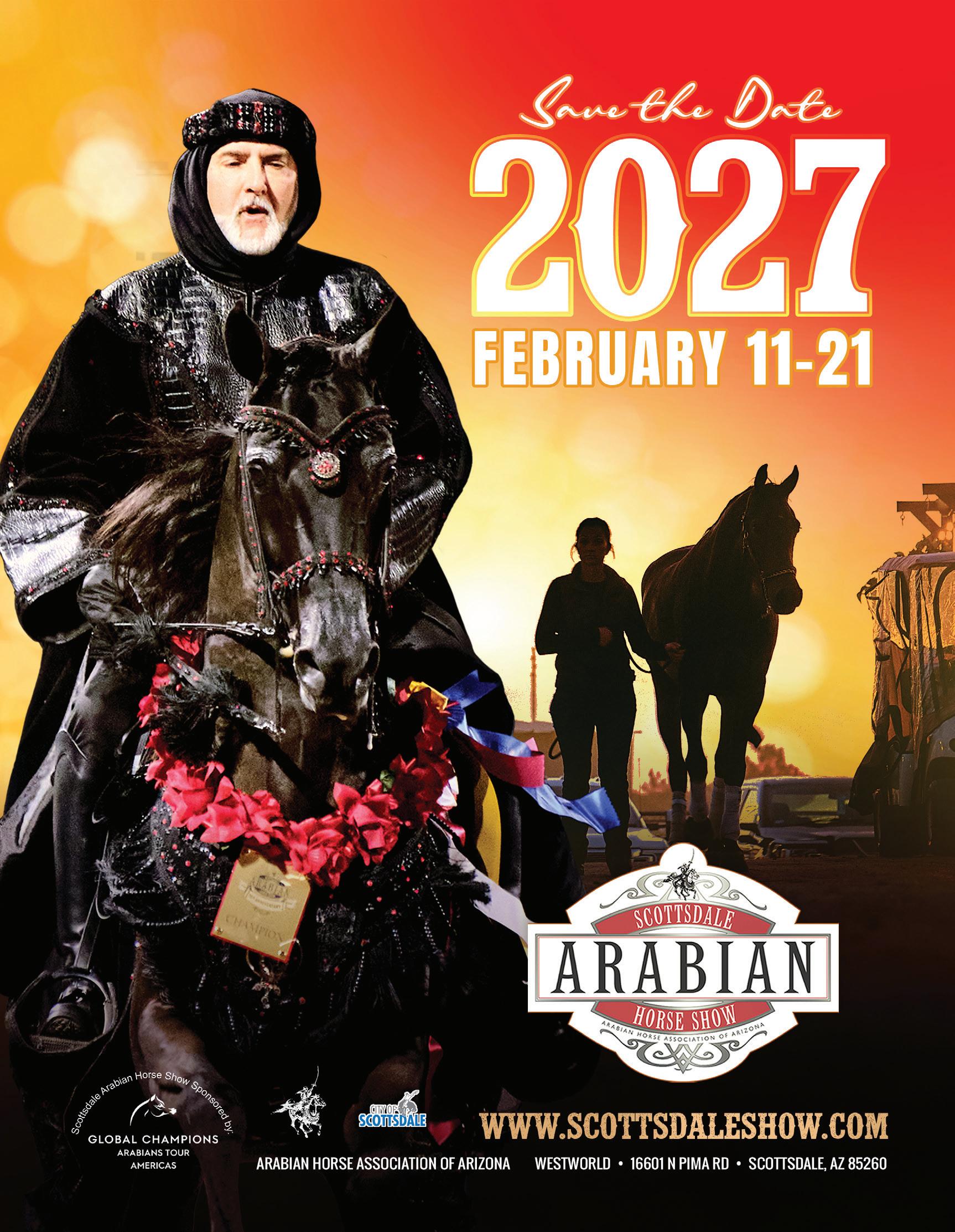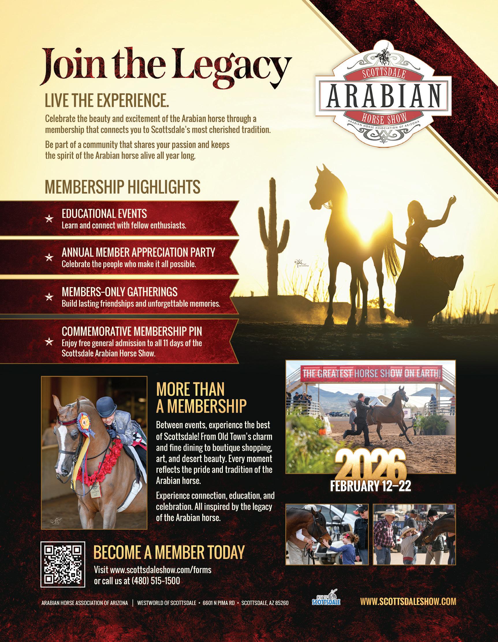 It is my great pleasure to welcome you to the 71st Annual Scottsdale Arabian Horse Show. As we enter our eighth decade, this iconic event continues to stand as one of the most influential and beloved gatherings in the Arabian horse world. Each February, our community comes together at WestWorld of Scottsdale to celebrate the beauty, excitement, and enduring spirit of the Arabian horse. The Greatest Horse Show on Earth banner in Wendell Arena is more than a slogan, it represents the passion and dedication that have propelled this show forward for more than seventy years.