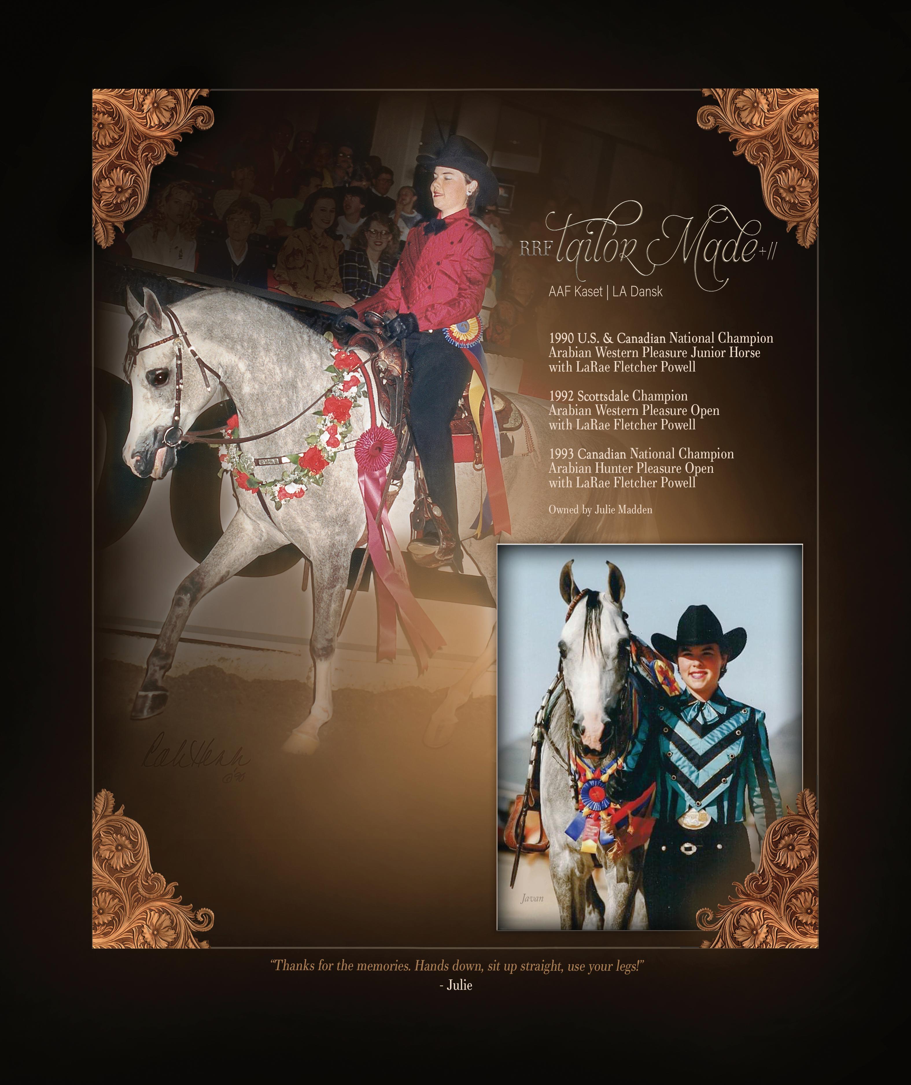 LaRae’s larger than life presence still remains crystal clear, for her husband and soulmate, Rod, her family, friends, clients and the equine world, where her talent and generosity graced us all.