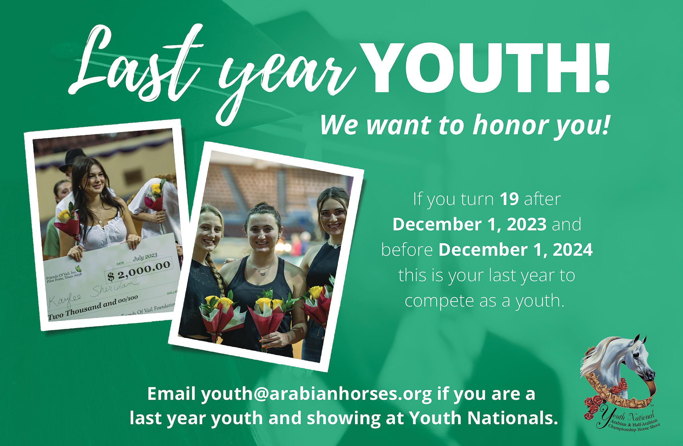 One youth is chosen to represent the Arabian breed based on his/her outstanding contribution to the Arabian horse community.