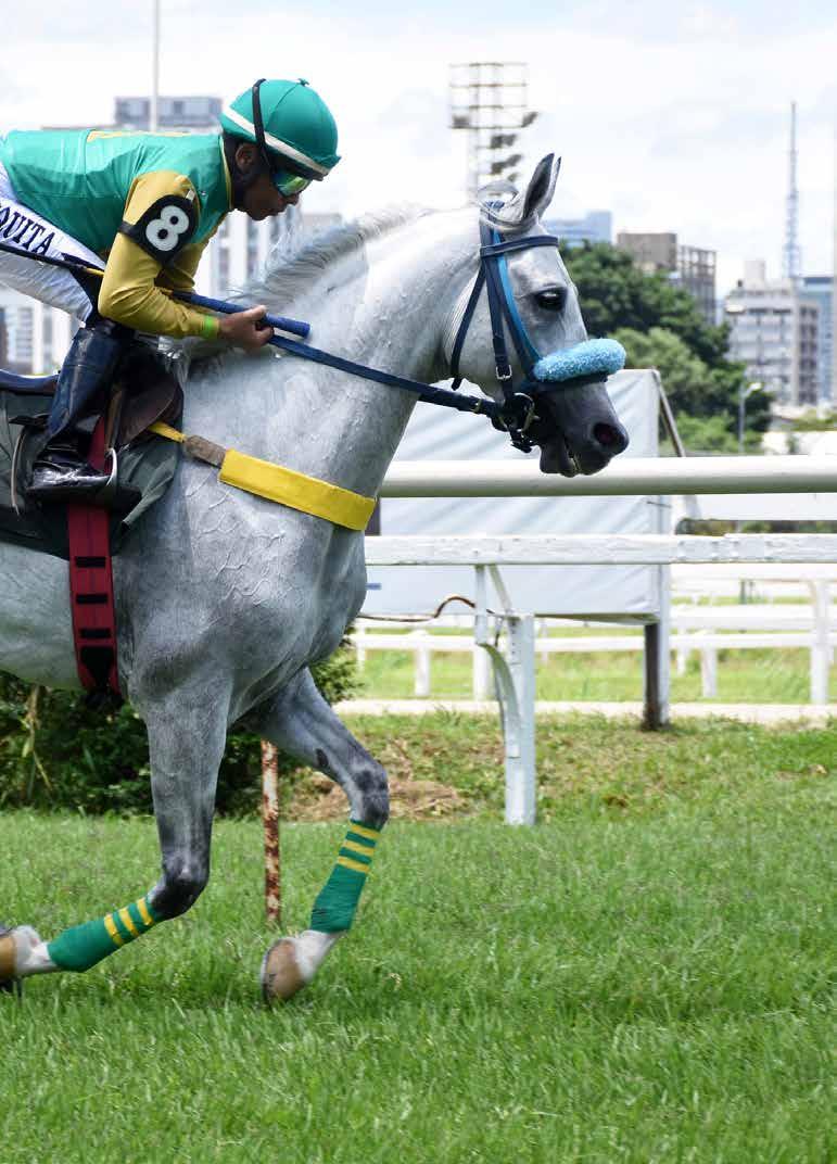 After a three-month hiatus for a well-deserved rest, VG Raj Al Mared returned to training in January at the Cidade Jardim Racecourse and dominated from start to finish his first race of the 2024 season, adding yet another victory under the impeccable command of Jeane Alves.