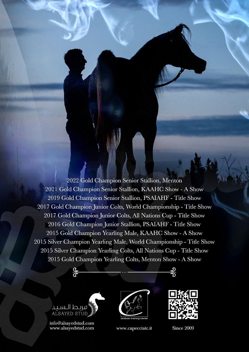 the following awards as soon as he arrived in the USA: 2012 Egyptian Event Unanimous Gold Champion Stallion and Highest Score in the Show, 2012 Region 2 Champion Stallion, 2012 Reserve National Champion Stallion 8 Years and Older, and 2012 Top Ten National Stallion. He was a classic Arabian stallion who gave you goosebumps every time he entered the ring with his shiny coat, majestic presence, and charm.