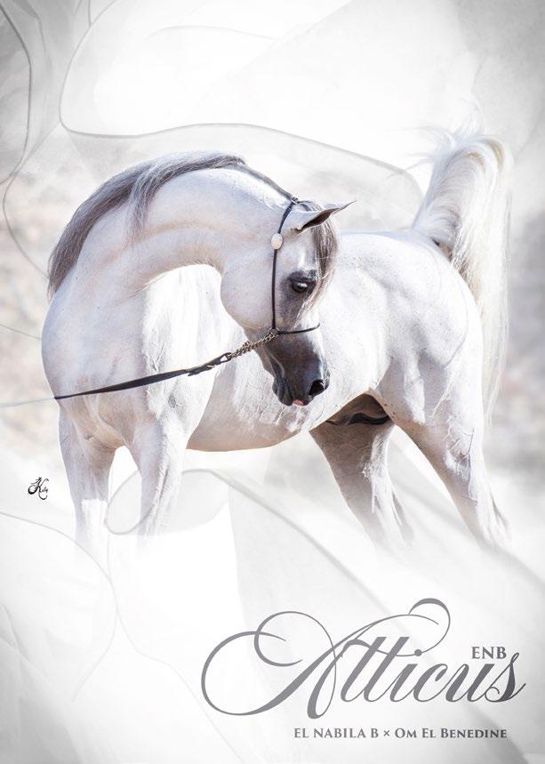 INDEX The silver stallion whose journey has just begun… Written by Zarah Perkins “I remember getting the call from Janina Merz when Atticus was foaled. was kind of bummed because wanted filly,” laughs Michael Weinstein, breeder of the internationally up and coming young stallion, Atticus ENB. “His dam, Om El Benedine had foaled an exquisite El Nabila B filly the year before and we lost her in an accident, and desperately wanted a replacement.” “Atticus was an absolutely beautiful baby,” Janina recalls. “Very feminine looking as in my opinion, many of the best breeding stallions are at birth. called Michael and said that a star had been born!” Of course, no one then could have foreseen just how prophetic Janina’s words were to prove. Now, at just seven years of age Atticus has not only acquitted himself admirably in the show ring being named 2019 Canadian Reserve National Champion Stallion and 2021 Scottsdale International Silver Champion but more importantly, from just handful of US bred foals, he is emerging as superstar sire of the rarest and most exceptional quality. His exquisite bay filly, Alesia ENB (from the PCF Vision mare, Aliyah Vision PCF) one of four daughters that made up his entire first foal crop has been a proMurray and Shirley Popplewell of RaeDawn Arabians, claiming among her successes, champion Cup where she was also awarded the highest movement points of the show – truly remarkable 036 Atticus