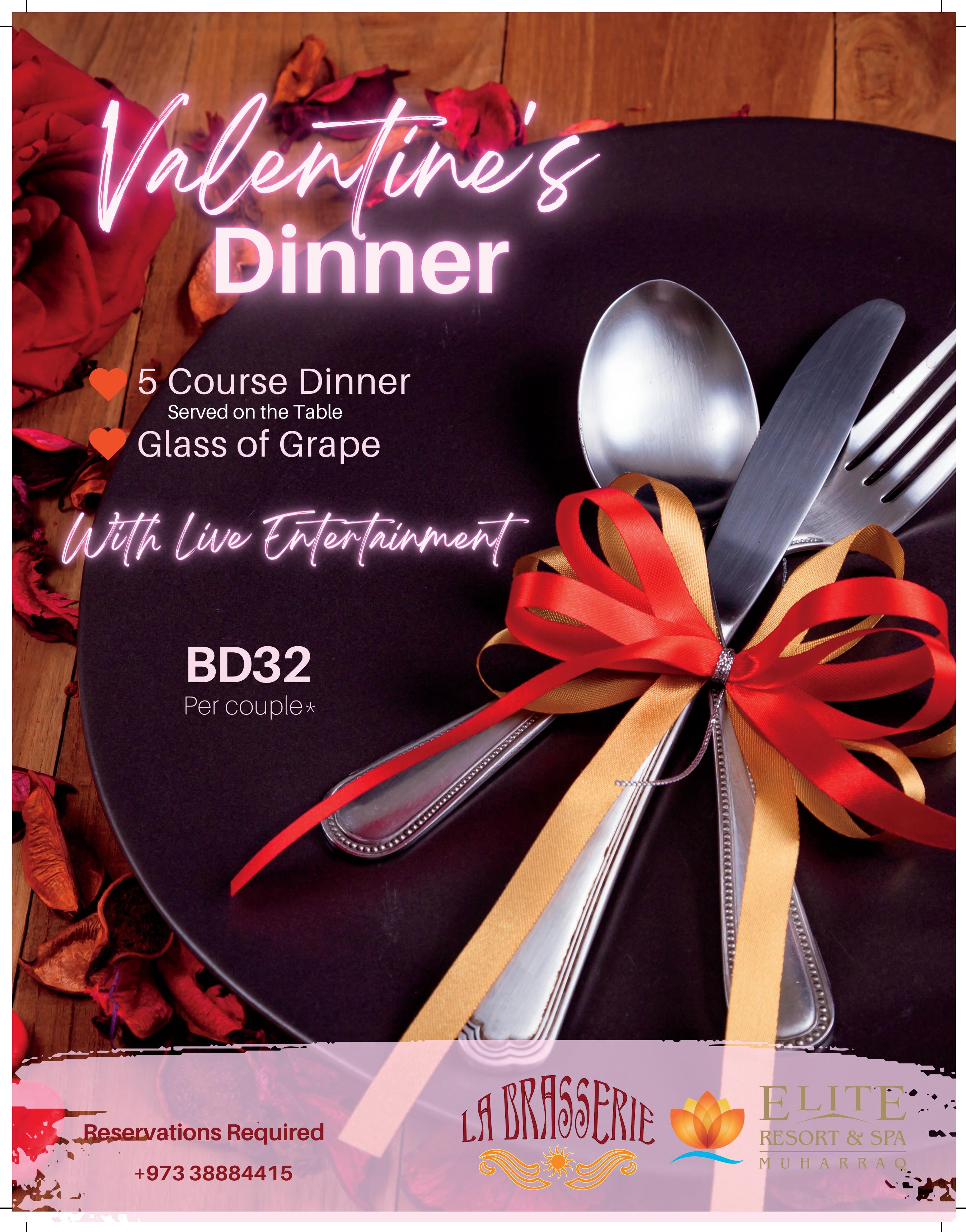 This Valentine's Day, Elite Hospitality Group's hotels are hosting a variety of celebrations you need to check out! Elite Resort and Spa's La Brasserie Specialty Restaurant will offer a fivecourse set menu accompanied by a selection of house beverages at BD 32 net per couple.
