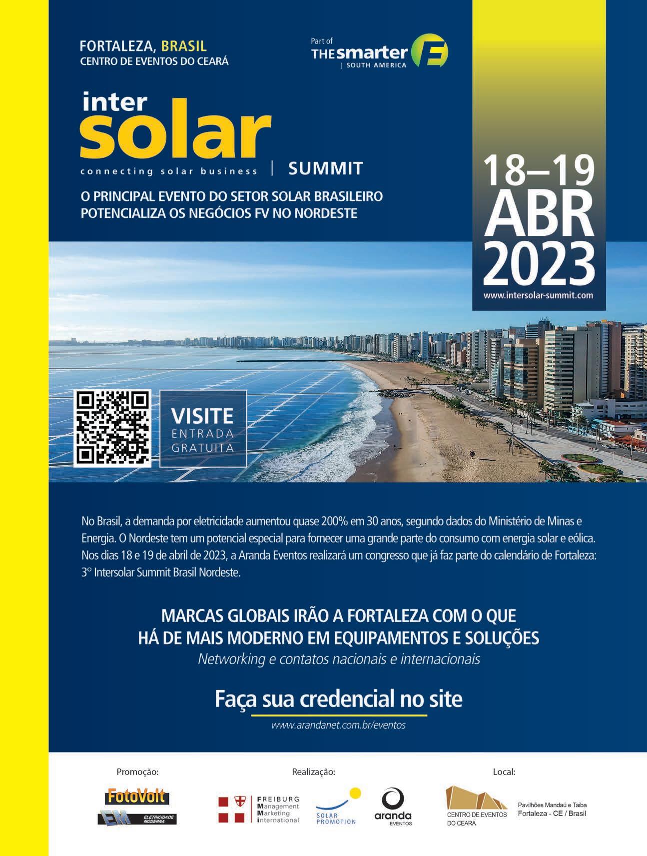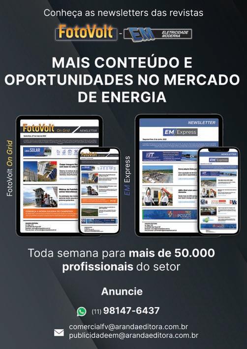 IntersolarSummit –O IntersolarSummit BrasilNordeste serárealizadoemFortaleza, CE,em18e19deabril.Voltadoparaespecialistasbrasileiroseinternacionais,enfocaráaenergiasolarerenovávelnaregião.O congressoreuniráespecialistasparadiscutir políticas,desa osesoluçõesrelacionadosà geraçãodistribuída,FVemlargaescala,nanciamento,FVehidrogênioverde,etc.Informações: https://www.intersolar.net.br/ en/home/summit-brasil-nordeste Mobilidadeelétrica –O DME-DiadaMobilidadeElétrica estámarcadopara20e21de maio,emSãoPaulo,SP.TambémserãorealizadasediçõesemBrasília,nodia8demarço,eemBalneárioCamboriú,em14deabril. Oeventovisaestimularodebateeadifusão dosbenefíciosdaeletri caçãonamobilidade urbanaàpopulação,pormeiodeveículos HEV(híbridos),PHEV(híbridos plug-in) e BEV(totalmenteelétricos),alémdecomponenteseinfraestrutura,incluindotecnologiaseserviçosligadosàmobilidadeelétrica, comoestaçõesderecargaserelacionados. https://diadamobilidadeeletrica.com.br/