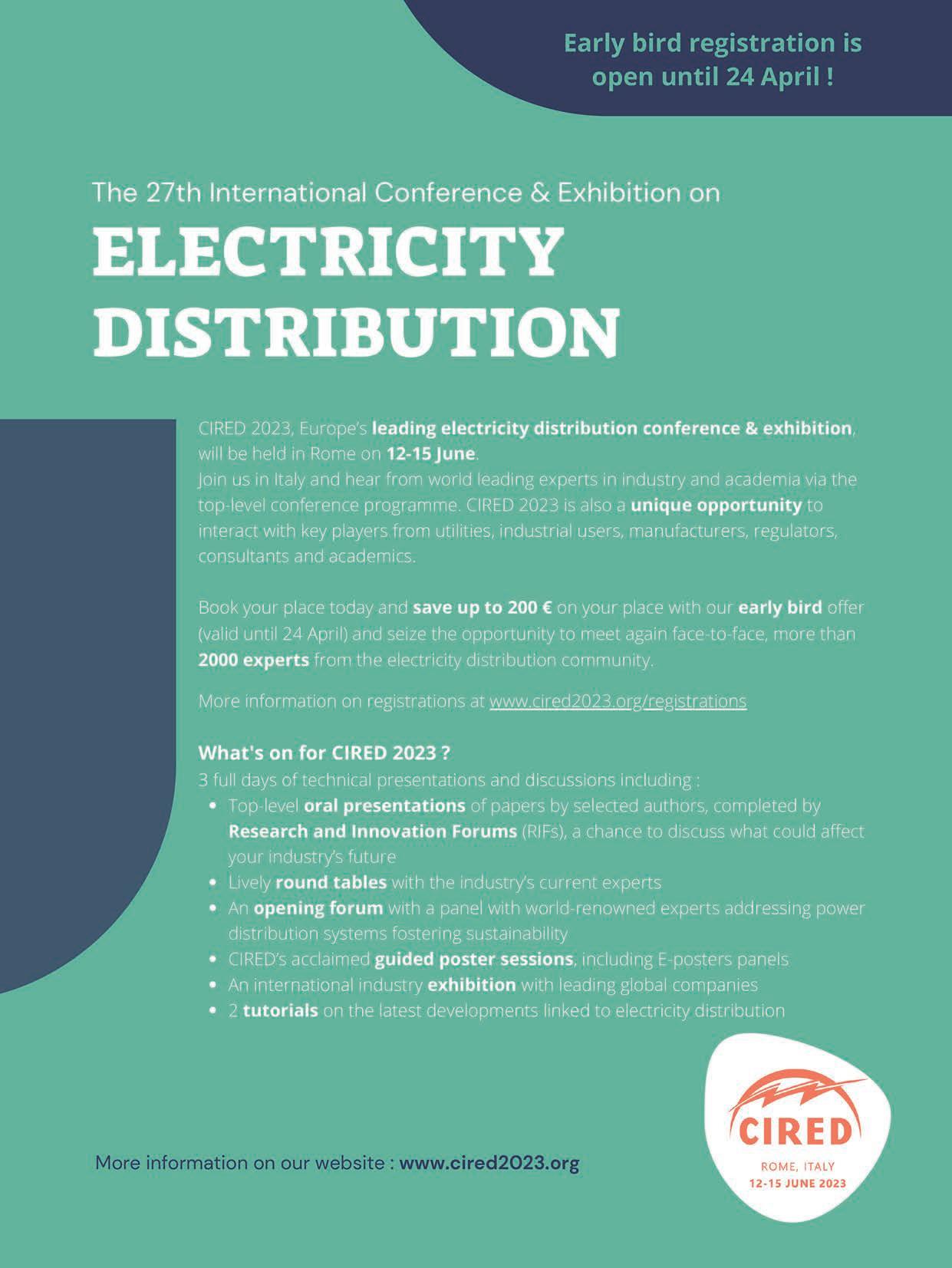 Cired –A27a ediçãoda Cired-InternationalConference&ExhibitiononElectricity Distribution,realizadaacadadoisanosem diferenteslocaisdaEuropa,aconteceráem Roma,Itália,de12a15dejunho.Consideradooprincipalfórumdacomunidadede distribuiçãodeeletricidade,oeventodiscute temasrelacionadosacomponentesderede, qualidadedeenergia,compatibilidadeeletromagnética,operação,proteção,controlee automação,planejamento,regulamentação, gestãoderisco,etc.Éesperadaaparticipação demaisde2500especialistasdaárea.Paralelamenteàconferência,serárealizadauma exposiçãoreunindomaisde140empresas. Maisinformações: www.cired2023.org.