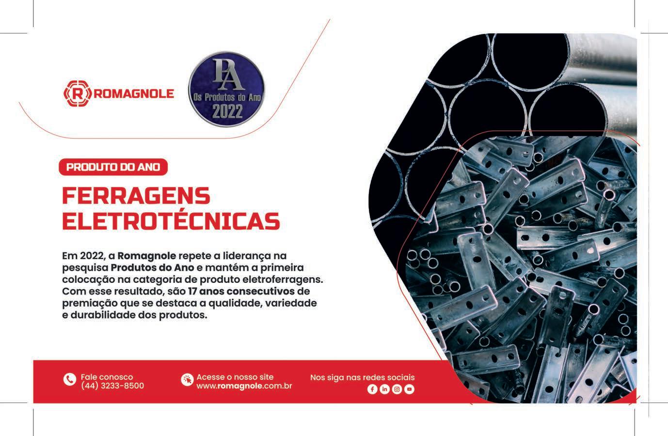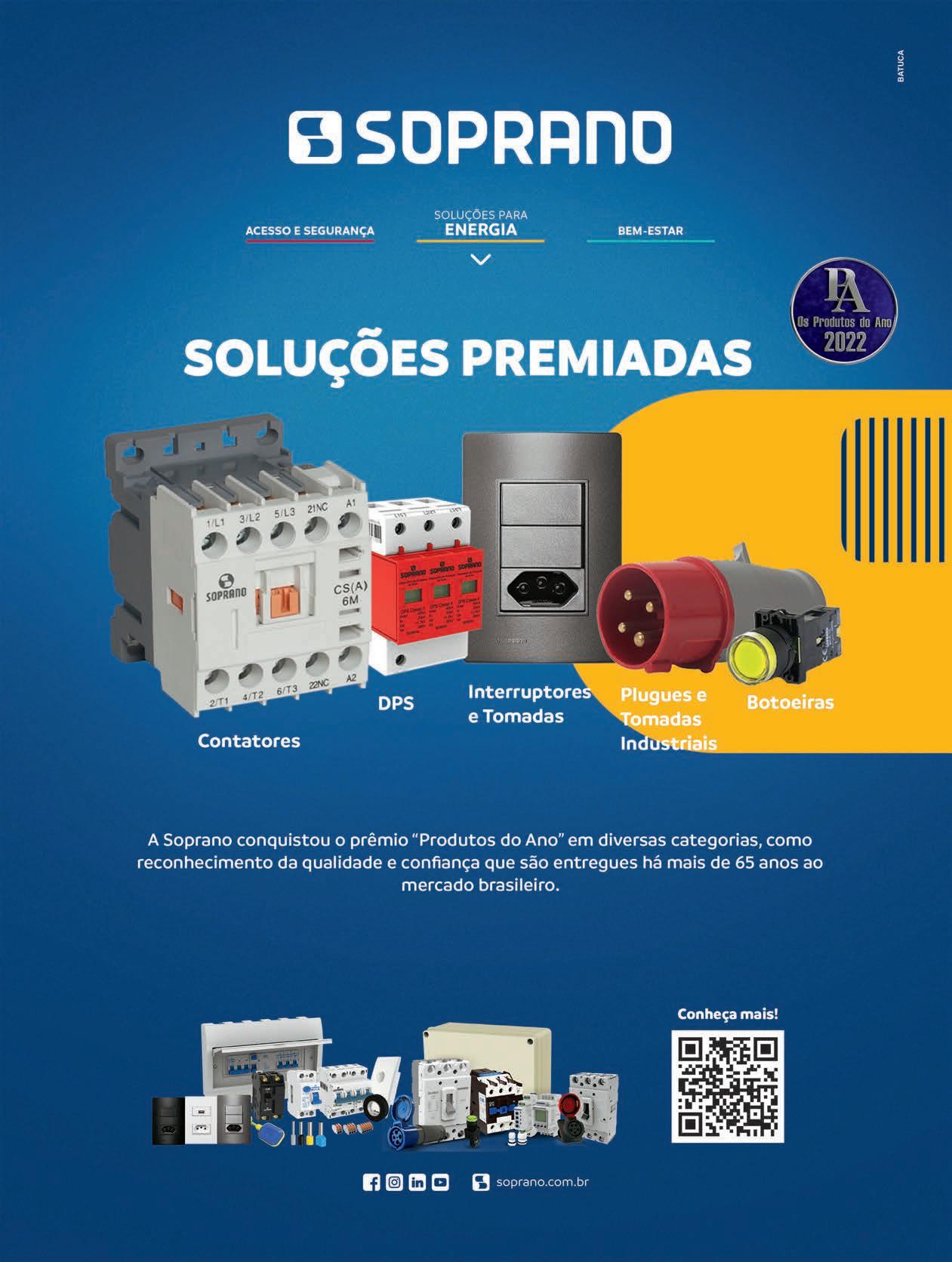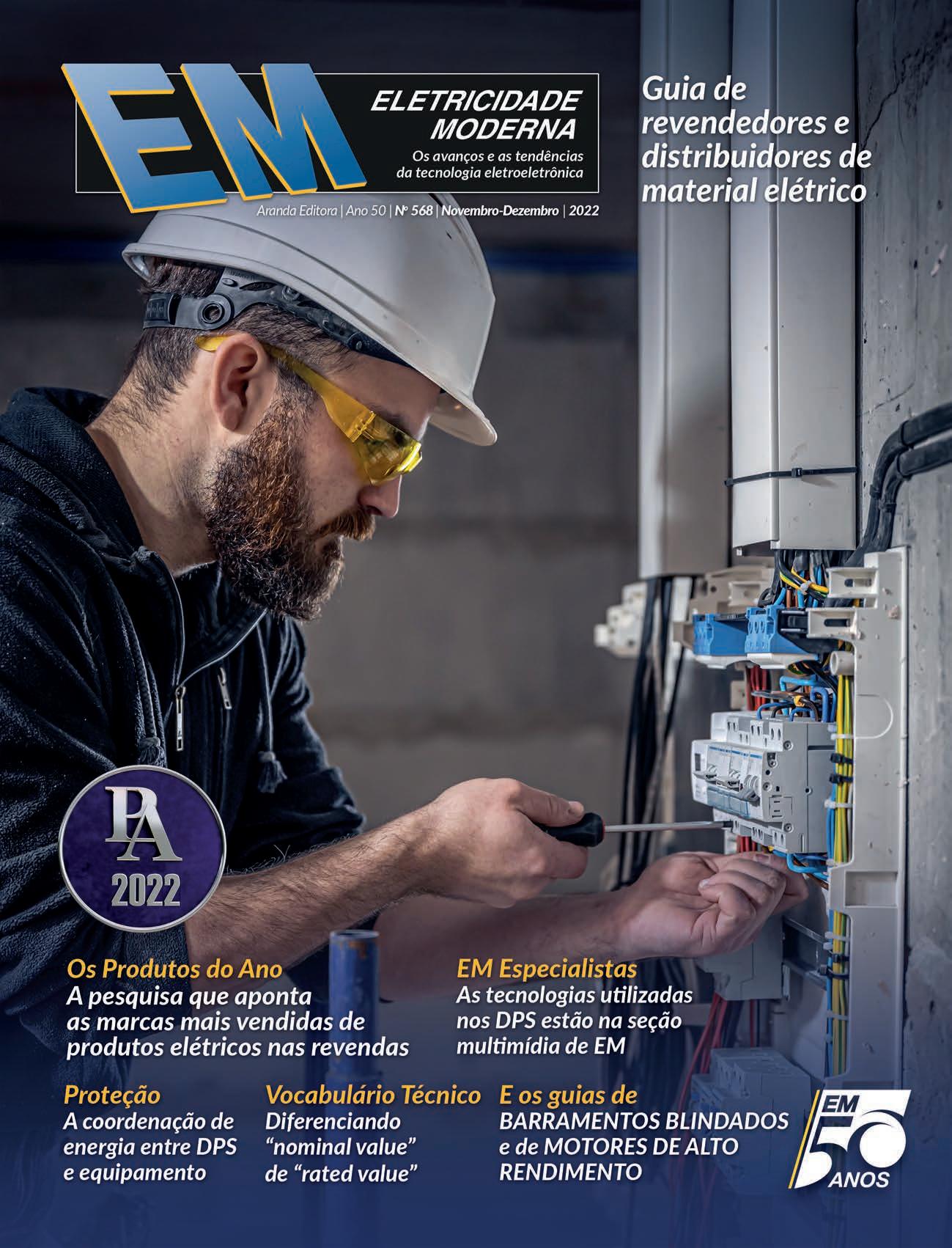 Notas: (1) Dispositivos de proteção diferenc al residual; (2) D spositivos de proteção contra sur tos; (3) Chaves seccionadoras de ação rápida, seccionadores fusíveis e dispositivos correlatos; (4) Abraçadeiras, marcadores para amarração e identificação de fios e cabos; (5) Eletrodutos e acessórios; (6) Eletrocalhas, bandejas, leitos; (7) Caixas de ligação, de passagem, conduletes; (8) Interruptores nas suas diferentes versões: simples, paralelo, intermediário; (9) Minuteria e temporizador; (10) Conjugado ou não com luz e/ou minuteria; (11) Re és térmicos e outros relés para proteção de motores; (12) Chaves de par tida convencionais (par tida direta, estrela triângulo, compensadoras) e sof t star ters; (13) Luminárias convencionais, projetores, spots, etc; (14) Para correção do fator de potência; (15) Amperímetros, multímetros, testadores de continuidade, medidores de isolamento, terrômetros, instrumentos multifunção, etc; (16) Sistemas de energia ininterrupta (no breaks); (17) Módulos e/ou inversores FV;Cabos FV Obs : Os dados constantes deste guia foram fornecidos pelas próprias empresas que dele par ticipam, de um total de 1 529 empresas pesqu sadas Fonte: Revista Eletricidade Moderna, novembro/dezembro de 2022 Este e muitos outros guias estão disponíveis on line, para consulta Acesse w w w arandanet com br/revista/em e confira Também é possível incluir a sua empresa na versão on line de todos estes guias