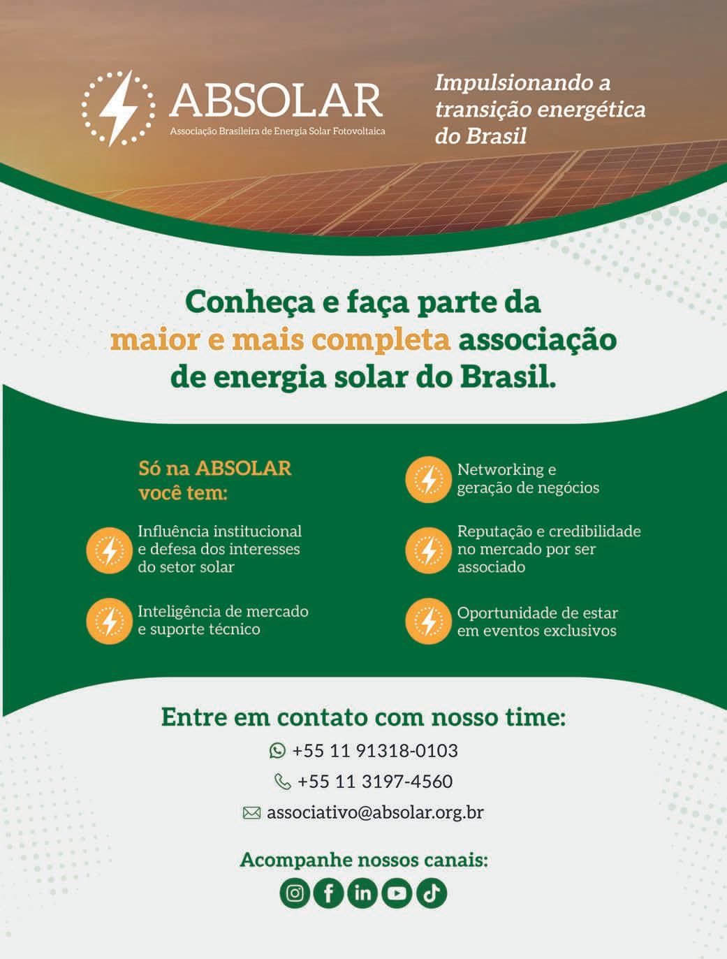 Com a nova gestão do Conselho de Administração, a entidade intensi ca sua atuação técnica e institucional junto a governos, empresas e sociedade, reforçando o compromisso de acelerar a transição energética brasileira. Na prática, a atuação será pautada pela ampliação da participação da fonte solar na matriz elétrica, bem como na promoção de um sistema elétrico mais moderno, acessível e alinhado às demandas de desenvolvimento sustentável do País.