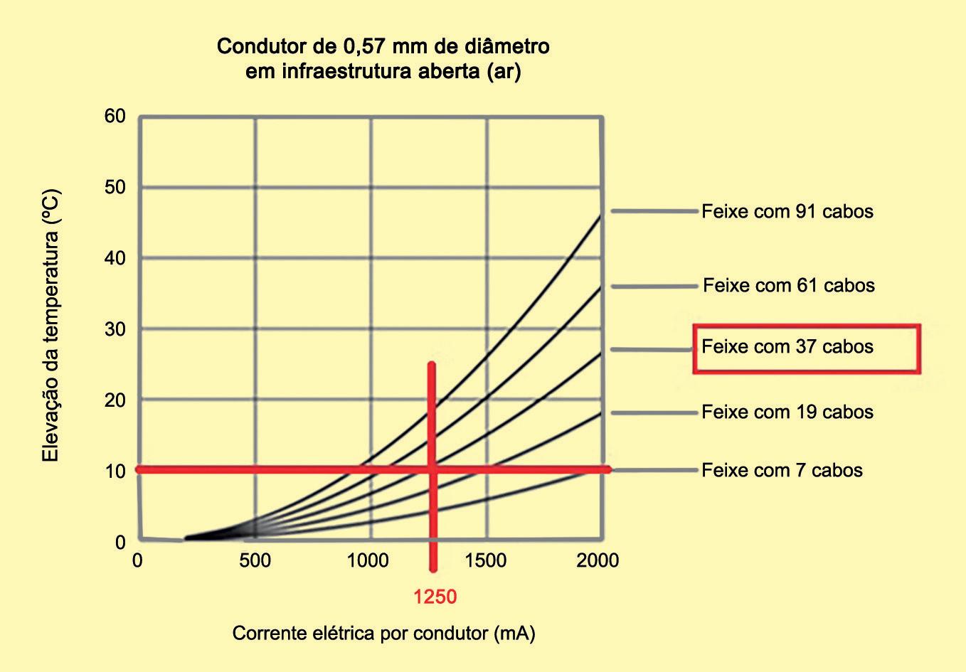 Conforme destacado na figura 2, para um cabo balanceado de 1 par e bitola de 0,57 mm de diâmetro em infraestrutura aberta, a corrente elétrica por condutor pode chegar a 1,25 A para um feixe com 37 cabos, para um ΔT de 10°C. Em contrapartida, para o mesmo ΔT, um