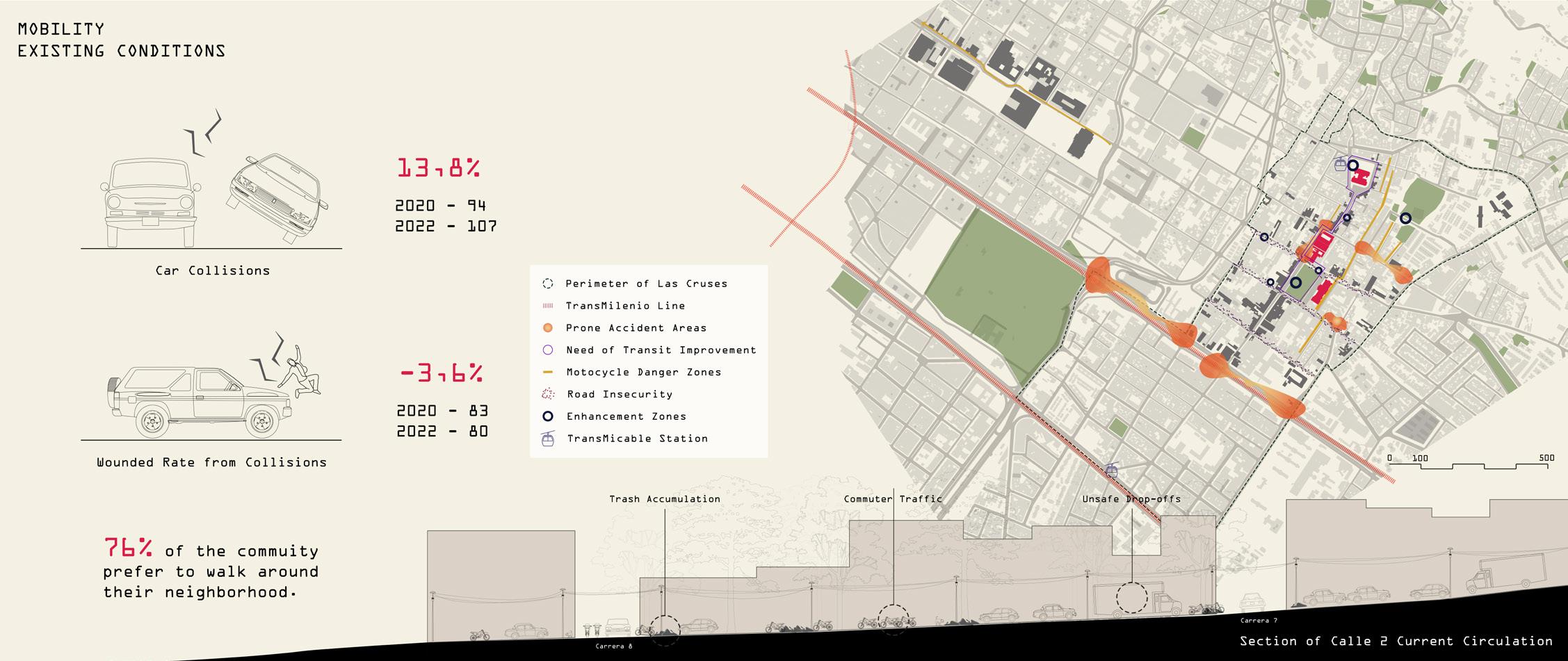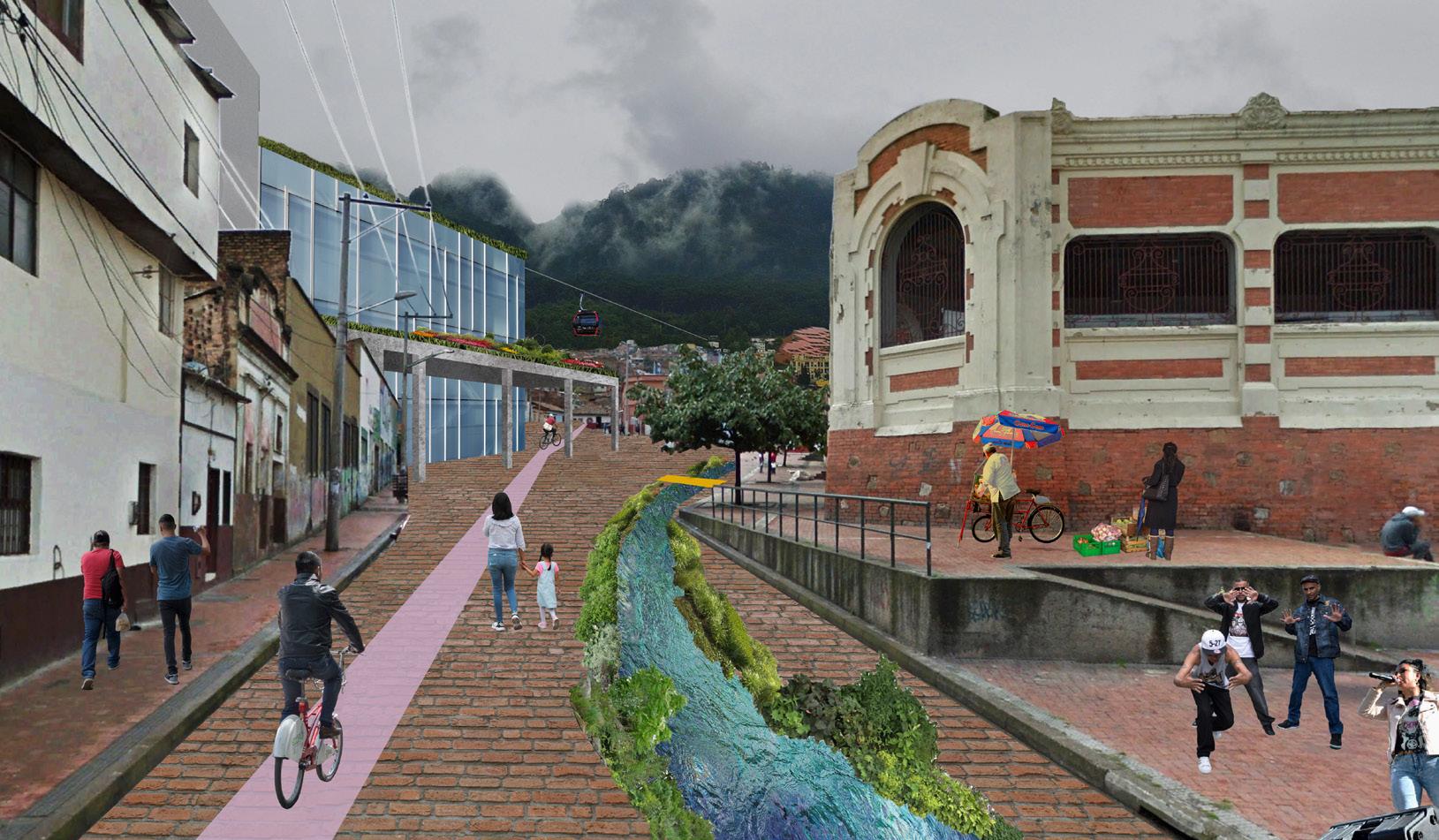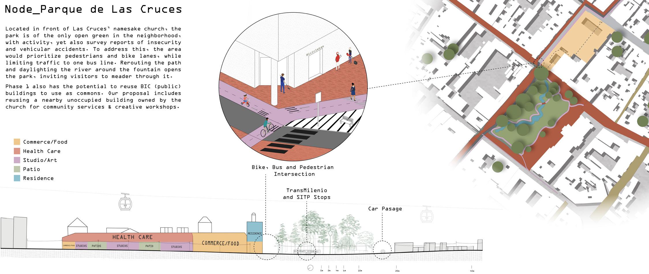 In the heart of historic Bogotá, Colombia, stands the neighborhood of Las Cruces, with heritage colonial architecture mixed with modernization. When sociopolitical turmoil in Colombia & neighboring countries led to high displacement & immigration rates, many people have found refuge in Las Cruces. Over time, it began deteriorating due to negligence, leading to decreased security, few green spaces, poor infrastructure, and frequent accidents. Intervención Revival aims to provide the current hostile environment with opportunities for residents to regain agency & safety and encourage community. Phase 1 focuses on present commons connected with pedestrian streets & bike paths, and to the city’s pedestrian corridor. The commons include the cable car station, daylit parts of the buried Fucha river, stages for the renowned hip-hop scene, and a vacant church building reused as a community center, all in efforts to revitalize the neighborhood while preserving its historical charm.