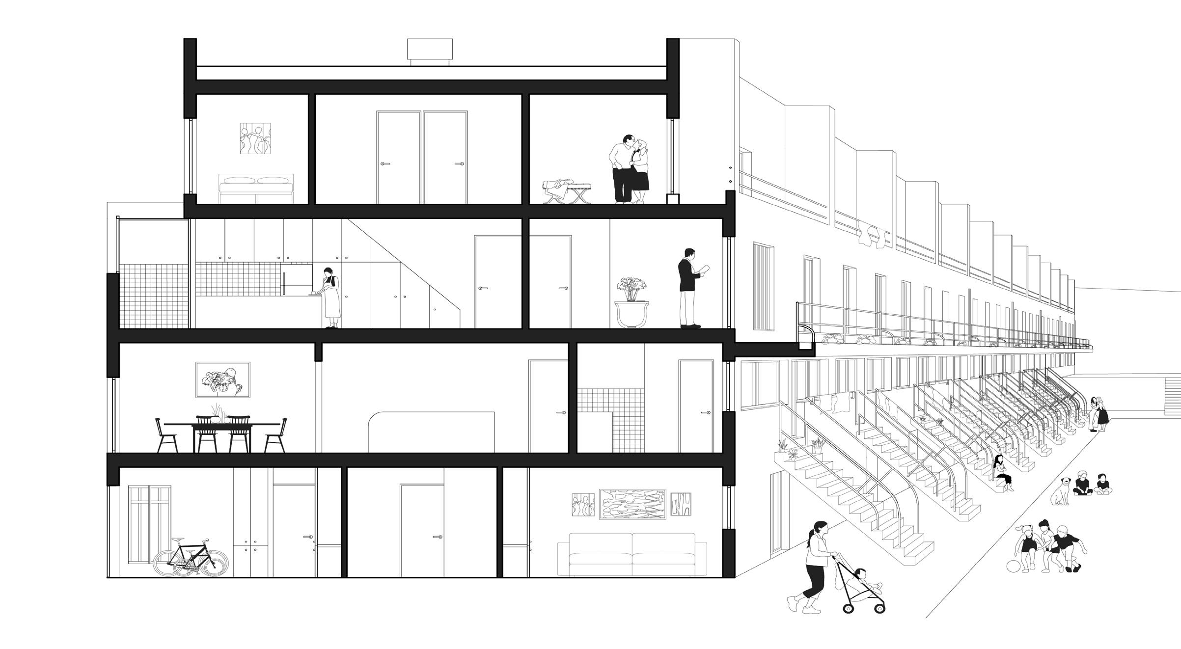 Designed by Portuguese architect Álvaro Siza in the 1970s, the SAAL Bouça complex was a social housing project commissioned to address the severe housing crisis facing the country at the time. The duplex homes are organised in four-story blocks of stacked two-story homes, arranged in rows facing each other with long planted courtyards in between to provide communal spaces. The sectional diagram depicts different living conditions in the 1970s on the left, which depicts a multigenerational home with many youth playing outside, and the right shows residents in the 2000s, with a single parent household and childless couples. These interactions inspired common spaces in The Townhouse for multigenerational and shared living.