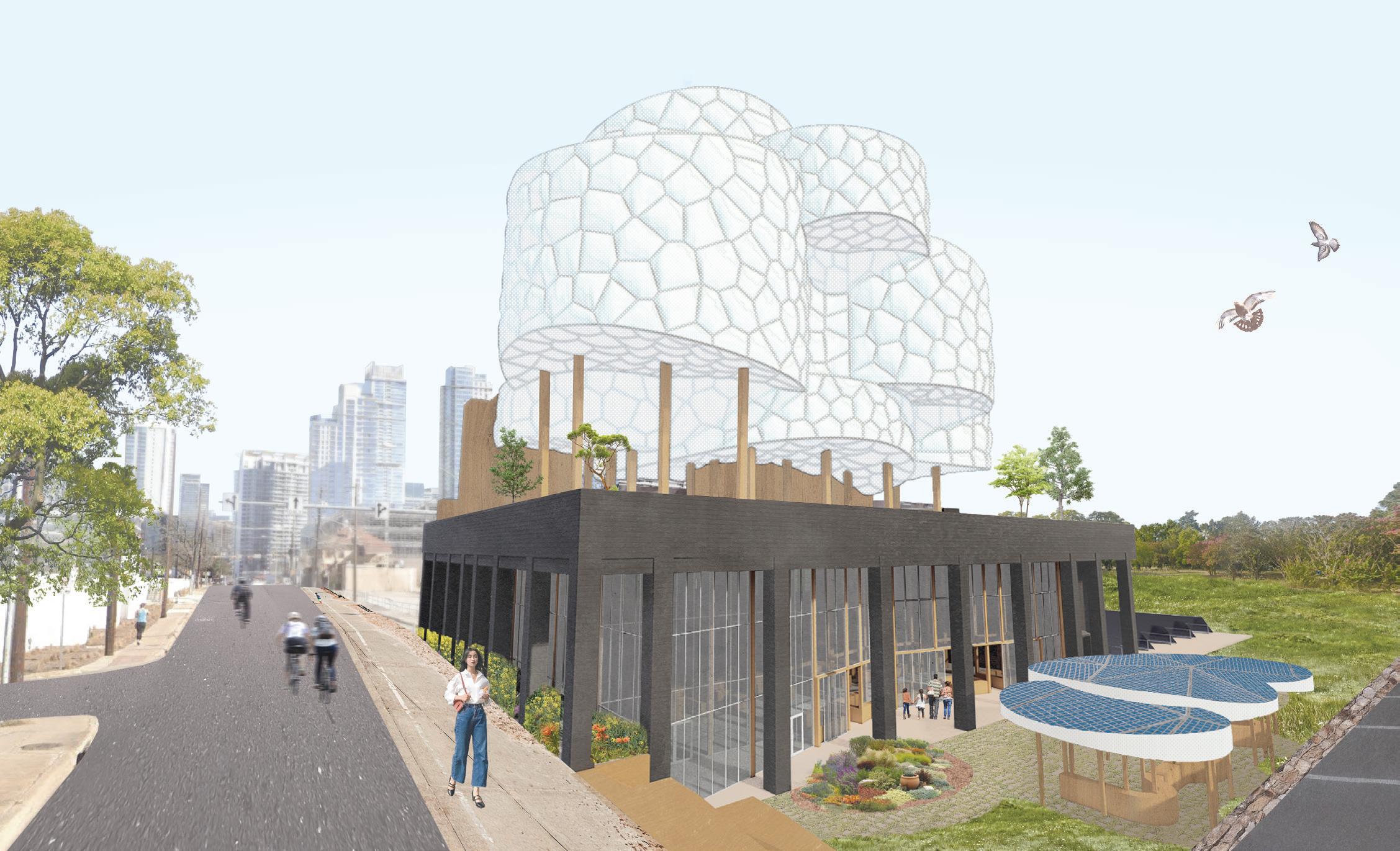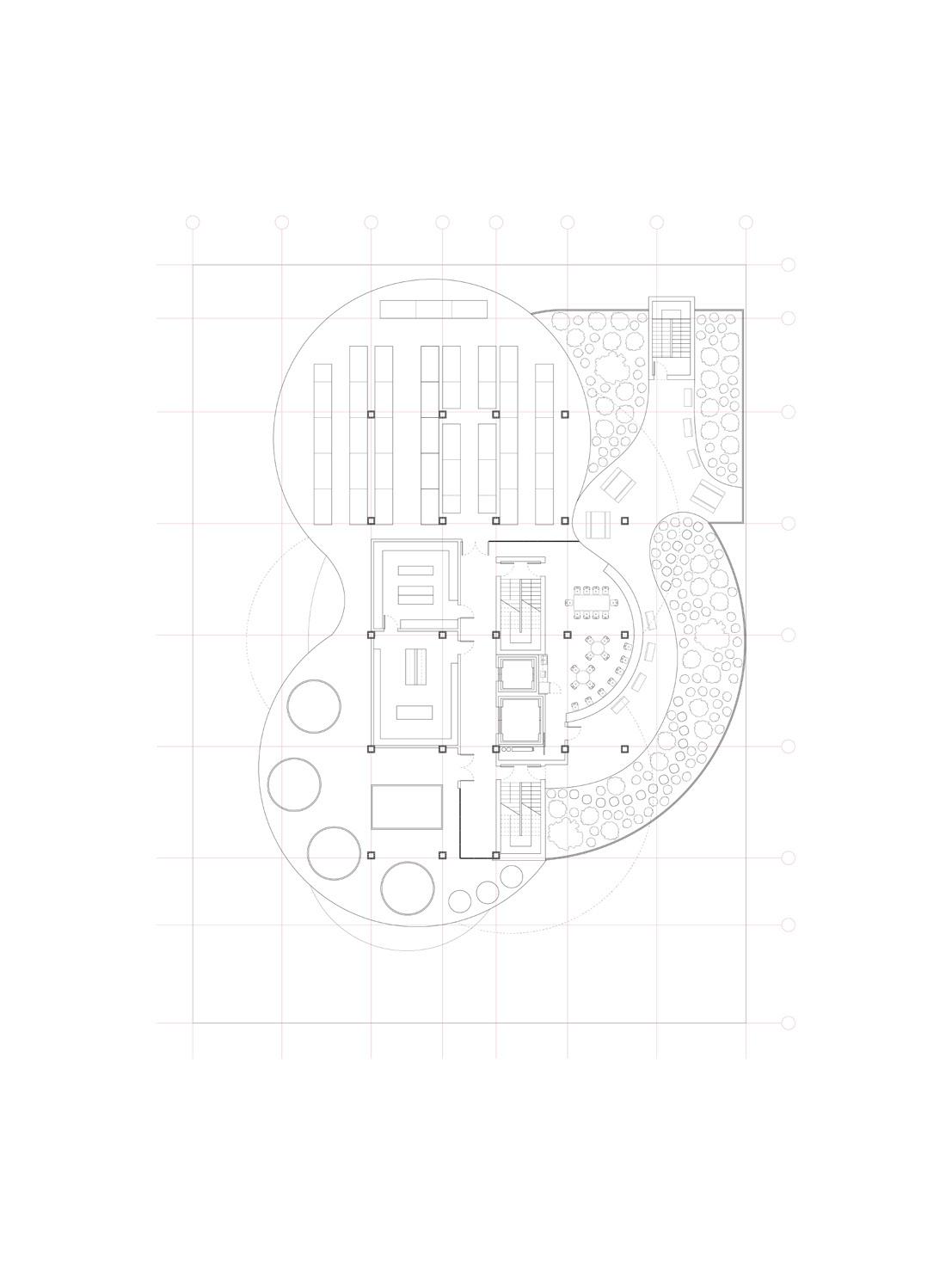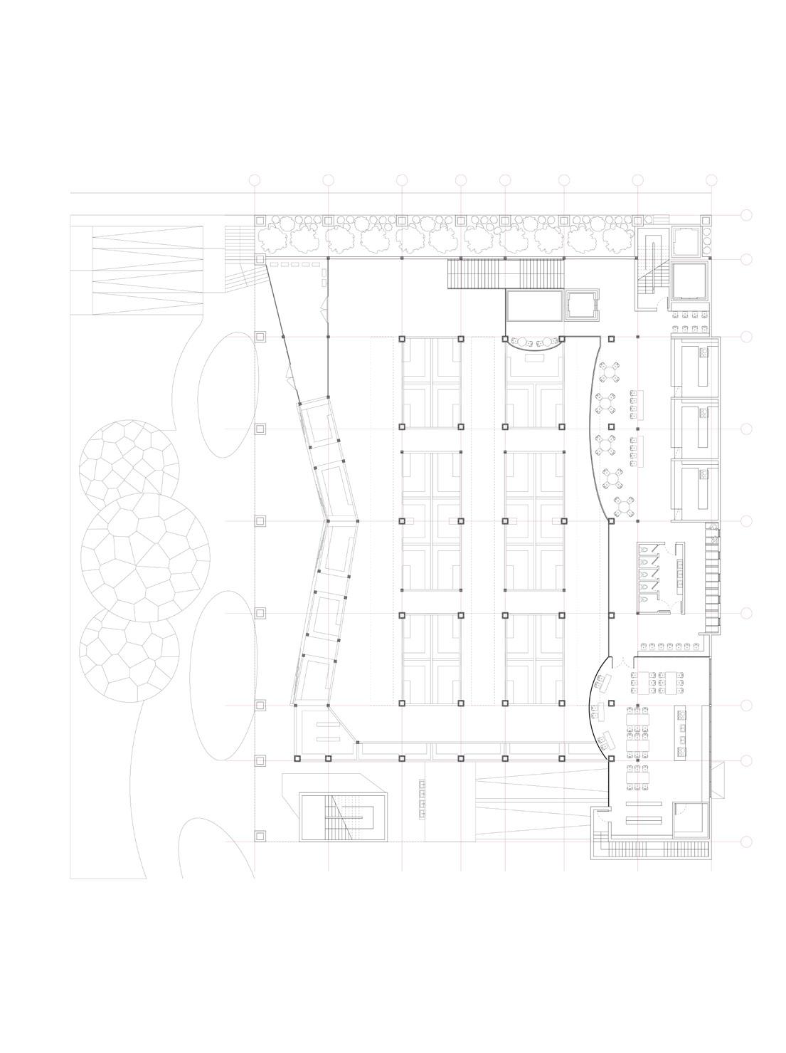 Visitors may enter from the street or up from the underground parking. The indoor market becomes the social hub with many vendors, and visitors are encouraged to visit the platform above to view the greenhouses up close. The green platform provides the basis for the complex and acts as a datum in relation to the objects above and below it, as well as being the most social area with a bar, stage, and tables for their leisure. In future phases, the platform will extend across the entirety of the site and draw visitors from the street, train, and nearby & proposed on-site residences.
