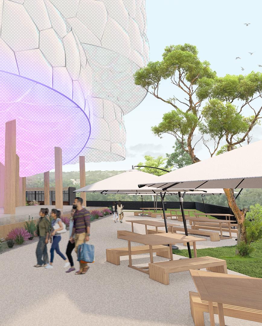 The Campfire bridges Downtown Austin to the river on a green platform that anchors a cluster of “floating” greenhouses above to an open-plan market below. Located between 5th Street and the Austin Western Railroad, the multi-tier complex provides fresh greens and fish to the public, a market for visitors to shop from local vendors, and green spaces for free-use recreation. Upon arrival, visitors have the option to descend into the market plaza or ascend onto the green deck. An aggregation of greenhouses are raised above the deck on glulam columns, with forms appearing to fuse into each other; their cushioned ETFE envelope gives them a sense of levity that contrasts with the visual weight of the platform. Also in contrast is the market beneath, its transparency displays the bustling interior and illuminates the space. It comprises two levels, an atrium with vendor stalls arranged in a grid on the ground level overlooked by the eatery and administration.