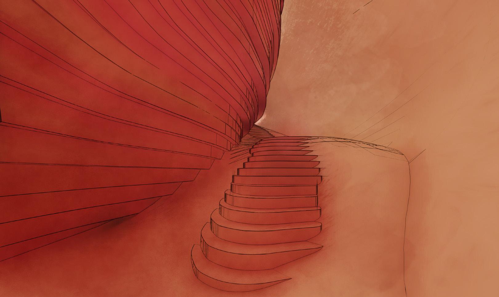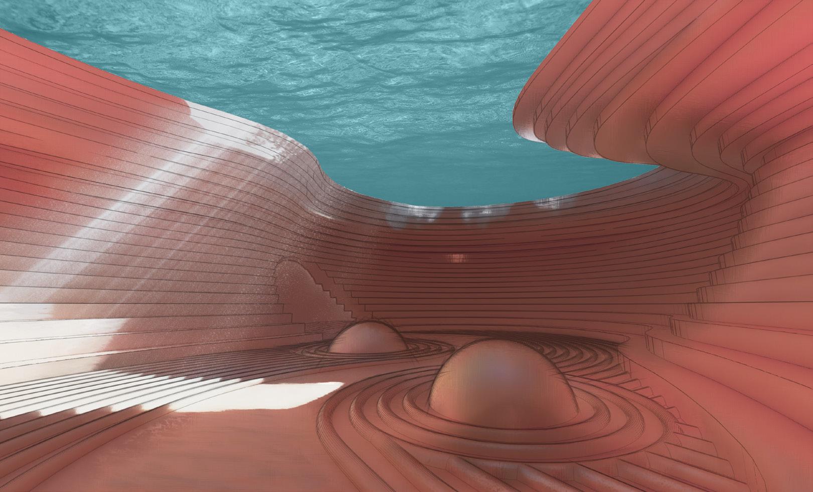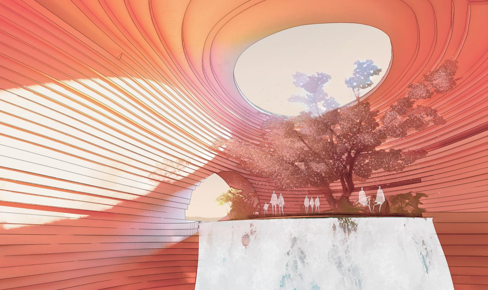 In a world where overpopulation has led to famine, thirst, and a global housing crisis, humans were obligated to evacuate Planet Earth in order to survive. The year is 2500, the centennial anniversary of the earthen colony on Mars. Underground, the colony thrives with a breathable atmosphere and groundwater, yet a longing arises among them to remember the world and the souls left behind. “Remembering Earth” takes visitors on a journey that mourns those lost, reflects on the lessons of the past, and celebrates life as it was. Visitors are welcomed by a zen garden, with dappled light filtering through the pool above, as if underwater. A stairway through the wall leads to the world above, around the reflection pool with access behind the cascade. A stair wrapping to the highest level guides visitors to an oasis with blossoming flora, a space to relax and rejoice. In the final space, a viewing event is held during the Mars Close approach, where Mars and Earth come nearest to each other in their orbits around the sun.