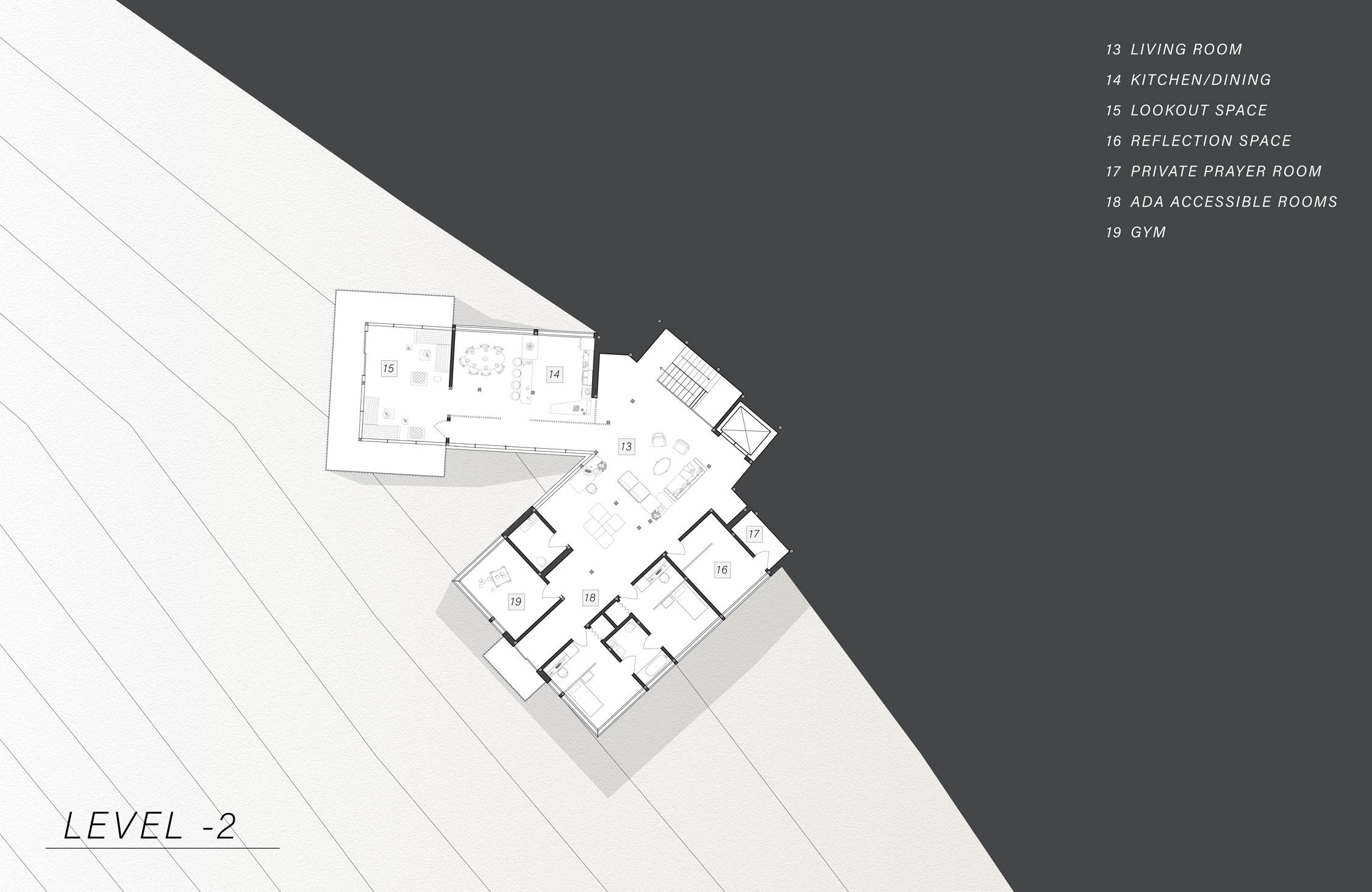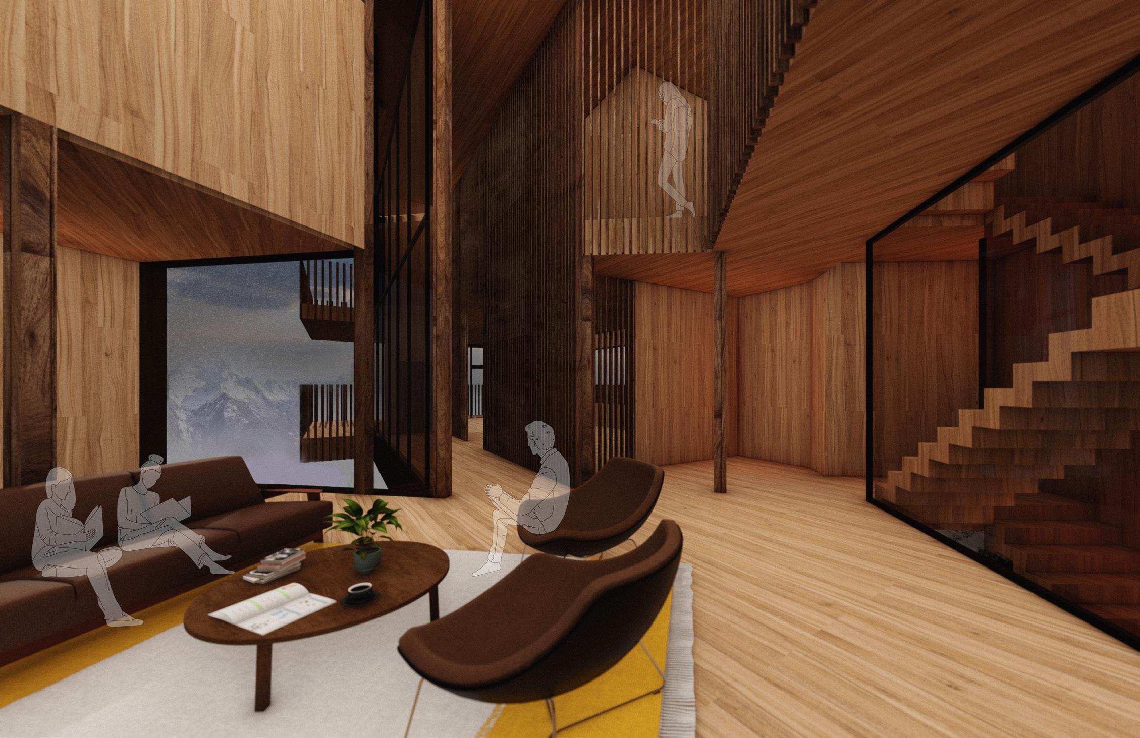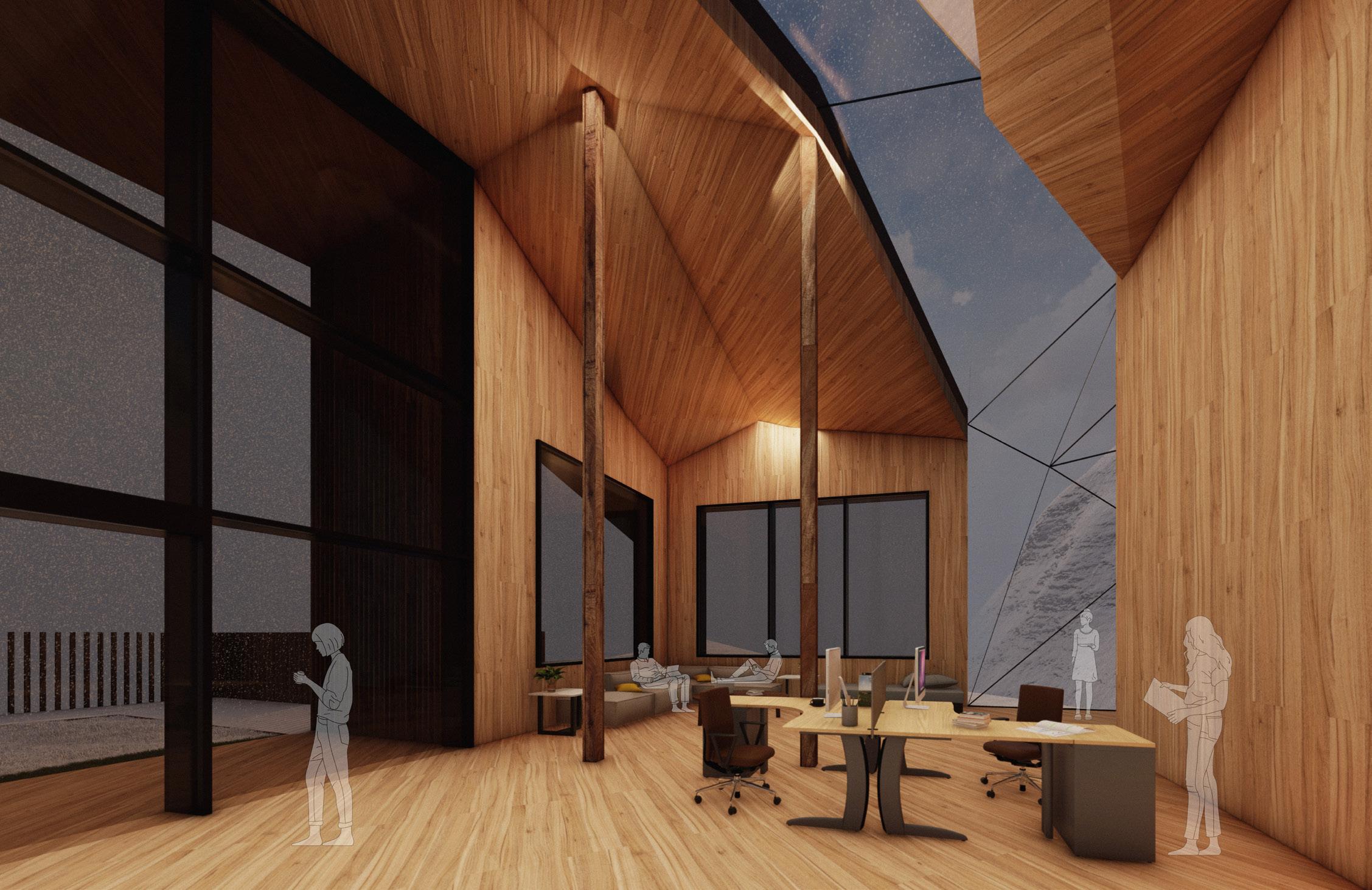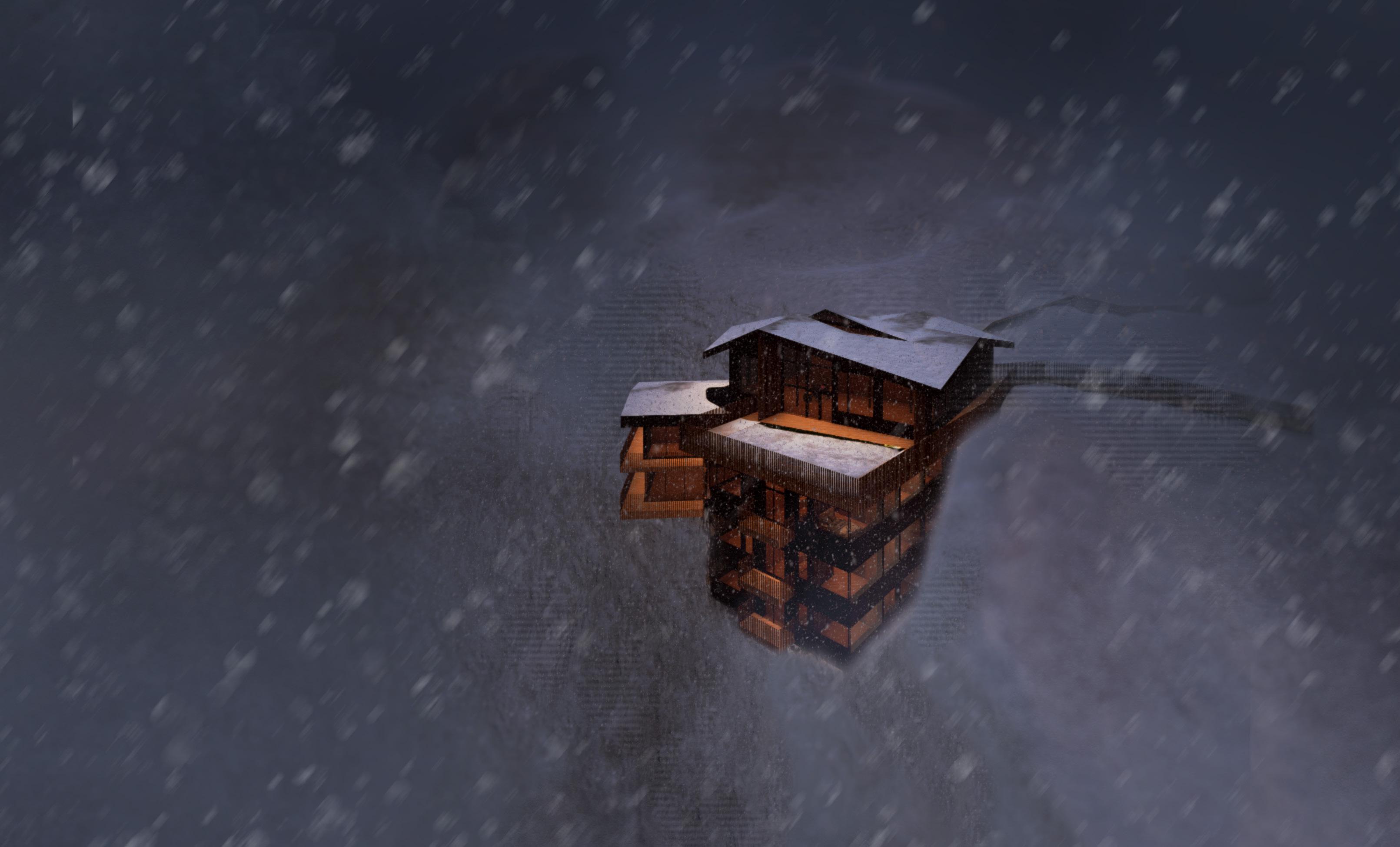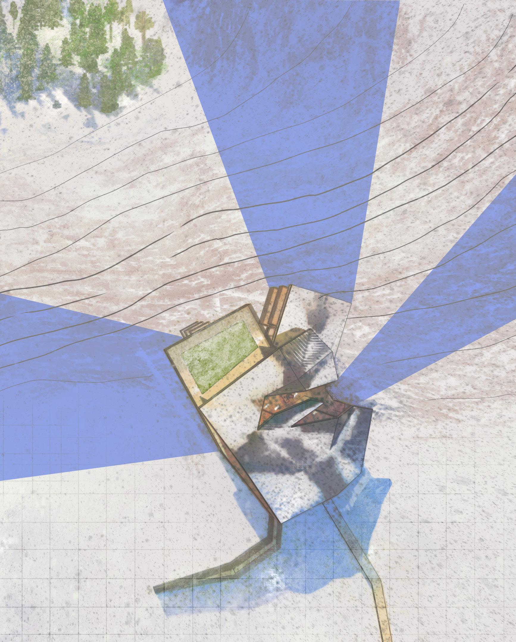 The Otzi Research Facility aims to provide researchers with warm & welcoming spaces for their work, social, & residence areas, maximizing views of the mountain scenery while giving the option to see or be seen. It is located near the border of Austria and Italy, near the site that Otzi the Iceman was discovered. Inspired by the ecology of the region, each program branches into prospect, refuge, or enclosed spaces, promoting community among the researchers while respecting their privacy. The Center provides the faculty with spaces sheltered from harsh conditions, as well as both interior and exterior viewing spaces to enjoy the scenery. The structure is nestled just below the peak of a steep mountain slope, which visitors enter from above into the studio, descend into the ground where the common area is located, then project from the mountain in order to view the valley below. A long deck wraps from the studio courtyard then around the center so that the researchers may fully experience the scenery.