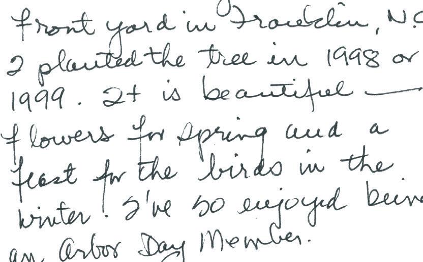 As a long-time member of the Arbor Day Foundation, I want to express my gratitude for the efforts of your organization to promote and defend trees on our planet. I have enclosed a picture of a magnolia x soulangeana I purchased from you in 2001 and planted as a tribute and living memorial to my mother. This is one of several memorial trees purchased from the Arbor Day Foundation and planted in memory of deceased family members and friends. It is lovely to be reminded of my loved ones by growing, thriving trees.