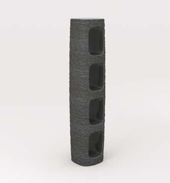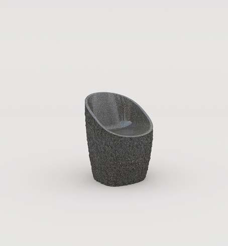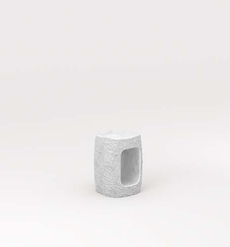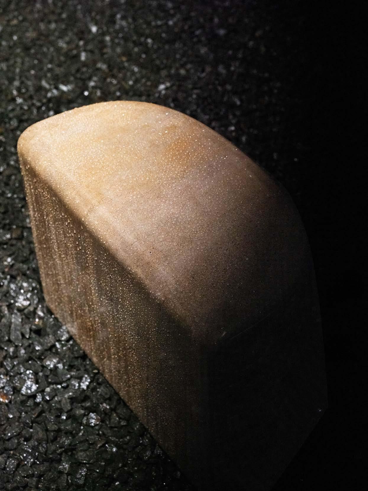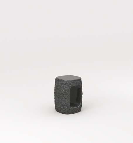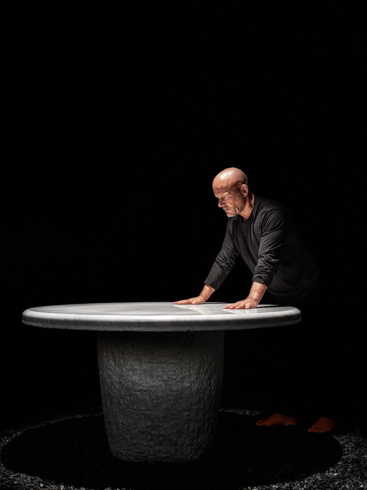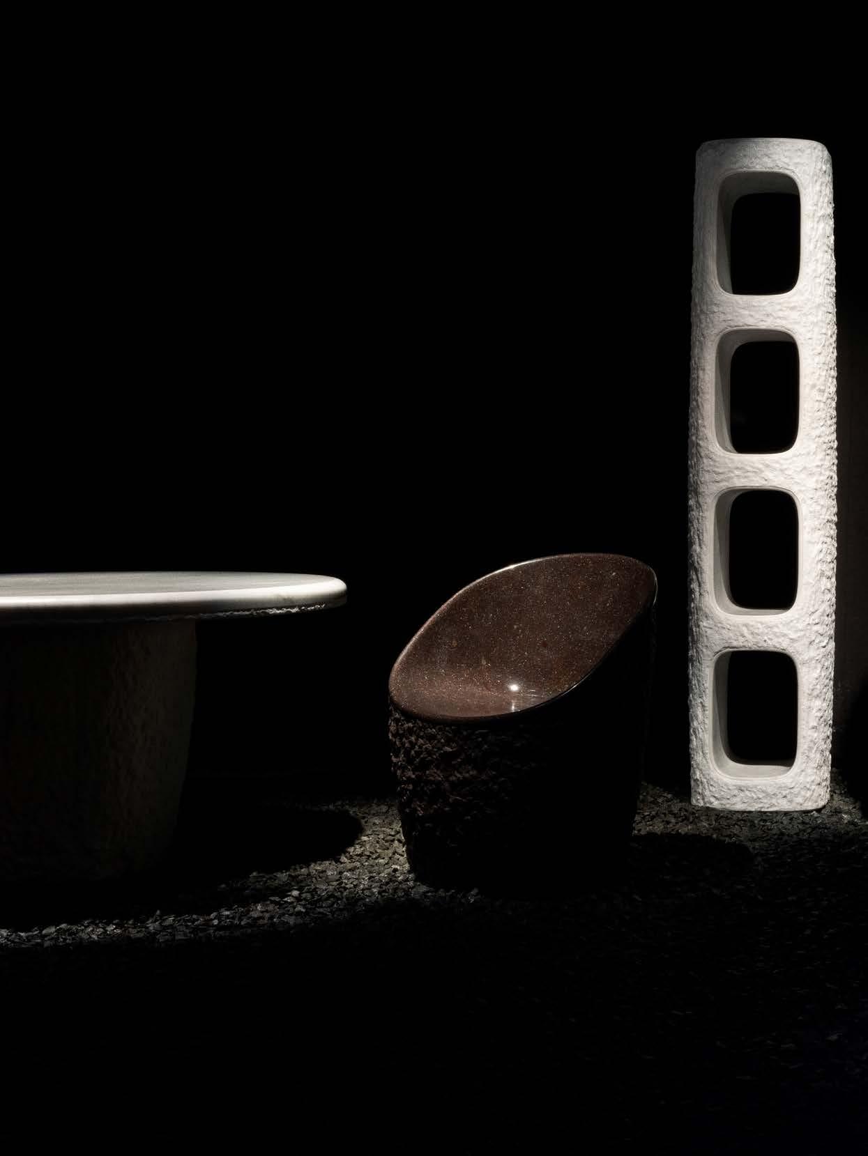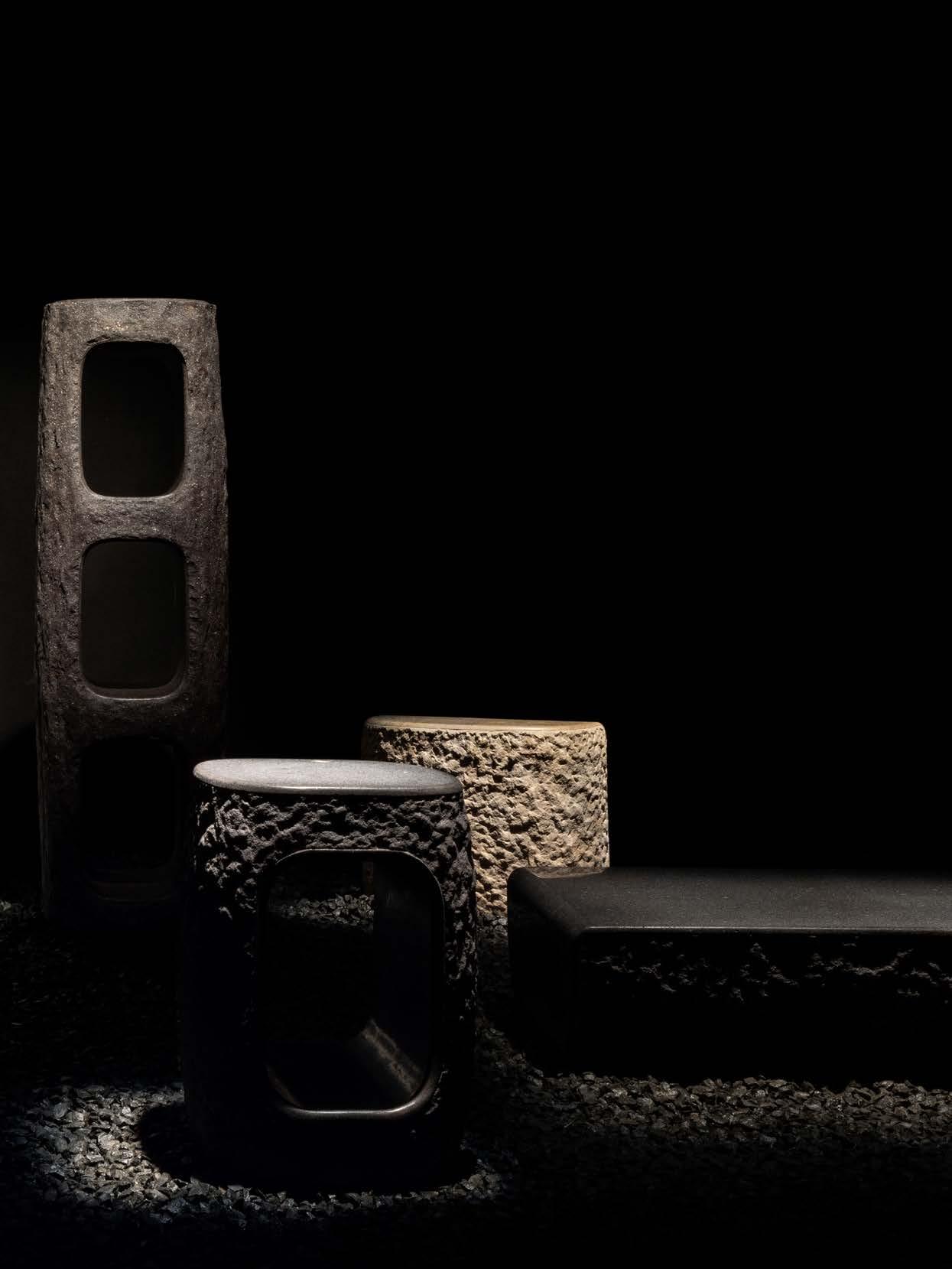 objects with a dialogue of textures and finishes. Working closely with ARCA enabled Van Duysen and his team to intimately understand the materials, an invaluable foundation for crafting such a collection. That duality extends seamlessly into the broader design narrative, where Vincent Van Duysen orchestrated a realm of captivating radical drama. The tactile allure of stone juxtaposed against black backgrounds and volcanic gravel flooring, create a powerful visual statement. This interplay between textures, natural elements, and human interaction becomes the core of the collaboration concept.