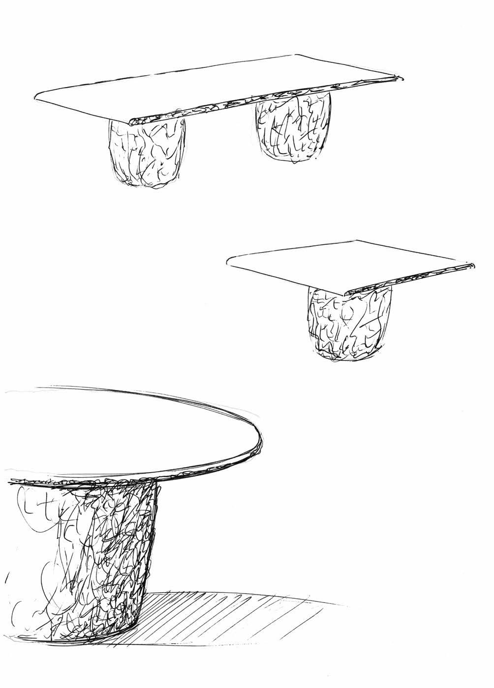 Early sketches by Vincent Van Duysen, depicting the initial concepts for the round, square, and rectangular dining table designs.