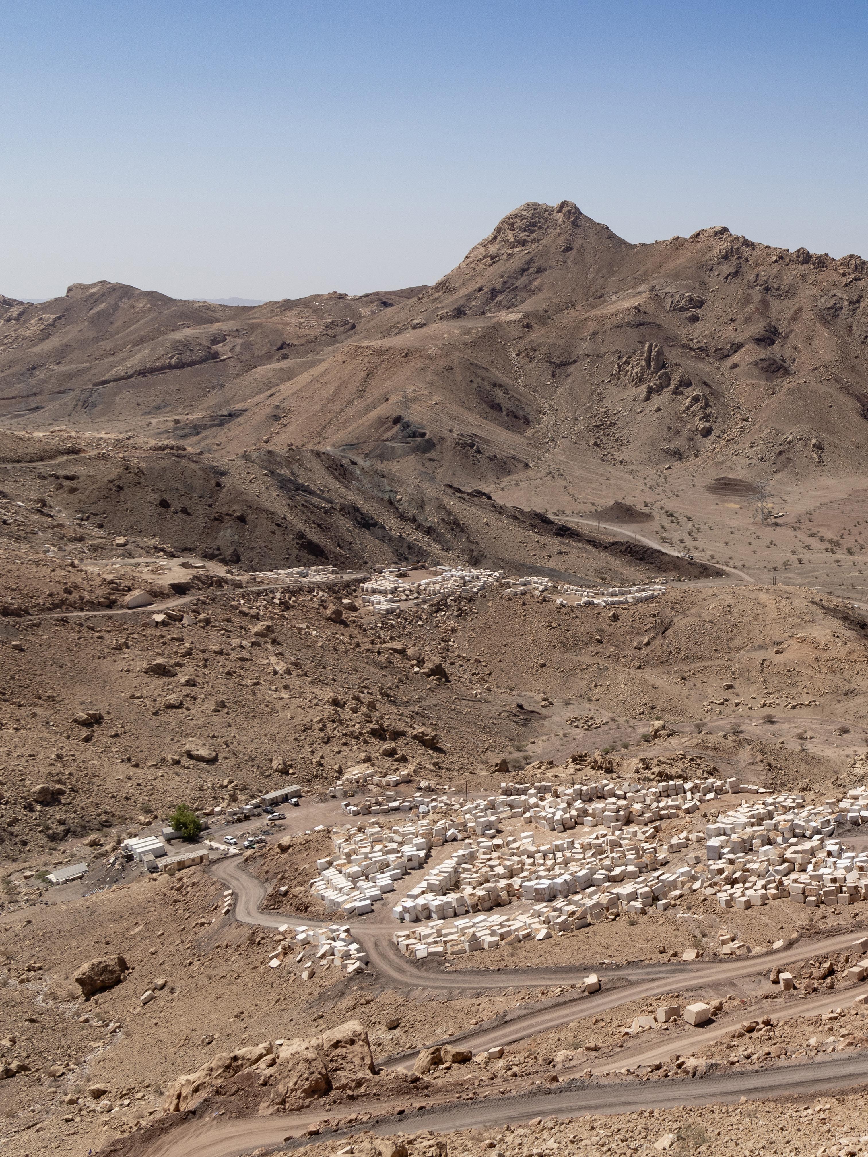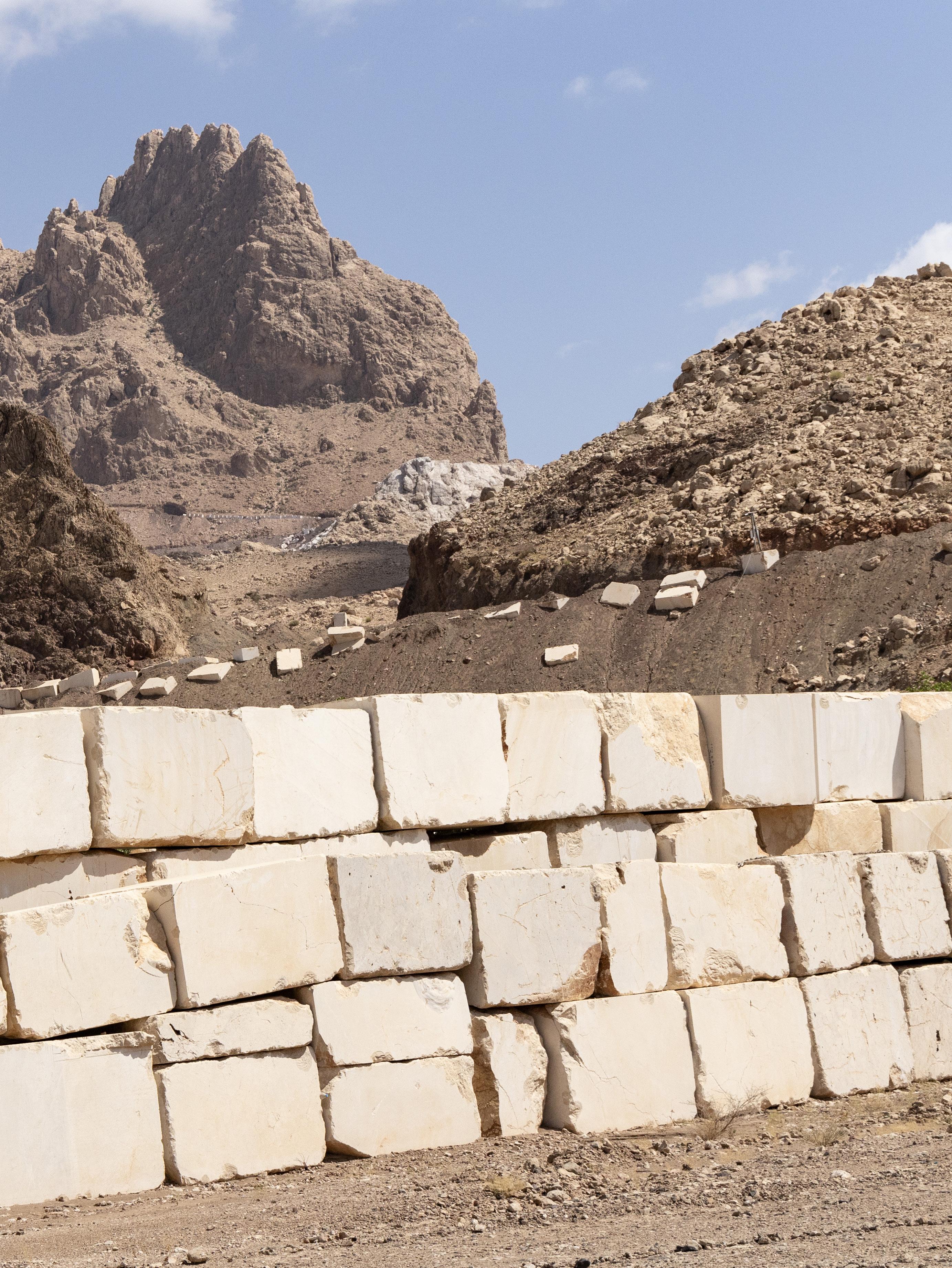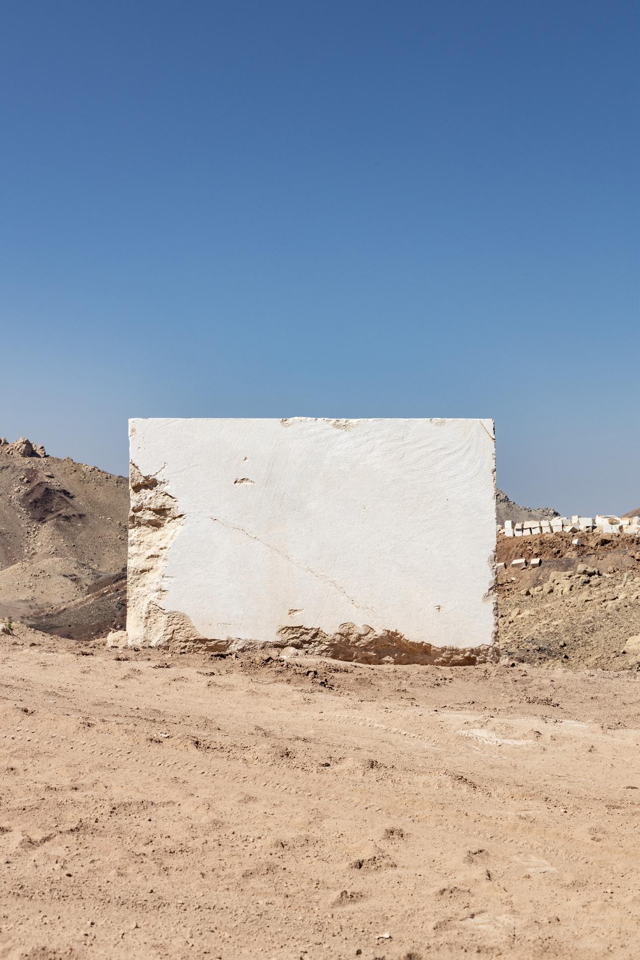 Surrounded by a desert landscape, the mountains where the marble is extracted, present an impressive visual contrast between the rugged terrain and the serene beauty of the stone, showcasing the purity and quality of the natural stone .