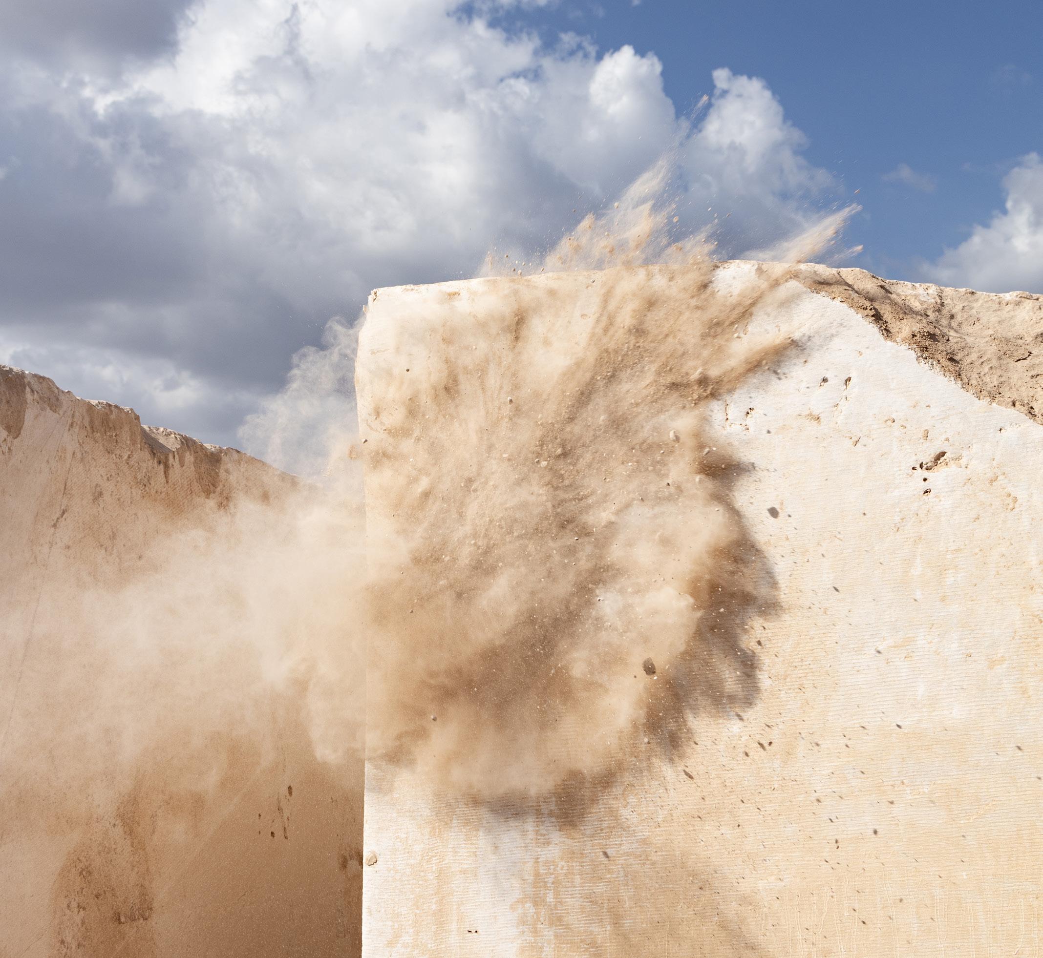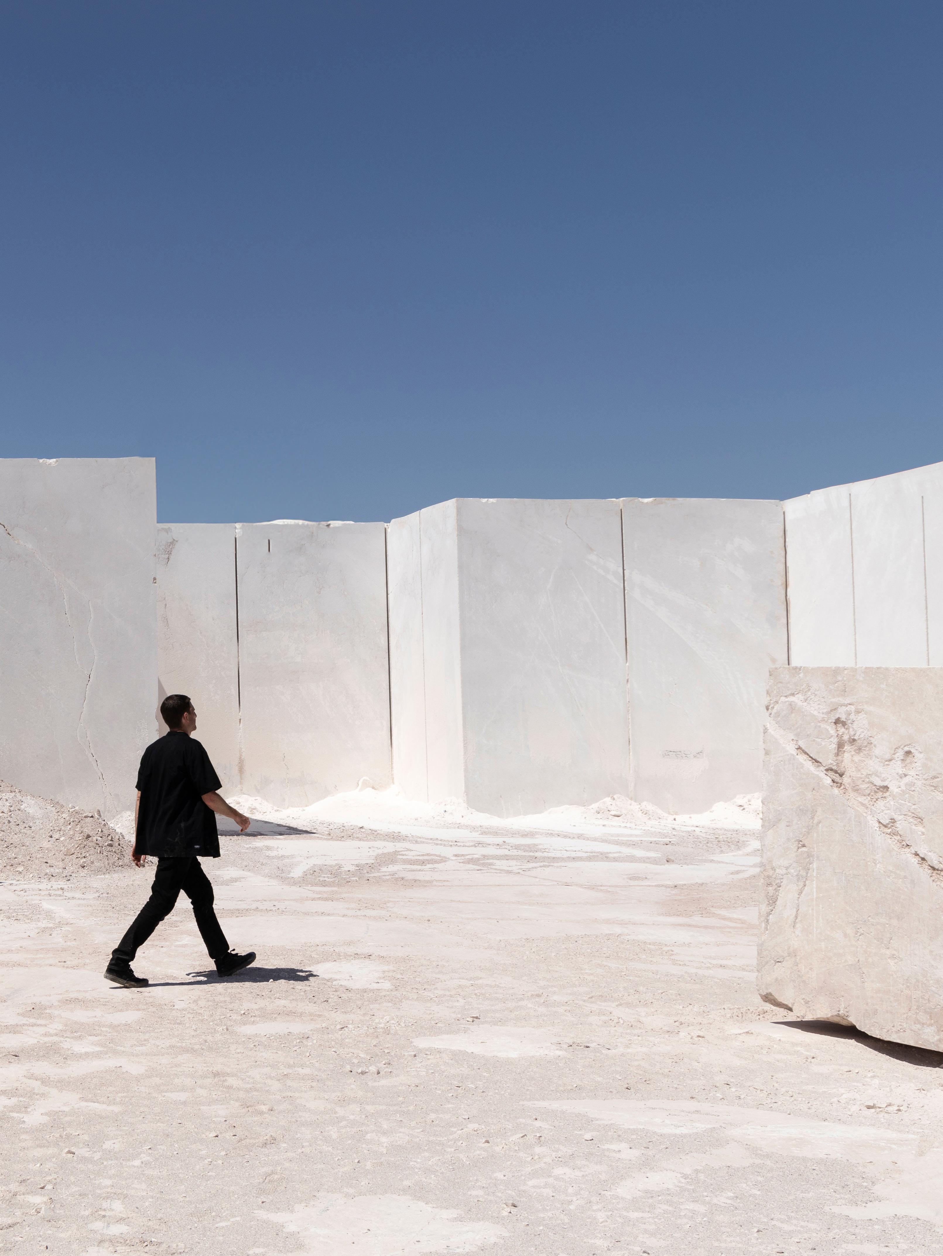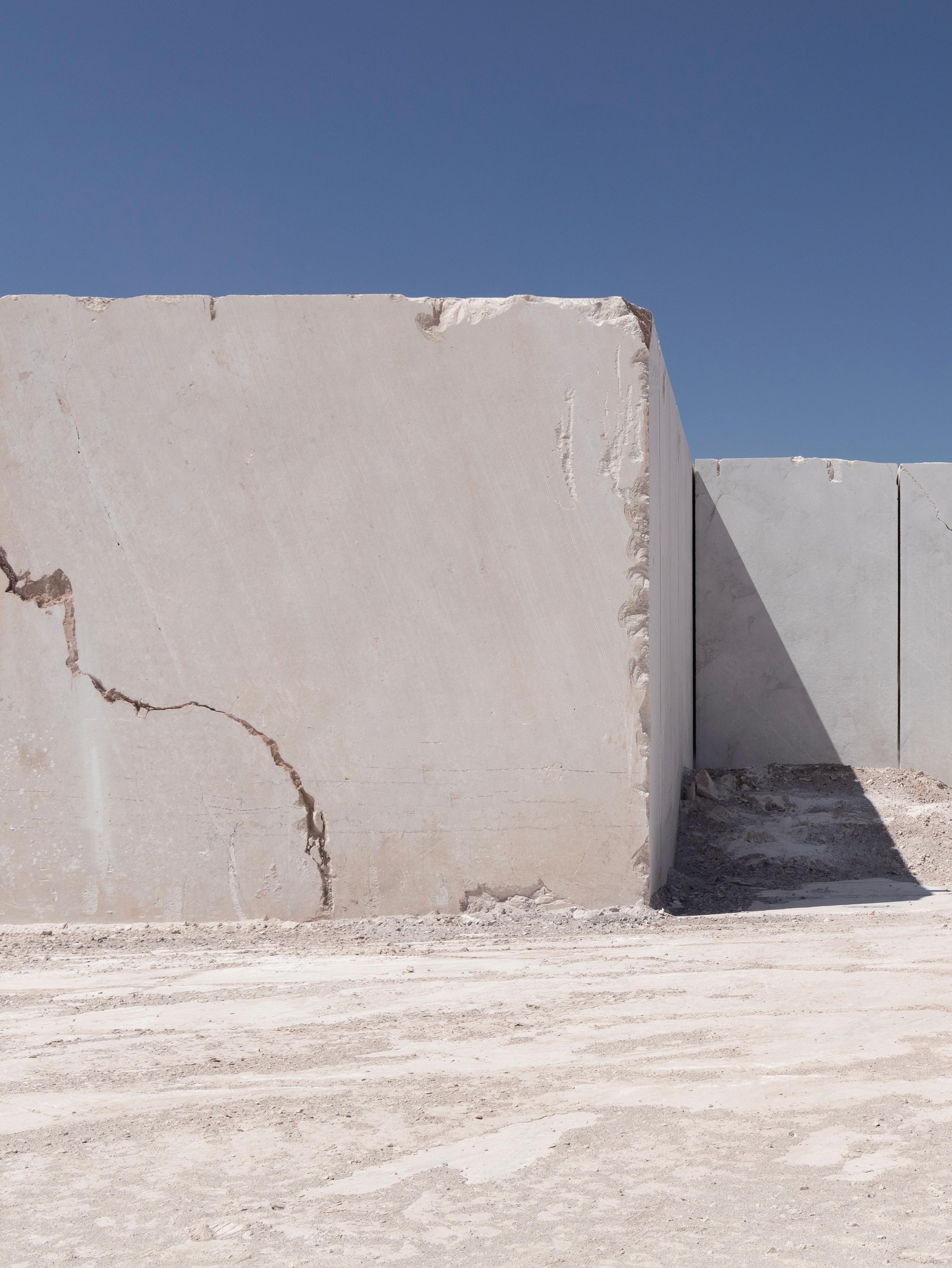 Surrounded by a desert landscape, the mountains where the marble is extracted, present an impressive visual contrast between the rugged terrain and the serene beauty of the stone, showcasing the purity and quality of the natural stone .