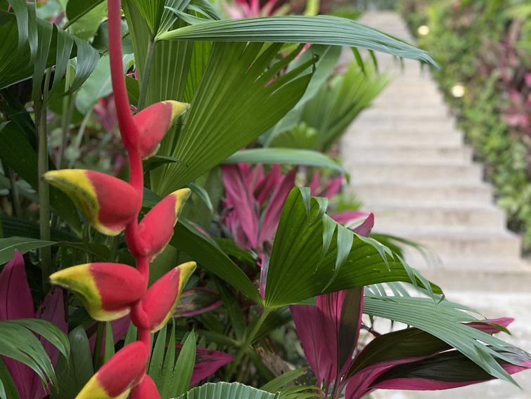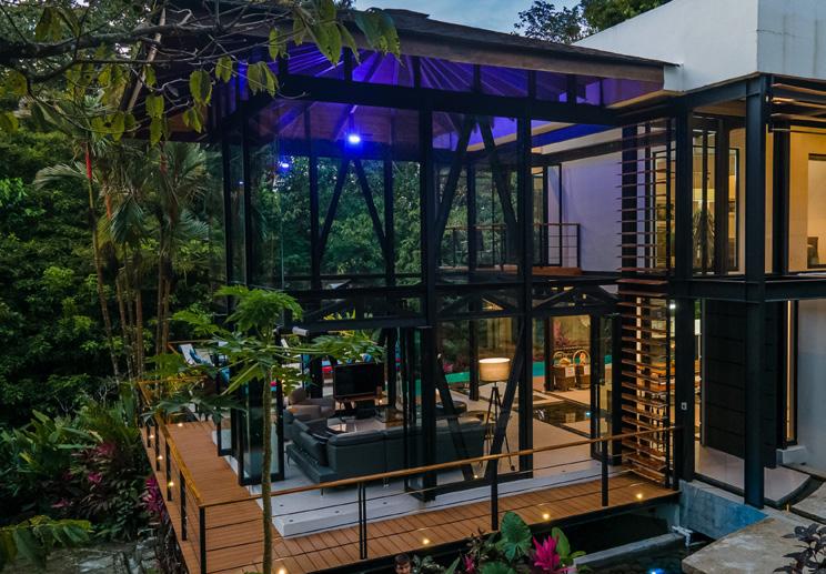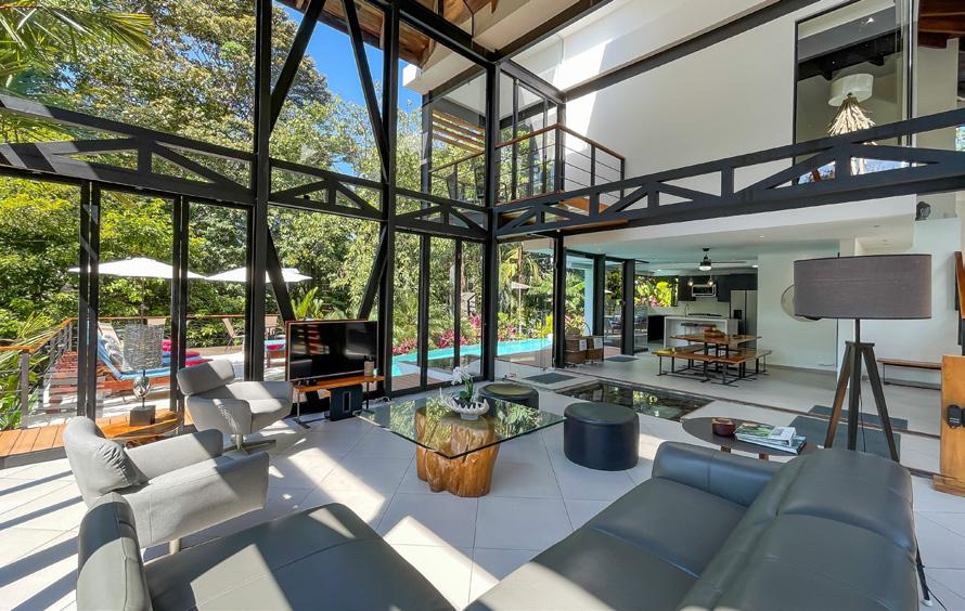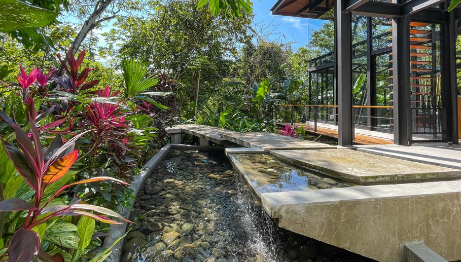 The modern villa offers 6,000 sq feet of seamless indoor-outdoor living, blurring the division between the luxurious interior and the tropical outdoor environs . An indoor water feature flows into the infinity pool that appears to spill right into the lush forest