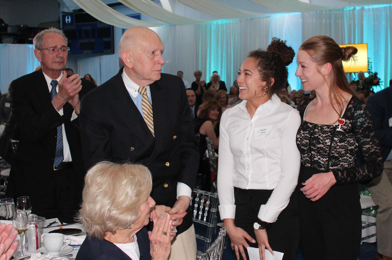 During Extravaganza 2019, Mariah Carter ’19 and her mother, Nina Volpe, thank Mr. Bernard and the Bernard Founation for providing Mariah’s scholarship, allowing her to receive a Hoban education.