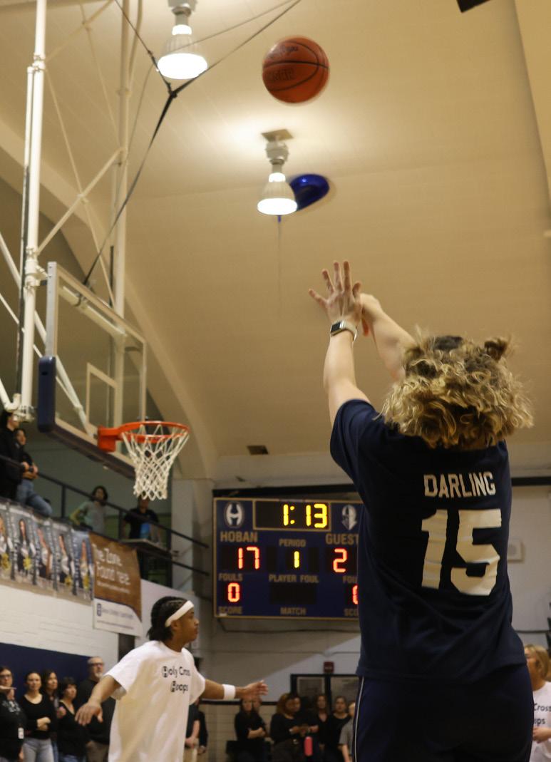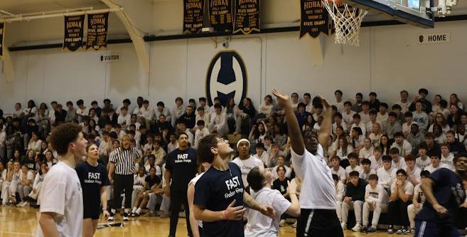 Students and faculty crowd the basket and fight for the rebound. Both teams continuously gave their best effort to raise the score and defend their sides of the court.