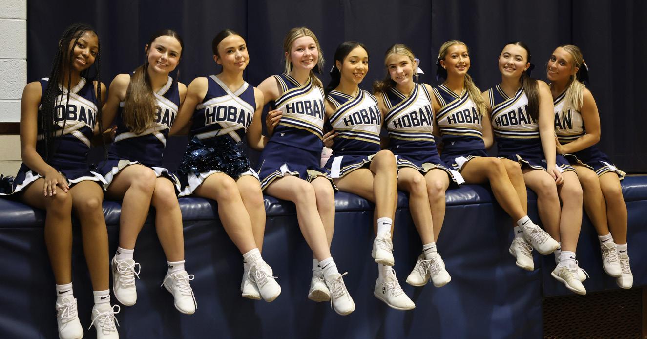 Hoban’s Cheer Squad poses for a picture during the annual Holy Cross Hoops game. These ladies brought the energy to the room for students on and off the court.