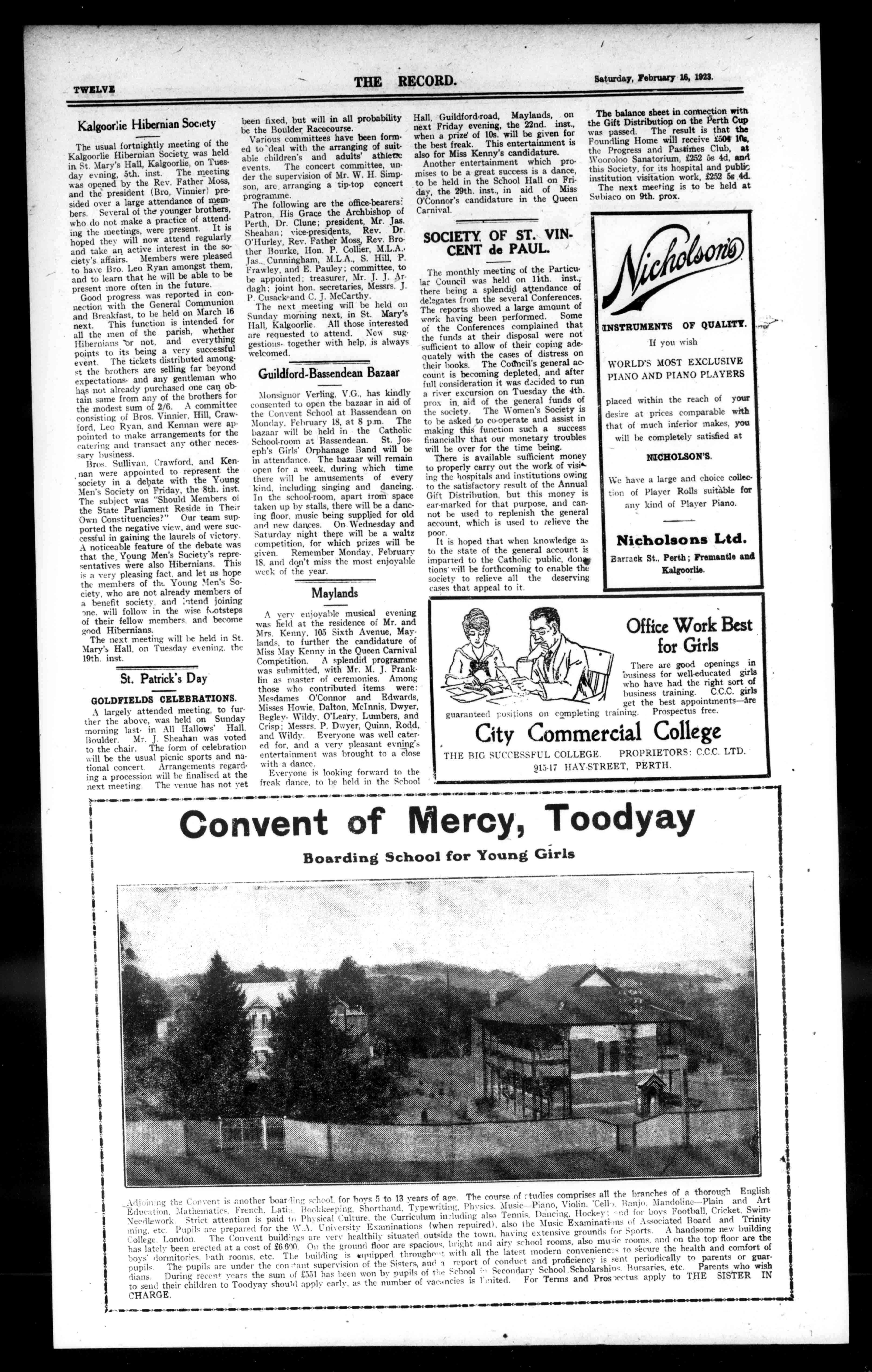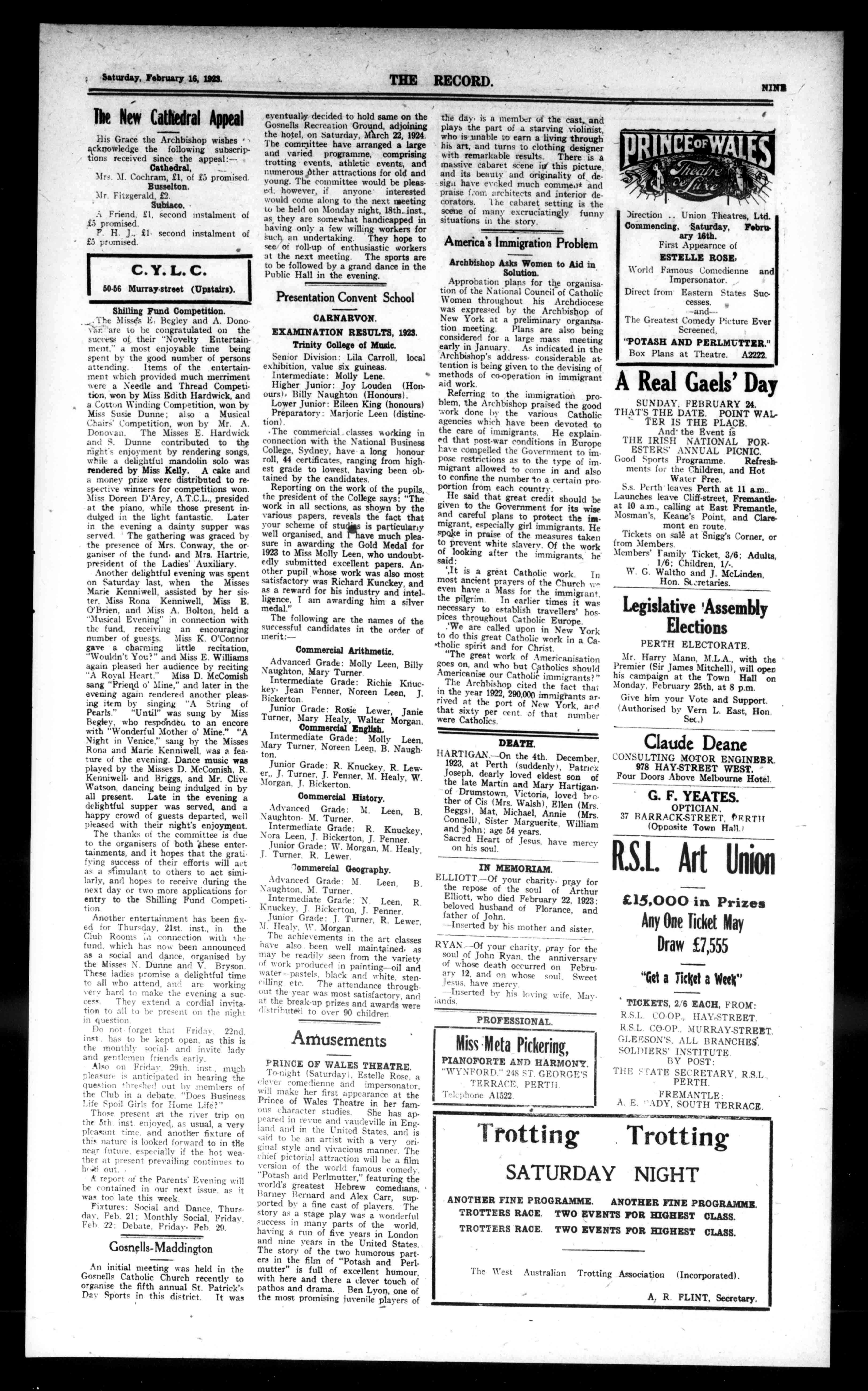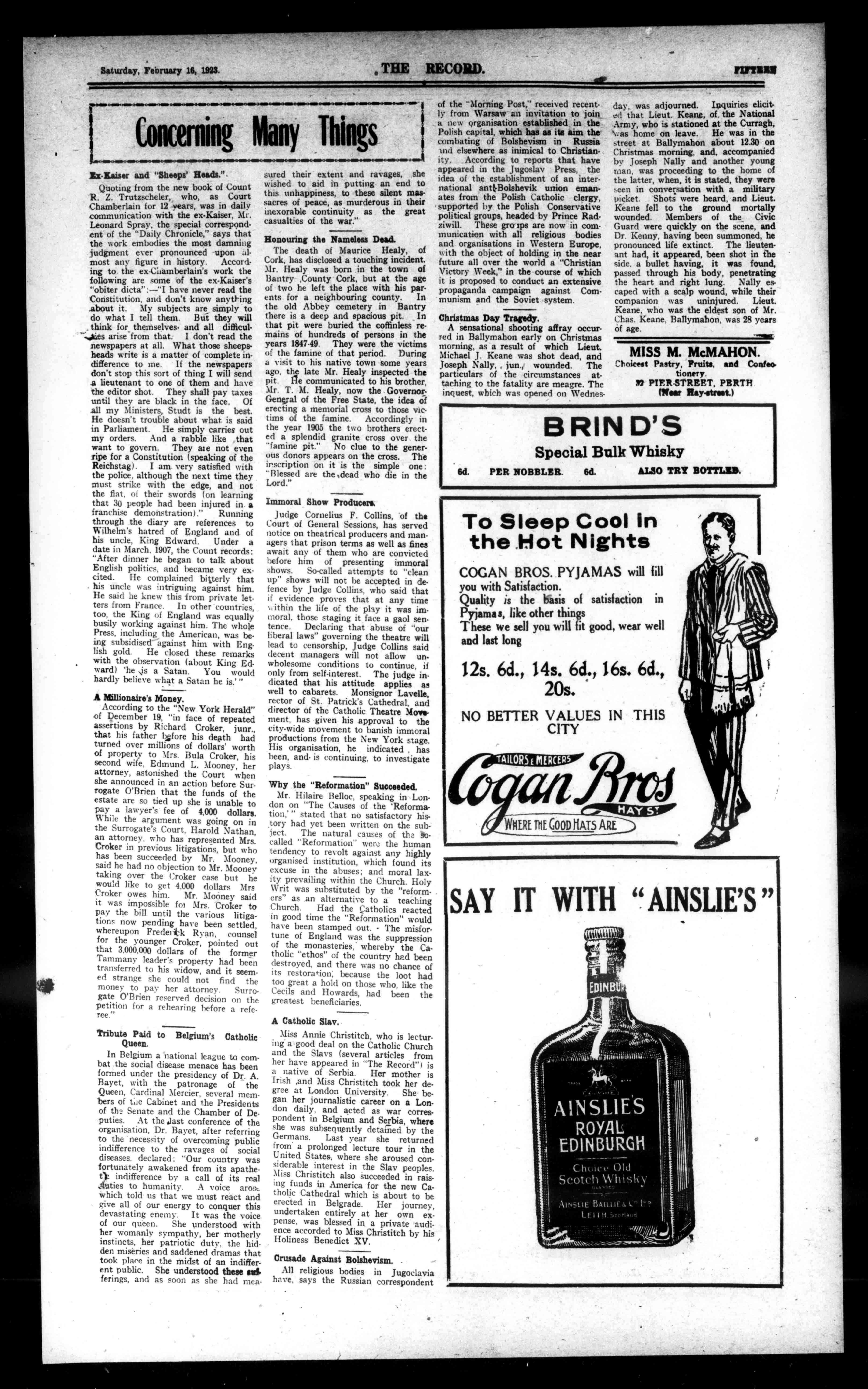 /fa PUBLISHEDWEEKLY. ESTABLISHED1874. 'PhoneA5447 PRICETHREZPElfOL orriorat.ORGANOFTHEARCHDIOCESEOFPERTH,WESTERNAUSTRALIA. RegisteredattheG.P.O.,Perth,forTransmissionbyPostasaNewspaper. NO.2,167. PERTH,SATURDAY, FEBRUARY16,1923. VOLUMEXIXIL Chris.McCarthy LARGESTMOTORCARPAINT WORKSIN.W.A. 107FITZGERALDSTREET (NearNewcastleStreet,. PhoneA1219. EltctricalContractors ANDMOTOREXPERTS. LH.DEAGUEand00..LTD. CORNERPIERANDHAY-STS. SpecialinElectricalHestia;Devices 'Phones:Day,A1786;Private.A4710. CashButcher---JIMWADDELL CORNERGEORGEANDMURRAYSTREETS,WESTPERTH. M.J.Spruhan FAMILYBUTCHER. 233HAYSTREETEAST (NearBennett-street). CornedBeefandSausagesaSpecialty. FamiliesWaitedonforOrders. TelephoneA4770. ee. Di1109411andBondord BAKERSANDPASTRYCOOKS. 1st.and3rd.AwardsRoyalAgriculturalShow. 157VINCENT-ST.,NORTHPERTH, and HAY-STREET,SUBIACO. TelephoneA3330. SubiacoHotel FIRSTCLASSACCOMMODATION. 'PhoneA3928. J.(Snowy)HAMILTON, Proprietor. MOTORFORHIRE. NIGHTOltDAY. SAMJONES 15RAGLAN4OAD,NTH.PERTH. RailwayRank'PhoneA1910. Private'PhoneA1763. colognefaceCream (NONGREASY). FORROUGHSKINS.1/6JAR. CRAVEN'SPHARMACY, 137BARRACK-STREET, CHEMISTSANDOPTICIANS. 'PhoneA3092. M.J.O'KEEFE--Butcher,245Carr-st.,Leederville. PrimeBeef,Mutton,Pork,Lambalwaysonhand.CornedBeefandSmall GoodsaSpeciality.AllMeatkeptin CoolStorageonPremises.Tel.A3297 CRAWFORD'S RedStar ScotchWhisky SoleAgent:L.DOYLE, BAZAARTERRACE. PERROTT&TITE PAINTINGCONTRAOT 4784. 38CHAPMA H. AllWorkExecutedUnderPer-\ Contractorsto onvents, sonalSupervision. CollegesandSchools. Established1897. 'PhoneA1655. MECATHOLICARTANDBOOKDEPOT. NEXTCELTICCLUB. M.J.McDERMOTT. SpecialNewBooksbytheMaiis,AltarCharts,SanctuaryOils,Incense, Charcoal.Wicks,Tapers,PrayerBooksfrom4dto15/-.PureWaxCandles Statuary. IrishHornRosariesMotherofPearl.Weprocureandpostout.Lit- erature,AveMaria,SacredHeart'Messenger,AnnalsofOurLady,St. Joseph'sGarland,CatholicPress,TheRecord,"Advocate,DublinFreeman. Wesupplynglish,AmericanandIrishLiterature. JOHNDYNON&CO,TheChinaHall, 915-917HayStreetPerth ALLKINDSOFCHINAANDGLASSWAREHAVEJUSTARRIVED. ACHOICESELECTIONOFREALIRISHCHINA.MADEATTHE FAMOUSBELLEEKPOTTERY. BELLEEKCHINAMAKESANIDEALPRESENT. Tel.A4270 PRICESMOSTREASONABLE. INSPECTIONINVITED. Dudley&Dwyer PROPERTYAGENTS,BUILDERS.SWORNVALUATORS. ECONOMICCHAMBERS,CORNERWILLIAMandHAYSTREETS. HOUSESFORSALE,CITYANDSUBURBS,ONTERMS:RENTS COLLECTED.MONEYTOLEND.ESTABLISHED1912.Tel.A337t. AGENTS'FORCOLONIALMUTUALINSURANCECO..LTD. HIGHGRADESHOES. TOBEHADAT TheJ.J.BendonShoeStores 130HIGH-STREET,FREMANTLE(MajesticOpp.) 'PhoneB425. CONSULTINGOPHTHALMIC -OpticianD.MENUCHIN BRENNAN'SARCADE,PERTH. PerfectSatisfactionGUARANTEED. CONSULTATIONFREE.
