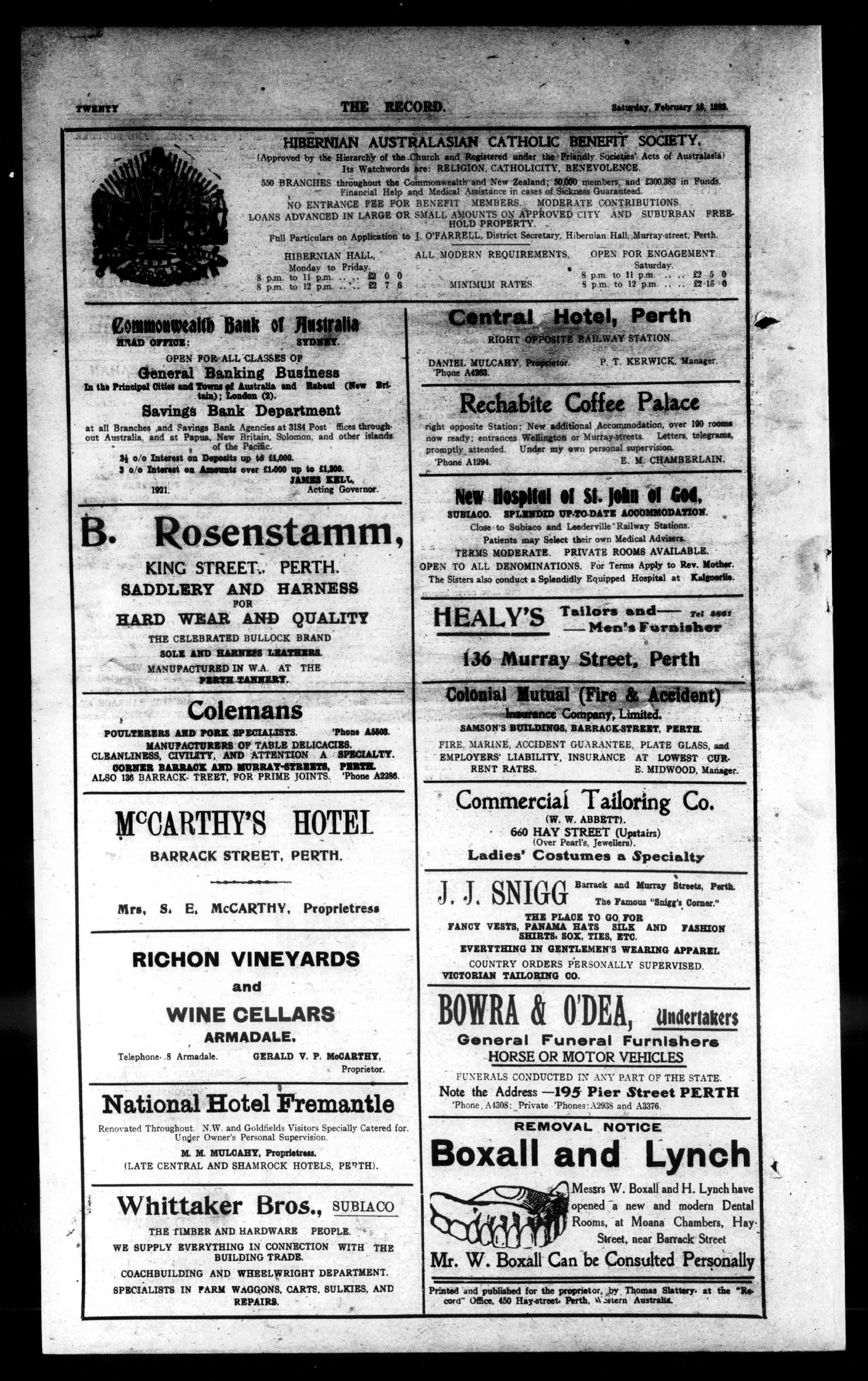 I TWENTY THERECORD. Saturday,February1$,Ma. HIBERNIANAUSTRALASIANCATHOLICBENEFITSOCIETY. (ApprovedbytheHierarchyoftheChurchandRegisteredundertheFriendlySocieties'ActsofAustralasia) ItsWatchwordsare:RELIGION,CATHOLICITY,BENEVOLENCE. 550BRANCHESthroughouttheCoinmonwealthandNewZealand;50,000members,and£300,383inFunds. - FinancialHelpandMedicalAssistanceincasesofSicknessGuaranteed. NOENTRANCEFEE FOR BENEFIT MEMBERS. MODERATE CONTRIBUTIONS. LOANSADVANCEDINLARGEORSMALLAMOUNTSONAPPROVEDCITY AND SUBURBAN FREE- HOLDPROPERTY. FullParticularsonApplicationtoJ.O'FARRELL,DistrictSecretary,HibernianHall.Murray-street,Perth, HIBERNIANHALL, MondaytoFriday.8p.m.tollpsn. £200 8p.m.to12p.m. £276 ALLMODERNREQUIREMENTS, OPENFORENGAGEMENT. Saturday. 8p.m.to11p.m. £250 MINIMUM RATES. 3 p.m.to12p.m. £2150 ConisoltvealtbBankofRistralia BRADOFFICE: SYDNItY. ,OPENFOR.ALLCLASSESOF GeneralBankingBusiness InthePrincipalCitiesandTownspiAustraliaandRabaul(NewBritabs);London(2). SavingsBankDepartment atallBranches,andSavingsBankAgenciesat3184PostfficesthroughoutAustralia.andatPapua,NewBritain,Solomon,andotherislands ofthePacific. 34oloInterestonDepositsupt4 3o,'oInterestonAmountsover£1000upto£1,300. JAMESKILL, 1921. ActingGovernor. B.Rosenstamm, KINGSTREET.,PERTH. SADDLERYANDHARNESS FOR HARDWEARANDQUALITY THECELEBRATEDBULLOCKBRAND SOLEANDBARNUMLEATNERS. MANUFACTUREDINW.A.ATTHE PSI=TANNERY. Colemans POULTERERSANDPORKSPECIALISTS. 'PhoneA5603. MANUFACTURERSOFTABLEDELICACIES. CLEANLINESS,CIVILITY,ANDATTENTIONASPECIALTY. CORNERBARRACKANDHURRAY-ETREITS,PERM ALSO136BARRACK-TREET,FORPRIMEJOINTS.'PhoneA2286. WCARTHY'SHOTEL BARRACKSTREET,PERTH. Mrs,S.E,McCARTI-IY,Proprietress RICHONVINEYARDS and WINECELLARS ARMADALE. Telephone.8Armadale. GERALDV.P.MoCARTHY, Proprietor. NationalHoteli'remantle RenovatedThroughout.N.W.andGoldfieldsVisitorsSpeciallyCateredfor. UnderOwner'sPersonalSupervision. M.M.MULCAHY,Proprietress. (LATECENTRALANDSHAMROCKHOTELS,PE!TH). WhittakerBros.,sumAco THETIMBERANDHARDWAREPEOPLE. WESUPPLYEVERYTHINGINCONNECTIONWITHTHE BUILDINGTRADE. COACHBUILDINGANDWHEELWRIGHTDEPARTMENT. SPECIALISTSINFARMWAGGONS,CARTS,SULKIES,AND REPAIRS. C4Intrakdote1,Perth RIGHTOPPOSITERAILWAYSTATION. DANIEL.MULCAHY,Proygletor. P.T.KERWICK,Manager. 'PhoneA4263. RechabiteCoffeePalace rightoppositeStation;NewadditionalAccommodation,over100roma nowready;entrancesWellingtonorMurray-streets.Letters,telegrams, promptly.attended.Undermyownpersonalsupervision. 'PhoneA1294. E.M.CHAMBERLAIN. NtivIlospitilelSt.JellIfGot, SUBIACO.SPLENDIDUP-TO-DATEADOOMMODATION. ClosetoSubiacoandLeedervilleRailwayStations. PatientsmaySelecttheirownMedicalAdvisers. TERMSMODERATE.PRIVATEROOMSAVAILABLE. OPENTOALLDENOMINATIONS.ForTermsApplytoRev.Mother. TheSistersalsoconductaSplendidlyEquippedHospitalatKalgoorlie. HEALY'STailorsand TelSW -Men'sFurnisher 136MurrayStreet,Perth ColonialMutual(Fire&Accident) lasaranceCompany,Limited. SAMSON'SBUILDINGS,BARRACK-STREET,PERTH. FIRE,MARINE,ACCIDENTGUARANTEE,PLATEGLASS,and EMPLOYERS'LIABILITY,INSURANCEATLOWESTCURRENTRATES. E.MIDWOOD,Manager. CommercialTailoringCo. (W.W.ABBETT). - 660HAYSTREET(Upstairs) (OverPearl's,Jewellers).Ladies'CostumesaSpecialty J.SNIGGBarrackandMurrayStreets,Perth. TheFamous'Salim'sCorner." THEPLACETOGOFOR FANCYVESTS,PANAMAHATSSILKANDFASHION SHIRTS.SOX,TIES,ETC. EVERYTHINGINGENTLEMEN'SWEARINGAPPAREL COUNTRYORDERSPERSONALLYSUPERVISED. VICTORIANTAILORINGCO. BOWRA&O'DEAJUndertakers GeneralFuneralFurnishers HORSEORMOTORVEHICLES FUNERALSCONDUCTEDIXANYPARTOFTHESTATE. NotetheAddress-195PierStreetPERTH 'Phone.A1308;_Private'Phones:A2935andA3376. REMOVALNOTICE BoxallandLynch MessrsW.BoxallandH.Lynchhave opened-anewandmodernDental Rooms,atMoanaChambers,Hay Street,nearBarrackStreet Mr.W.BoxallCanbeConsultedPersonally Printedandpublishedfortheproprietor,.byThomasSlattery,atthe"Re. cord"Office,450Hay-street,Perth,AzaternAustralis.