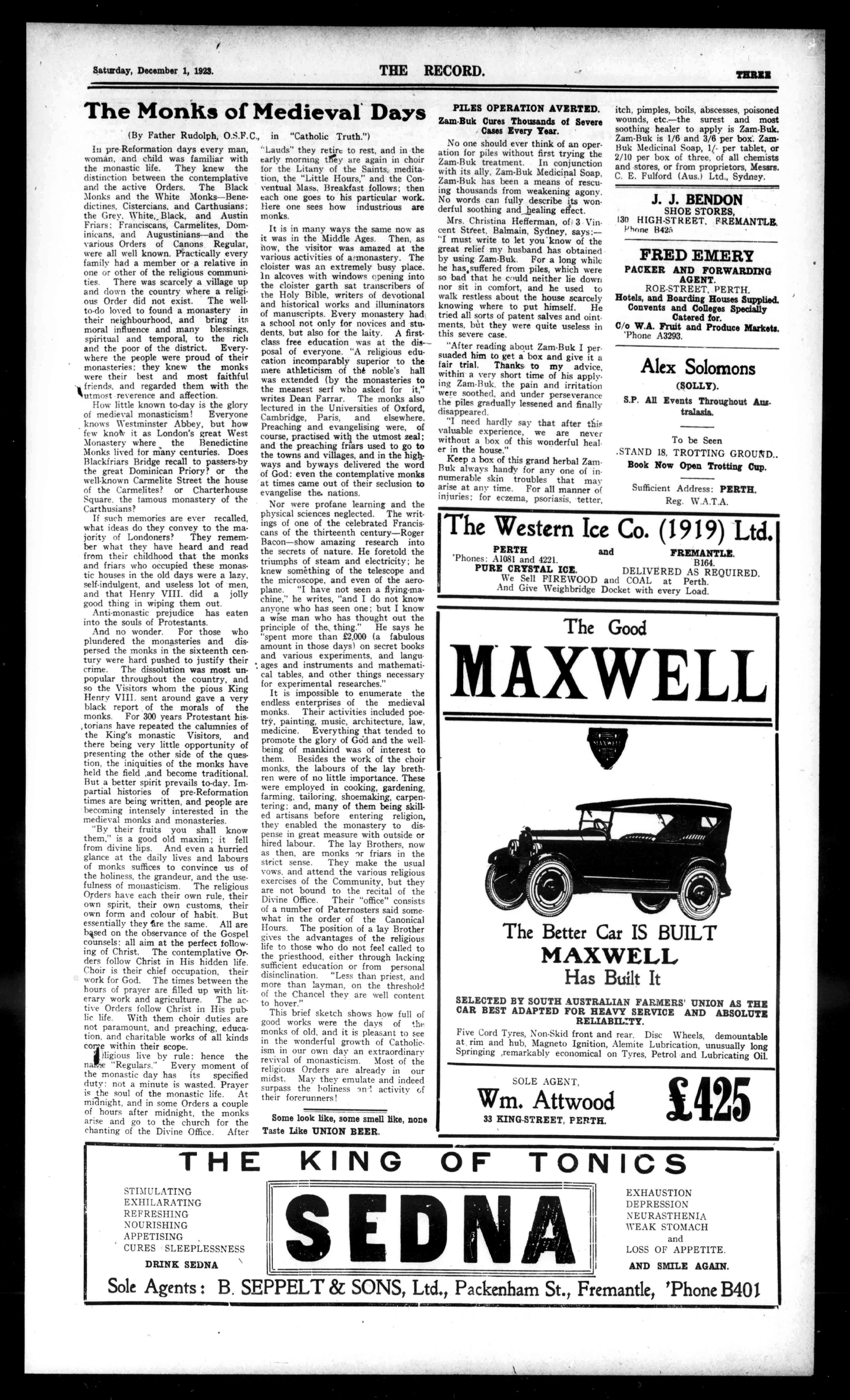LATE,OFPERTH,NOWCORNEROFPOINTANDADELAIDESTS., FREMAYTLE. HasNewConsignmentsContinuallyArrivingofPictures,PrayerBooks, Rosaries,Crucifixes,etc.AllCatholicPapersStocked.Beeswax,Altar Candler,Incense,andCharcoal. PATRONISELOCALINDUSTRY. PROMPTATTENTION.Tel.B945.