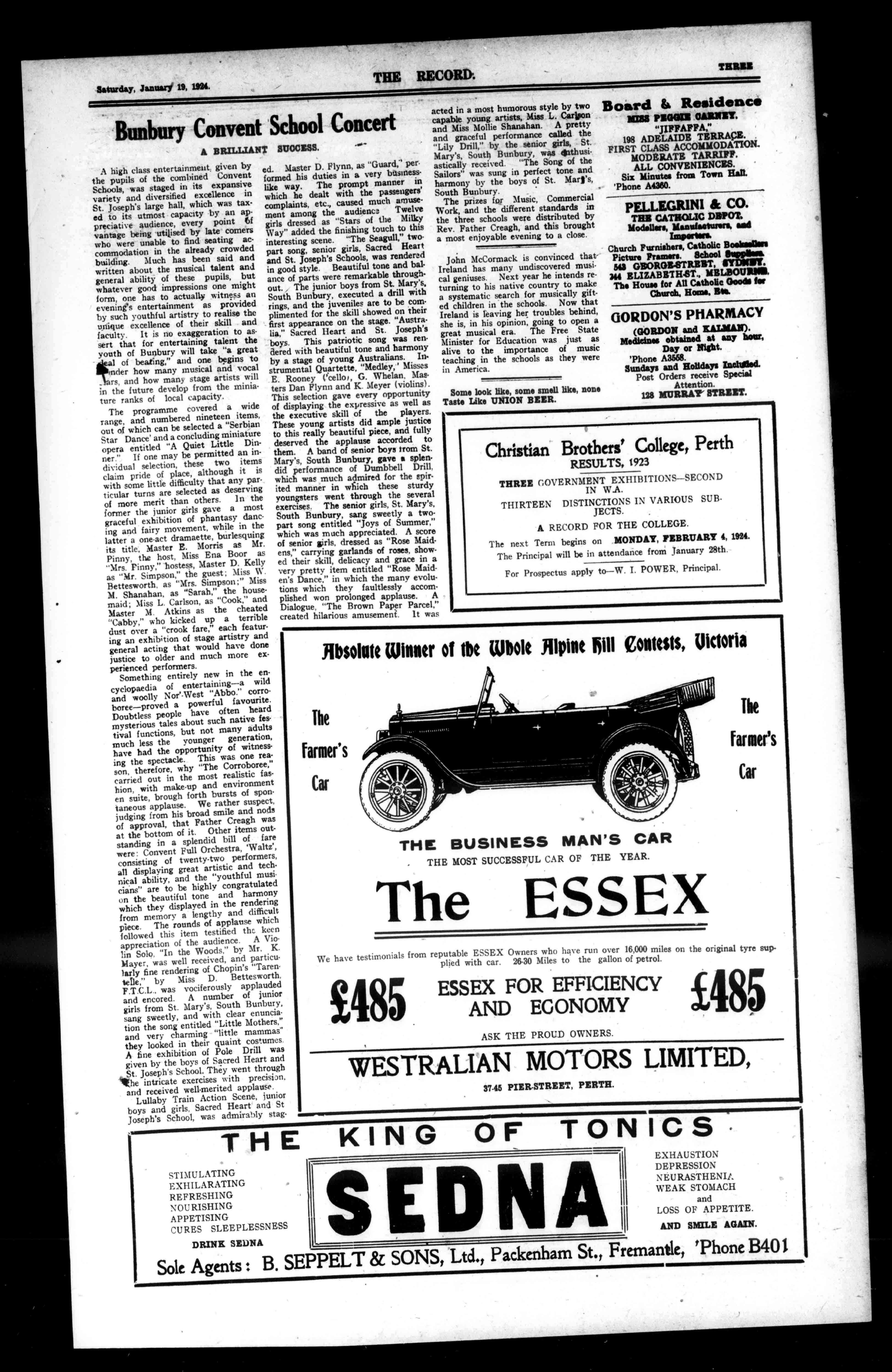 ed.MasterD.Flynn,as"Guard,'per formedhisdutiesinaverybusinesslikeway.Thepromptmannerin whichhedealtwiththepassengers' complaints,etc.,causedmuchamusementamongtheaudienceTwelve girlsdressedas"StarsoftheMilky Way"addedthefinishingtouchtothis interestingscene."TheSeagull,"two. partsong,seniorgirls,SacredHeart andSt.Joseph'sSchools,wasrendered ingoodstyle.Beautifultoneandbalanceofpartswereremarkablethroughout.ThejuniorboysfromSt.Mary's, SouthBunbury,executedadrillwith rings,andthejuvenilesaretobecomplimentedfortheskillshowedontheir firstappearanceonthestage."Australia,"SacredIleartandSt.Joseph's boys.Thispatrioticsongwasrenderedwithbeautifultoneandharmony byastageofyoungAustralians.InstrumentalQuartette,"Medley,'Misses E.Rooneyrcellor,G.Whelan,MastersDanFlynnandK.Meyer(violins). Thisselectiongaveeveryopportunity ofdisplayingtheexpressiveaswellas theexecutiveskilloftheplayers. Theseyoungartistsdidamplejustice tothisreallybeautifulpiece,andfully deservedtheapplauseaccordedto them.AbandofseniorboysfromSt. Mary's,SouthBunbury,gaveasplendidperformanceofDumbbellDrill. whichwasmuchadmiredforthespiritedmannerinwhichthesesturdy youngsterswentthroughtheseveral exercises.Theseniorgirls,St.Mary's, SouthBunbury,sangsweetlyatwopartsongentitled"JoysofSummer," whichwasmuchappreciated.Ascore ofseniorgirls,dressedas"RoseMaidens,"carryinggarlandsofroses,showedtheirskill,delicacyandgraceina veryprettyitementitled"RoseMaid. en'sDance,"inwhichthemanyevolutionswhichtheyfaultlesslyaccomplishedwonprolongedapplause.A Dialogue."TheBrownPaperParcel," createdhilariousamusement.Itwas