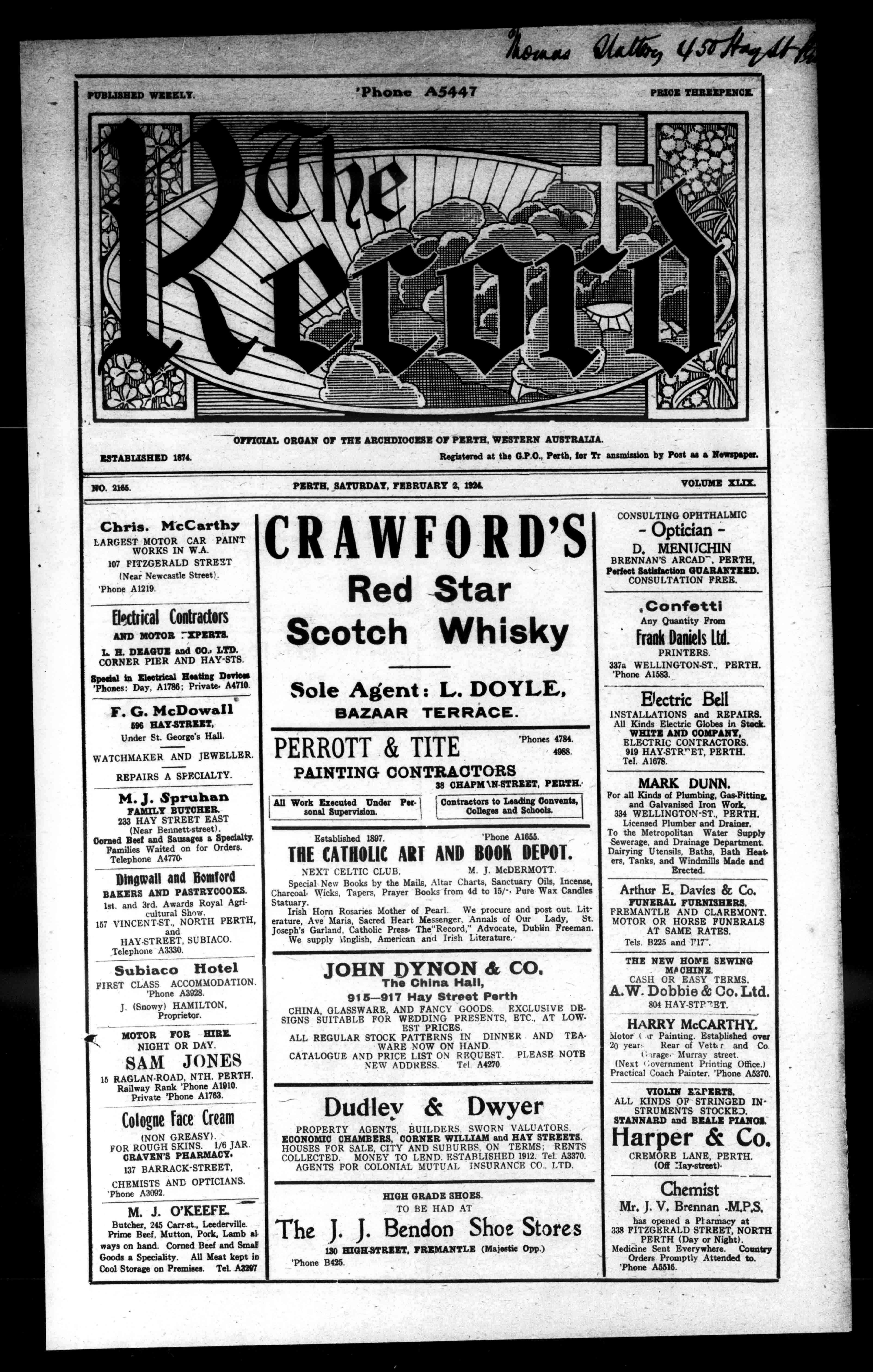 Dudley&Dwyer PROPERTYAGENTS,BUILDERS.SWORNVALUATORS. ECONOMICCHAMBERS,CORNERWILLIAMandHAYSTREETS. HOUSESFORSALE,CITYANDSUBURBS,ONTERMS;RENTS COLLECTED.MONEYTOLEND.ESTABLISHED1912.Tel.A3370. AGENTSFORCOLONIALMUTUALINSURANCECO..LTD.