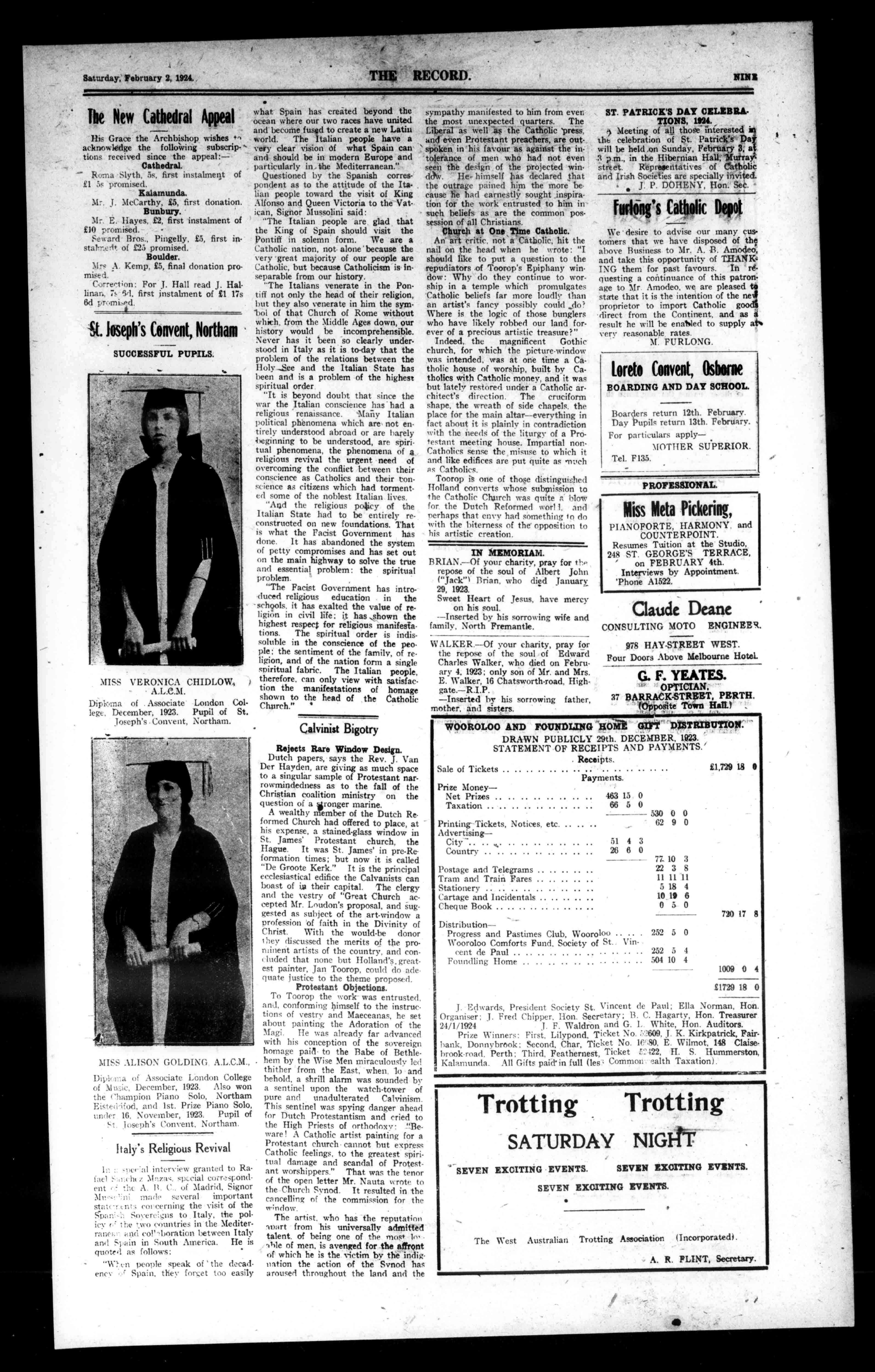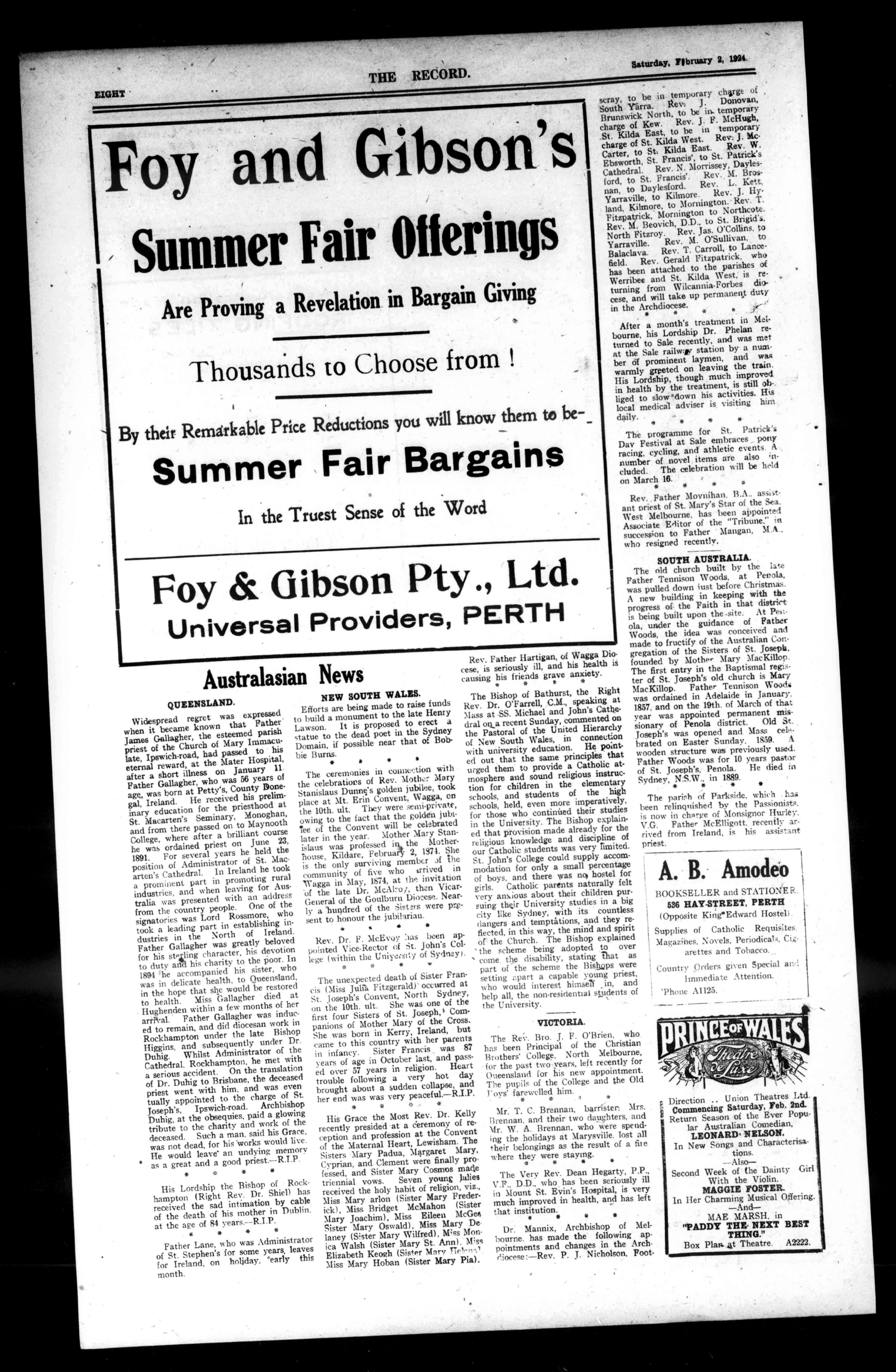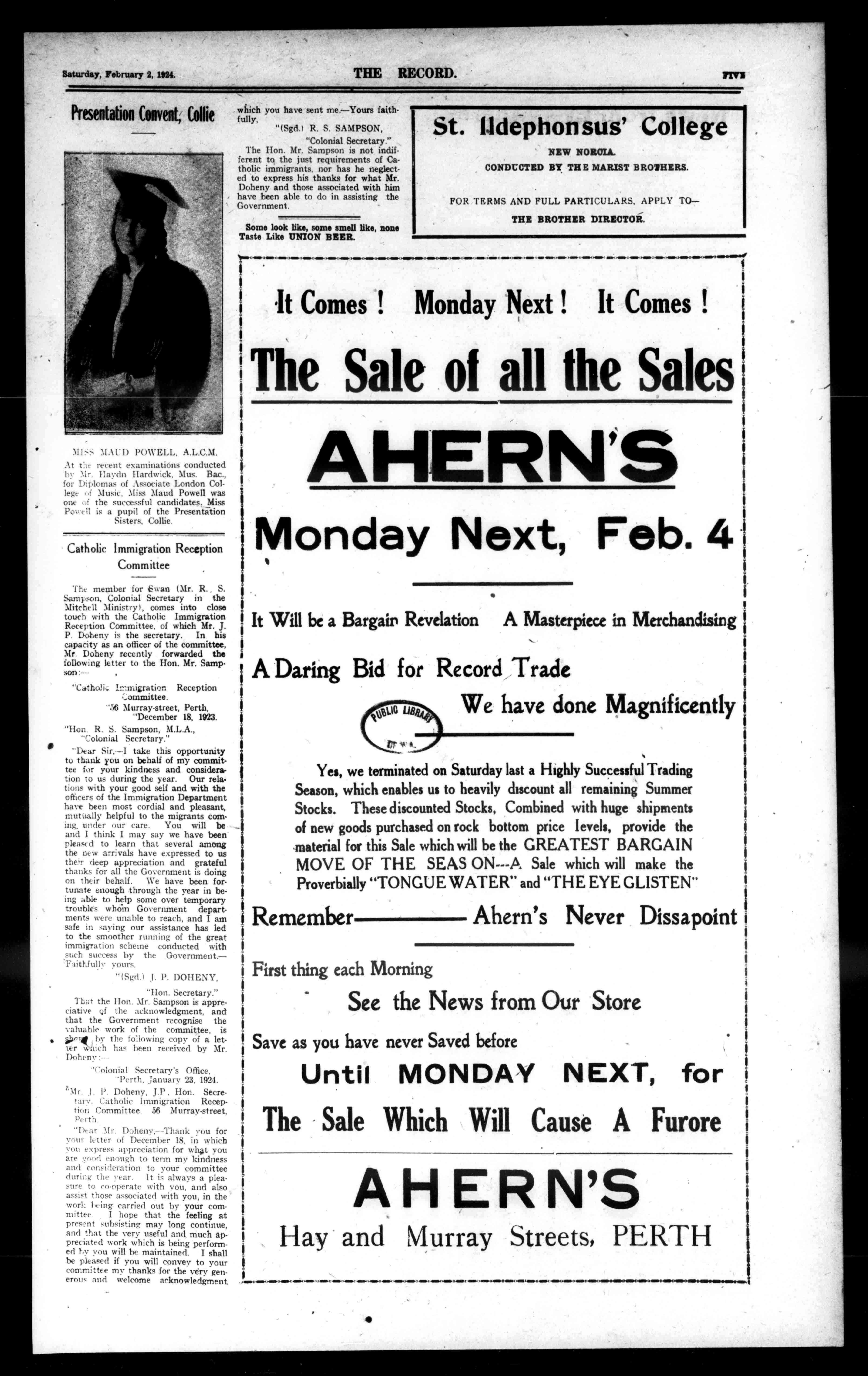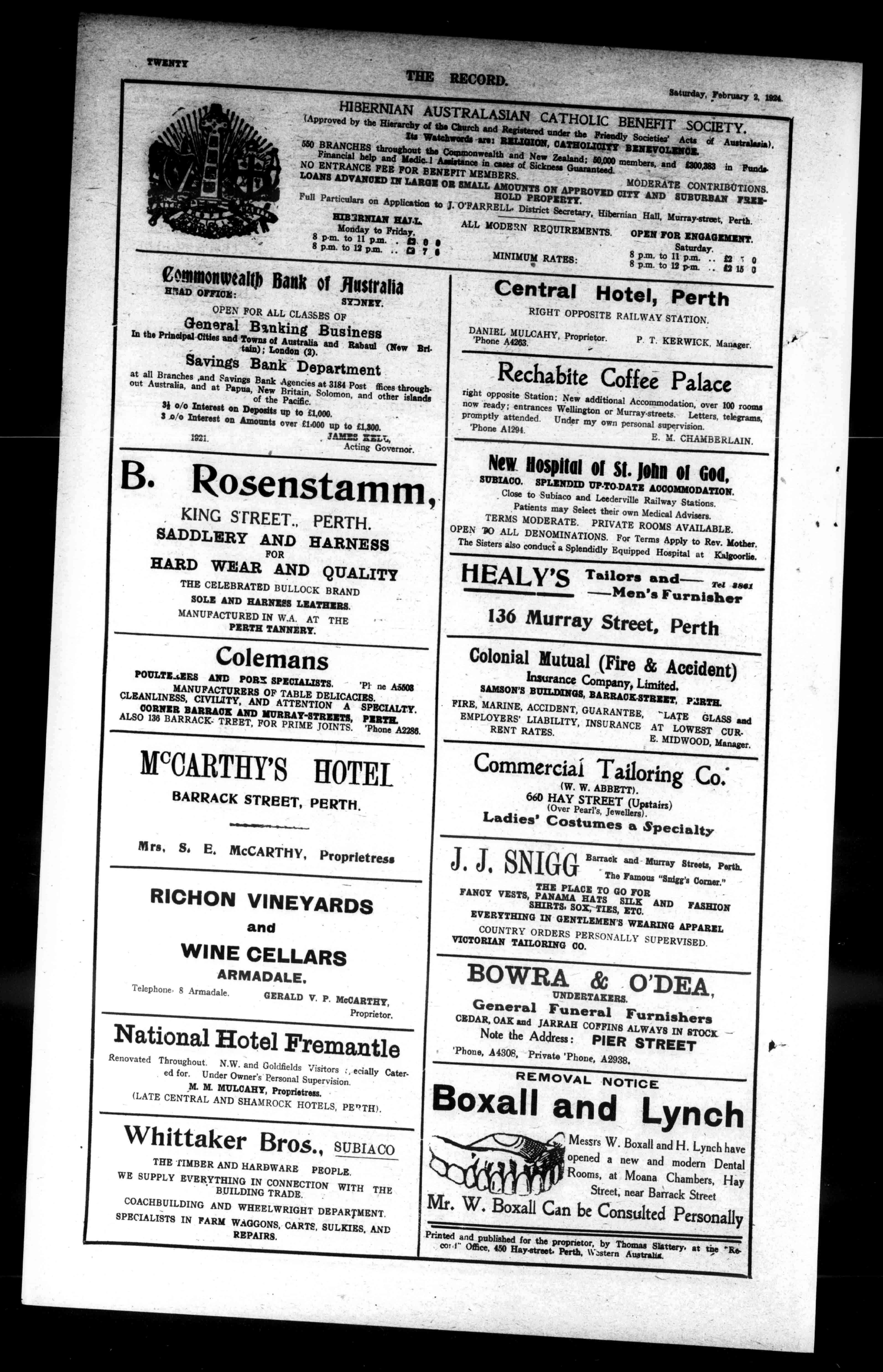 J.J. SNIGGBarrackandMurrayStreets,Perth. TheFamous"Snigg'sCorner." THEPLACETOGOFOR FANCYVESTS,PANAMAHATSSILKANDFASHION SHIRTS,SOX,TIES,ETC. EVERYTHINGINGENTLEMEN'SWEARINGAPPAREL COUNTRYORDERSPERSONALLYSUPERVISED.VICTORIANTAILORINGCO. BOWRA&O'DEAUNDERTAKERS.GeneralFuneralFurnishersCEDAR,OAKandJARRAHCOFFINSALWAYSINSTOCK NotetheAddress:PIERSTREET 'Phone,A4305,Private'Phone,A2938.