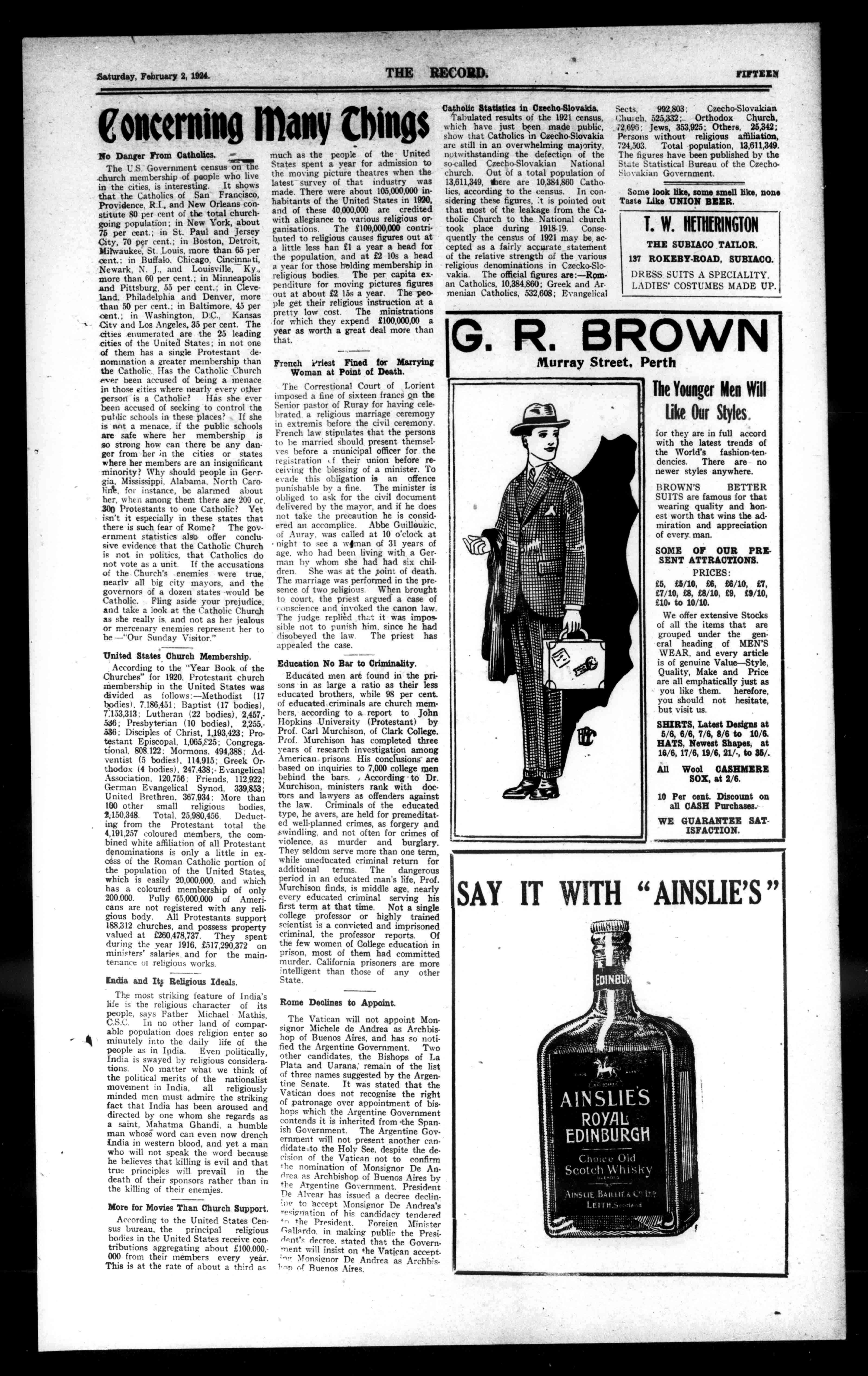 TheProtestantEpiscopalChurchof theUnitedStatesisnotaverynumerousbody.Butitclaimsaspecial statusasrepresentingtheEstsHished Churchofoldcolonialdays,andits memberssometimesassumetheattitudeofrankingasadherentsofthe mostrespectableform st American Protestantism,somethingsuperiorto NonconformistMethodistsandPresbyterians,anddignifiedbyasomewhat vagueconnectionwiththehistoric See"ofCanterbury.LiketheEstablishedChurchinEngland,withwhich itthusclaimsfellowship,ithasits troublesanditsdivisions.Onesection,despitetheofficialtitleof"Piotestant,"insiststhatitrallyCatholic,.partofthe"greatAnglo-Catholic" branchoftheUniversalChurch.Those whobelongtothisvarietyofAmerican Protestantismclaimpriestlyordersfor theirclergy,teachmany"Roman'doc trines,andadoptanadvaoec,lritualismintheirchurches.Theyhave longbeenseriouslytroubledbythe laxityofBishopsandclergymenof theirChurchwhopersistinexchangingpulpitsandopenlycommunicating withmereMethodistsandPresbyterians,andteachingold-fashionedProtestantdoctrine.