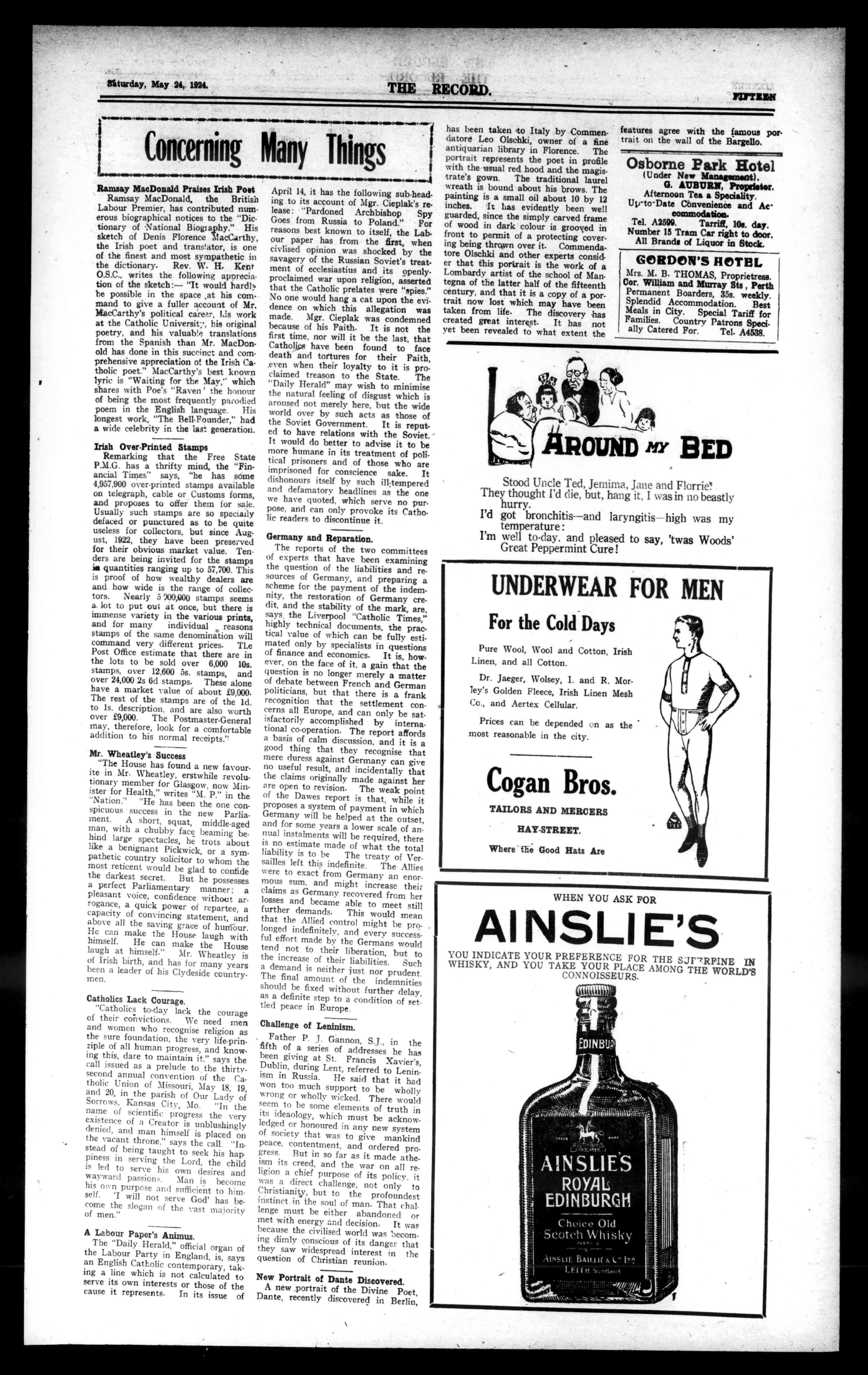 THECATHOLICARTANDBOOKDEPOT. NEXTCELTICCLUB. M.J.McDERMOTT. SpecialNewBooksbytheMails,AltarCharts,SanctuaryOils,Incense, Charcoal,Wicks,Tapers,PrayerBooksfrom4dto15/-,PureWaxCandles Statuary. IrishHornRosariesMotherofPearl.Weprocureandpostout.Lit- erature,AveMaria,SacredHeartMessenger,AnnalsofOurLady,St. Joseph'sGarland,CatholicPress,The"Record,"Advocate,DublinFreeman. WesupplyVaiglish,AmericanandIrishLiterature.