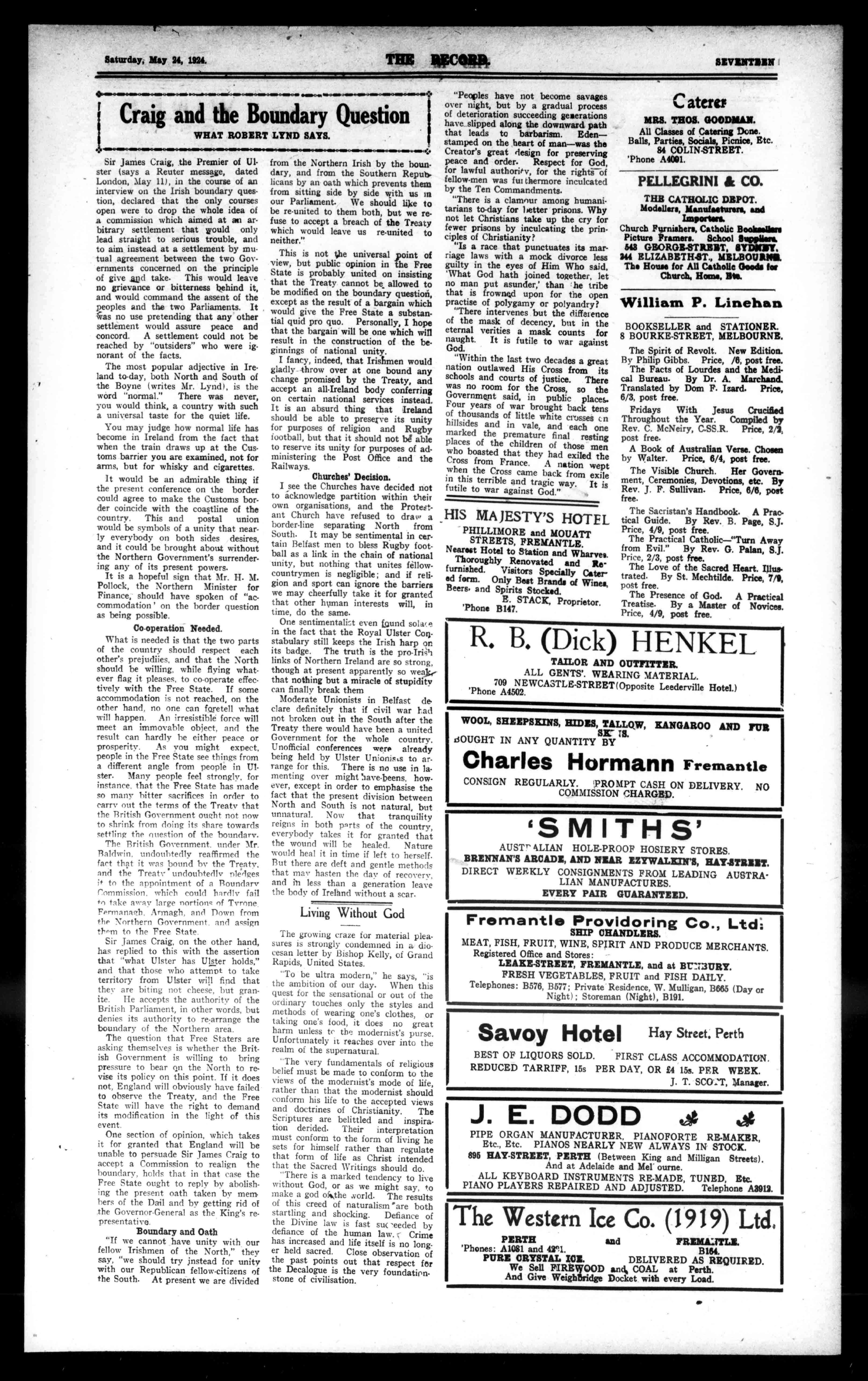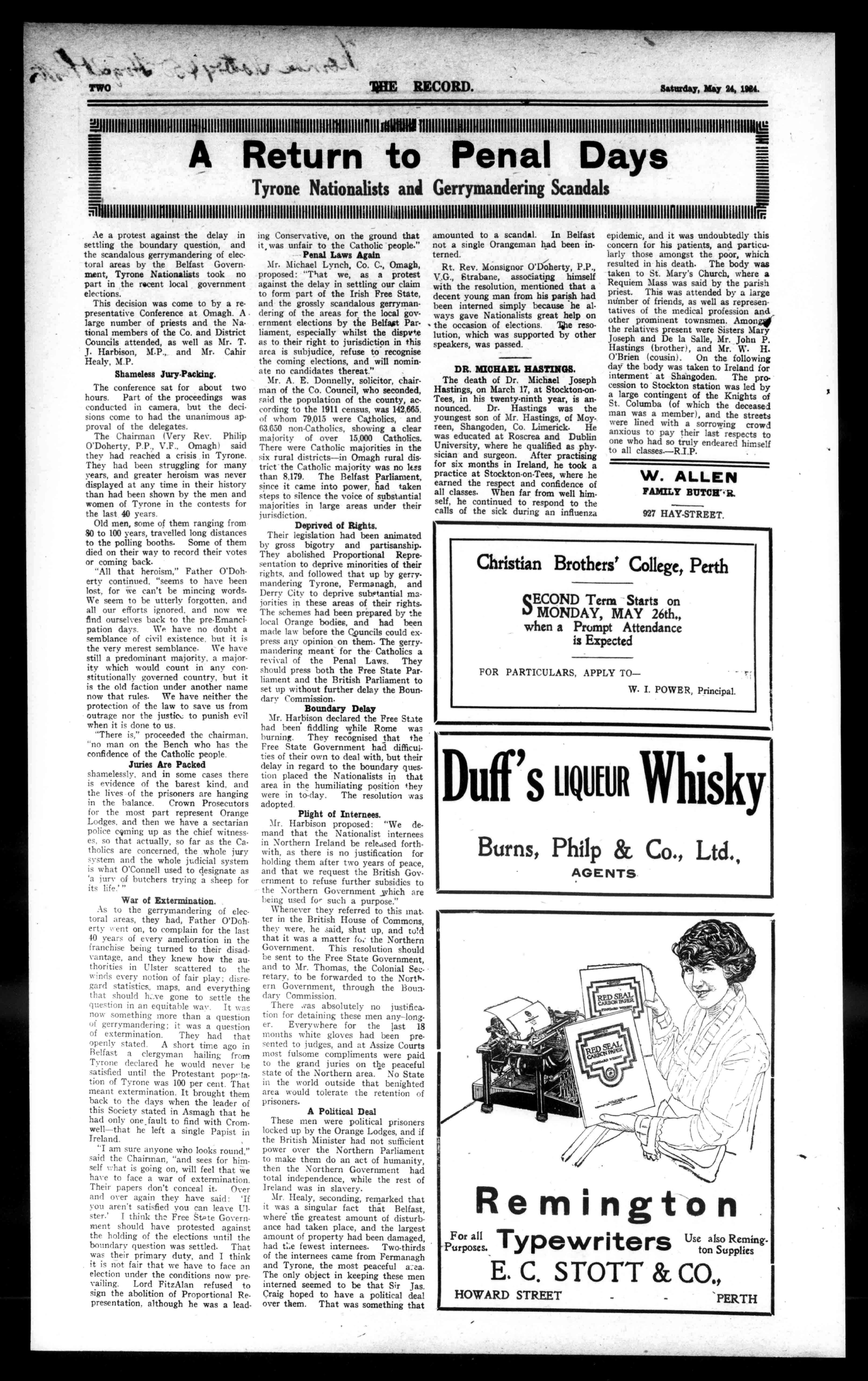 "Allthatheroism,"FatherO'Doh-rights,andfollowedthatupbygerry- ertycontinued."seemstohavebeenmanderingTyrone,Fermanagh,and lost,forwecan'tbemincingwords.DerryCitytodeprivesubstantialmaWeseemtobeutterlyforgotten,andjoritiesintheseareasoftheirrights. alloureffortsignored,andnowweTheschemeshadbeenpreparedbythe findourselvesbacktothepre-Emanci-localOrangebodies,andhadbeen pationdays.WehavenodoubtamadelawbeforetheCouncilscouldexsemblanceofcivilexistence,butitispressanyopiniononthem.Thegerry- theverymerestsemblance.WehavemanderingmeantfortheCatholicsa stillapredominantmajority,amajor-revivalofthePenalLaws.They itywhichwouldcountinanycon-shouldpressboththeFreeStateParstitutionallygovernedcountry,butitliamentandtheBritishParliamentto istheoldfactionunderanothernamesetupwithoutfurtherdelaytheBounnowthatrules.Wehaveneitherthe(Ian-Commission. protectionofthelawtosaveusfrom BoundaryDelay outragenorthejustice:topunishevil Mr.HarbisondeclaredtheFreeSt.ste whenitisdonetous. hadbeenfiddlingwhileRomewa--, "Thereis,"proceededthechairman,burning.Theyrecognisedthatthe "nomanontheBenchwhohastheFreeStateGovernmenthaddifficulconfidenceoftheCatholicpeople. tiesoftheirowntodealwith,buttheir JuriesArePacked delayinregardtotheboundaryques- shamelessly,andinsomecasestheretionplacedtheNationalistsinthat isevidenceofthebarestkind,andareainthehumiliatingpositionthey thelivesoftheprisonersarehangingwereinto-day.Theresolution.vas inthebalance.CrownProsecutorsadopted. forthemostpartrepresentOrange PlightofInternees. Lodges,andthenwehaveasectarian Mr.Harbisonproposed:"Wede- policecomingupasthechiefwitness-mandthattheNationalistinternees es.sothatactually,sofarastheCa-inNorthernIrelandbereleasedforththolicsareconcerned,thewholejurywith,asthereisnojustificationfor systemandthewholejudicialsystemholdingthemaftertwoyearsofpeace, iswhatO'ConnellusedtodesignateasandthatwerequesttheBritishGov- 'ajuryofbutcherstryingasheepforernmenttorefusefurthersubsidiesto itslife.'" theNorthernGovernmentwhichare WarofExtermination, beingusedforsuchapurpose."