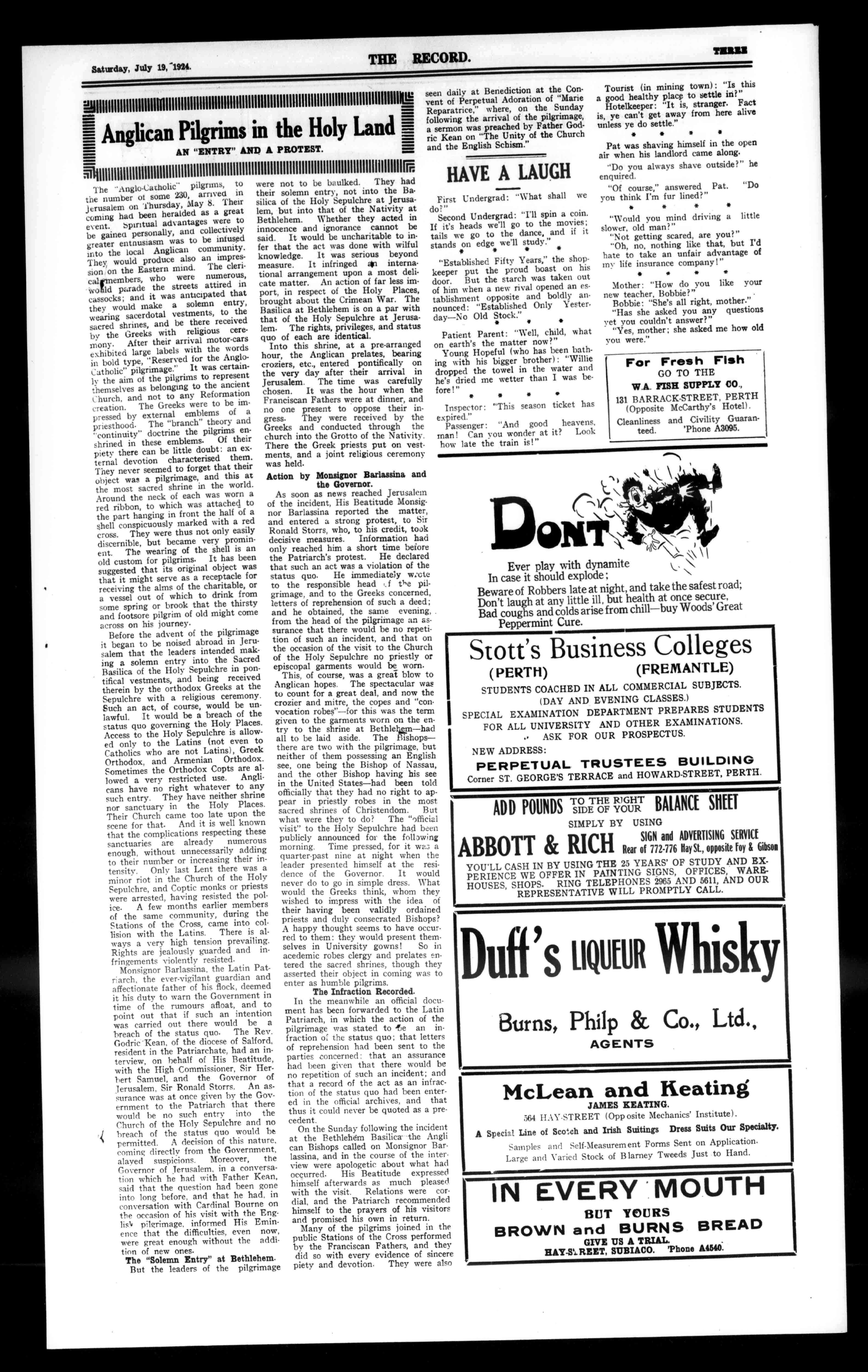 The-Anglo-catholic'pilgrims,towerenottobebaulked.Theyhad in i enumberotsome230,arrivedntheirsolemnentry,notintotheBa. Jerusalemonishursday,May8.TheirsilicaoftheHolySepulchreatJerusacominghadbeenheraldedasagreatlem,butintothatoftheNativityat event.spiritualadvantagesweretoBethlehem.Whethertheyactedin begainedpersonally,andcollectivelyinnocenceandignorancecannotbe greaterentnusiasmwastobe'musedsaid.ItwouldbeuncharitabletoinintothelocalAnglicancommunity.terthattheactwasdonewithwilful Theywouldproducealsoanimpres-knowledge.Itwasseriousbeyond lionontheEasternmind.Theden-measure.Itinfringed*1internscaltmembers,whowerenumerous,tionalarrangementuponamostdeliwobldparadethestreetsattiredincatematter.Anactionoffarlessimcassocks;anditwasanticipatedthatport,inrespectoftheHolyPlaces, theywouldmakeasolemnentry,broughtabouttheCrimeanWar.The wearingsacerdotalvestments,totheBasilicaatBethlehemisonaparwith sacredshrines,andbetherereceivedthatoftheHolySepulchreatJerusabvtheGreekswithreligiouscere-lem.Therights,privileges,andstatus irony.Aftertheirarrivalmotor-carsquoofeachareidentical. exhibitedlargelabelswiththewords Intothisshrine,atapre-arranged inboldtype,"ReservedfortheAnglo-hour,theAnglicanprelates,bearing Catholic"pilgrimage."Itwascertain-croziers,etc.,enteredpontificallyon lvtheaimotthepilgrimstorepresenttheverydayaftertheirarrivalin themselvesasbelongingtotheancientJerusalem.Thetimewascarefully Church.andnottoanyReformationchosen.Itwasthehourwhenthe creation.TheGreeksweretobeim-FranciscanFatherswereatdinner,and pressedbyexternalemblemsofanoonepresenttoopposetheirinpriesthood.The"branch"theoryandgress.Theywerereceivedbythe "continuity"doctrinethepilgrimsen-Greeksandconductedthroughthe shrilledin.theseemblems.OftheirchurchintotheGrottooftheNativity. pietytherecanbelittledoubt:anex-TheretheGreekpriestsputonvestternaldevotioncharacterisedthem.ments,andajointreligiousceremony 'Theyneverseemedtoforgetthattheirwasheld. objectwasapilgrimage,andthisatActionbyMonsignorBarlassinaand themostsacredshrineintheworld. theGovernor. Aroundtheneckofeachwasworna AssoonasnewsreachedJerusalem redribbon,towhichwasattachedtooftheincident,HisBeatitudeMonsigtheparthanginginfrontthehalfofanorBarlassinareportedthematter, ;hellconspicuouslymarkedwitharedandenteredastrongprotest,toSir cross.TheywerethusnotonlyeasilyRonaldStorrs,who,tohiscredit,took discernible,butbecameverypromin-decisivemeasures.Informationhad ent.Thewearingoftheshellisanonlyreachedhimashorttimebefore oldcustomforpilgrims.IthasbeenthePatriarch'sprotest.Hedeclared suggestedthatitsoriginalobjectwasthatsuchanactwasaviolationofthe thatitmightserveasareceptacleforstatusquo.Heimmediatelyw..ete receivingthealmsofthecharitable,ortotheresponsiblehead..f pilavesseloutofwhichtodrinkfromgrimage,andtotheGreeksconcerned, somespringorbrookthatthethirstylettersofreprehensionofsuchadeed; andfootsorepilgrimofoldmightcomeandheobtained,thesameevening, acrossonhisjourney. fromtheheadofthepilgrimageanas-
