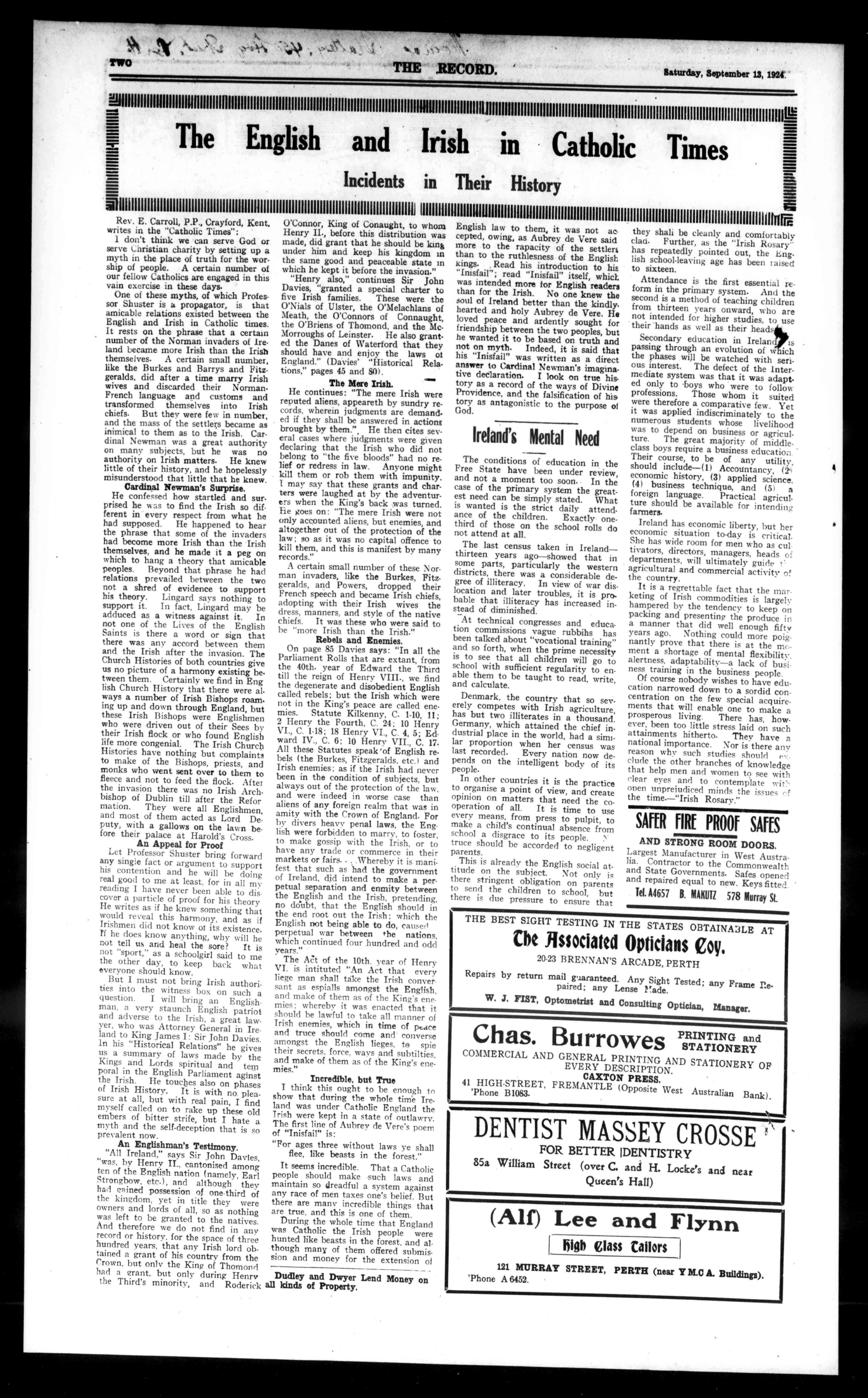 Established1897. 'PhoneA1655. THECATHOLICARTANDBOOKDEPOT. NEXTCELTICCLUB. M.J.McDERMOTT. SpecialNewBooksbytheMails,AltarCharts,,SanctuaryOils,Incense, Charcoal,Wicks,Tapers,PrayerBooksfrom4dto15/-.PureWaxCandles Statuary. IrishHornRosariesMotherofPearl.Weprocureandpostout.Literature,AveMaria,SacredHeartMessenger,AnnalsofOurLady,St. Joseph'sGarland,CatholicPress.The"Record,"Advocate,DublinFreeman. Wesupplyiinglish,AmericanandIrishLiterature.