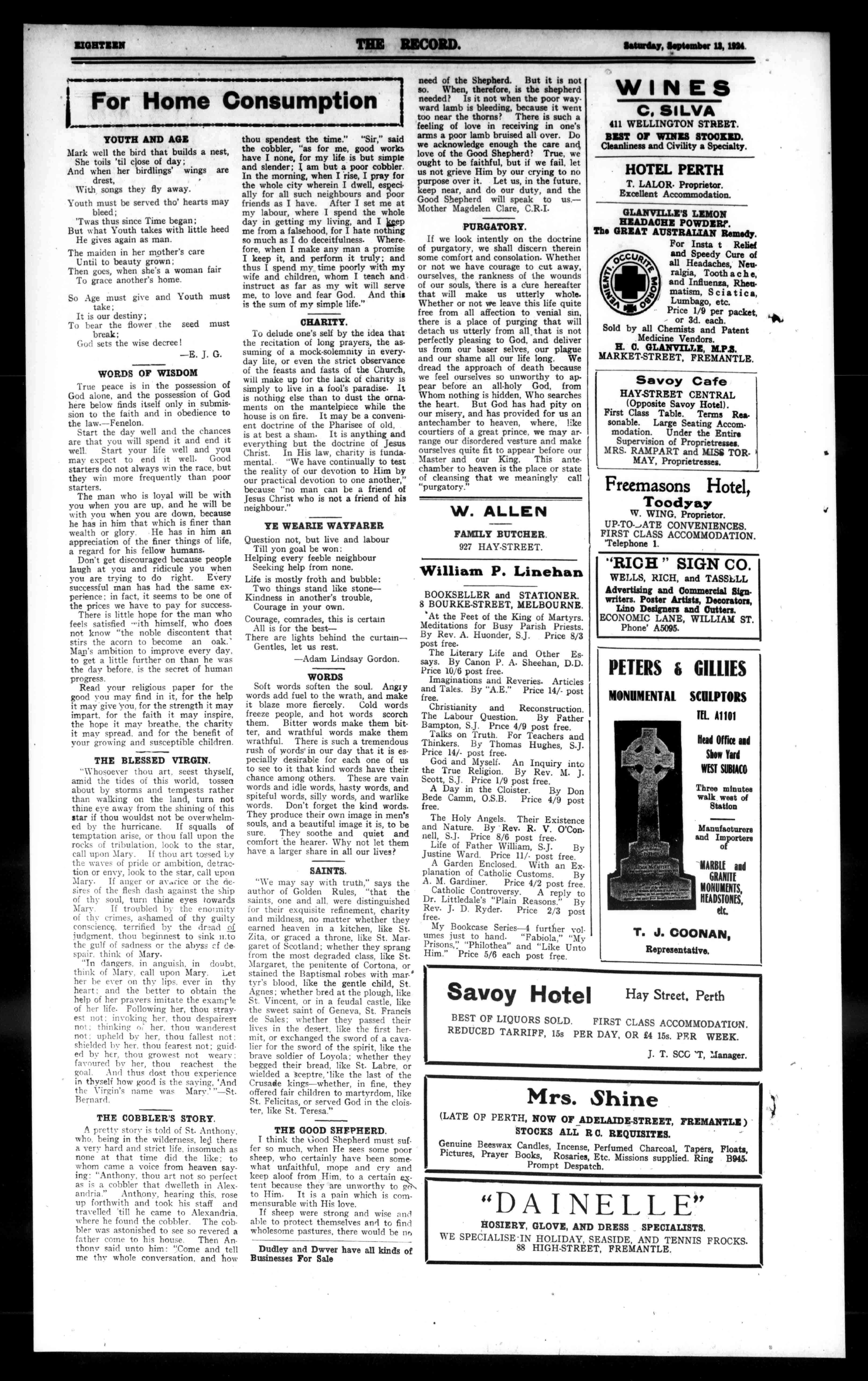 PETERS6CLIMES Mrs.Shine (LATEOFPERTH,NOWOFADELAIDE-STREET,FREMANTLE) STOCKSALLRC.REQUISITES. GenuineBeeswaxCandles,Incense,PerfumedCharcoal,Tapers,Floats, Pictures,PrayerBooks,Rosaries,Etc.Missionssupplied.RingB945. PromptDespatch.