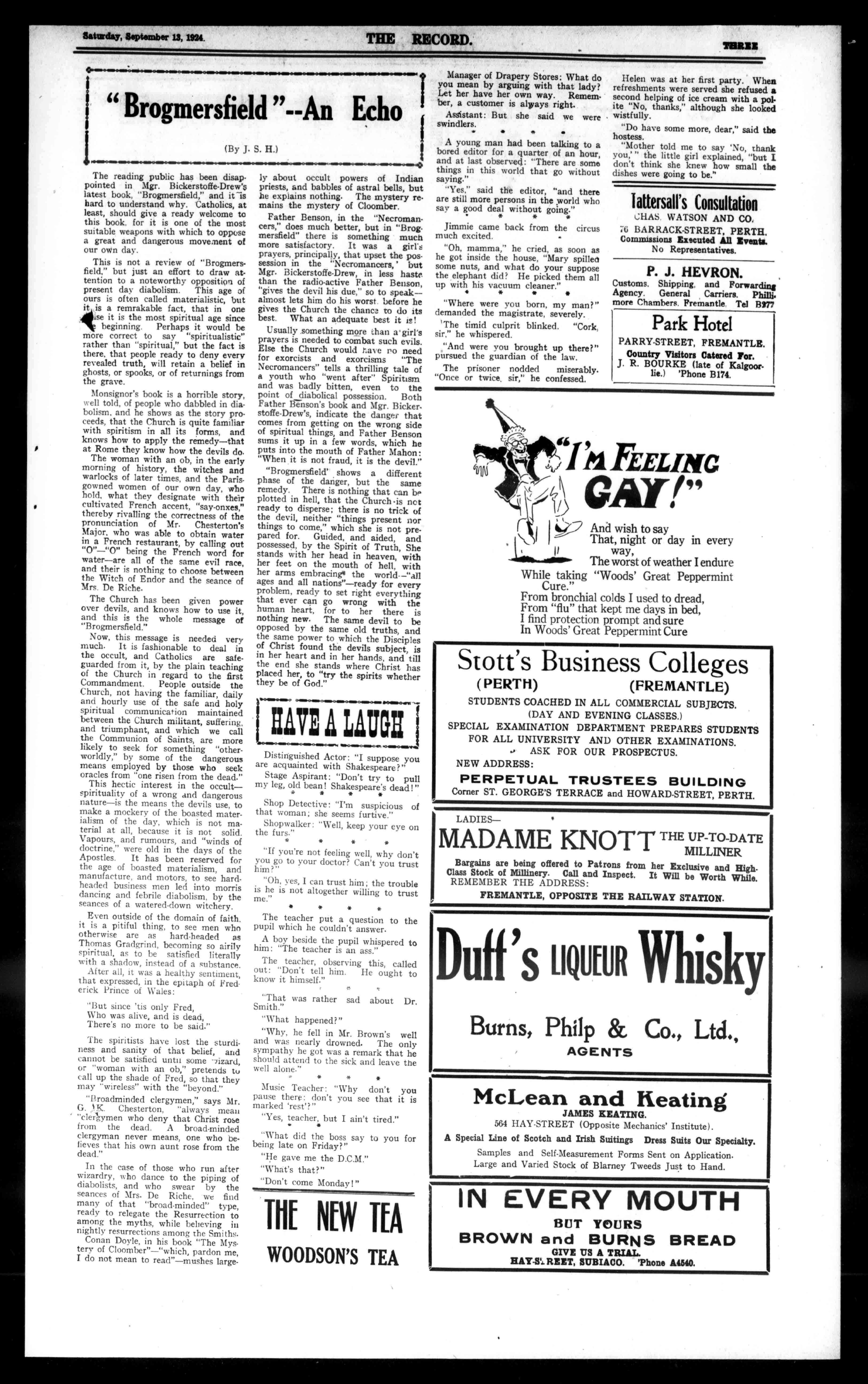 FatherBenson,inthe"Necromancers,"doesmuchbetter,butin"Brog- mersfield"thereissomethingmuch moresatisfactory.Itwasagirls prayers,principally,thatupsetthepos. sessioninthe"Necromancers,'but Mgr.Bickerstoffe-Drew,inlesshaste thantheradio-activeFatherBenson, "givesthedevilhisdue,"sotospeak-- almostletshimdohisworstbeforehe givestheChurchthechancetodoits best.Whatanadequatebestitis!