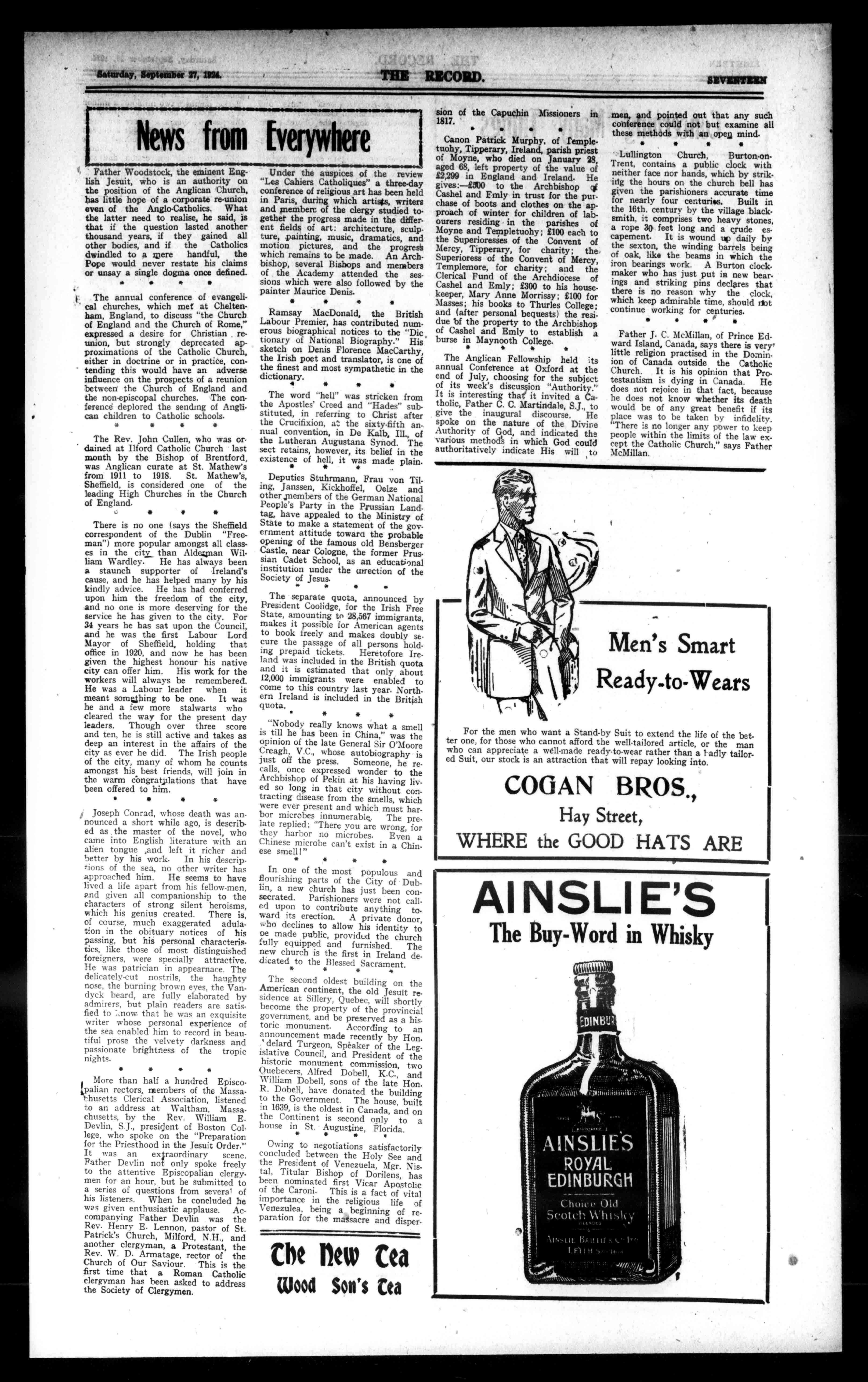 SpecialNewBooksbytheMails,AltarCharts,SanctuaryOils,Incense, Charcoal,Wicks,Tapers,PrayerBooksfrom4dto15/-,PureWaxCandles Statuary. IrishHornRosariesMotherofPearl.Weprocureandpostout.Lit- erature,AveMaria,SacredHeartMessenger,AnnalsofOurLady,St. Joseph'sGarland,CatholicPress,The"Record,"Advocate,DublinFreeman. Wesupplylinglish,AmericanandIrishLiterature.