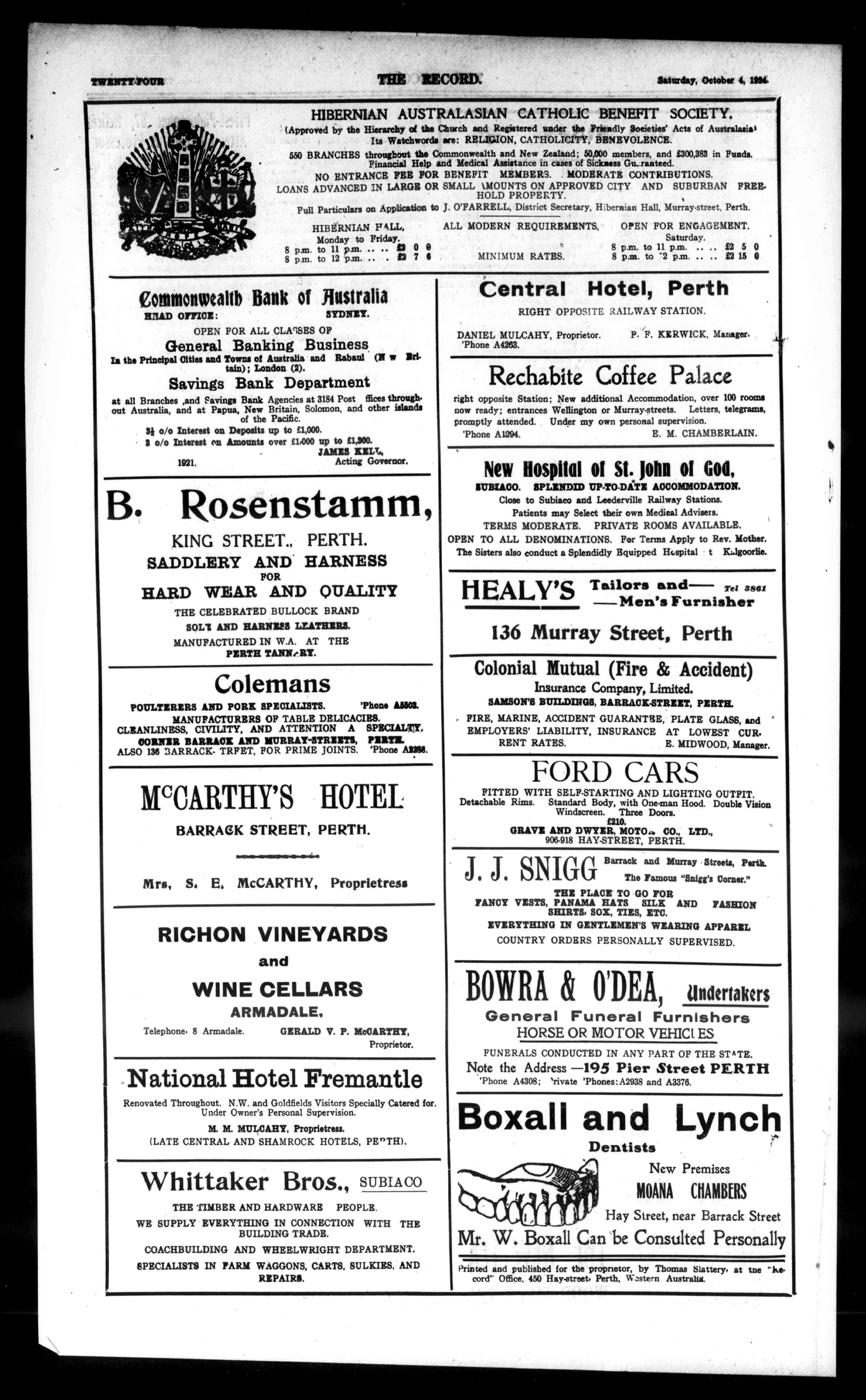 1st.and3rd.AwardsRoyalAgriculturalSh,'Nd 157VINCENT-ST.,NORTHPERTH, and HAY-STREET,SUBIACO. TelephoneA3330. SubiacoHotel FIRSTCLASSACCOMMODATION. 'PhoneA3928. P.J.KEANE. Proprietor. MOTORFORHIRE. NIGHTORDAY. SAMJONES 15RAGLAN-ROAD,NTH.PERTH. RailwayRank'PhoneA1910. Private'PhoneA1763.