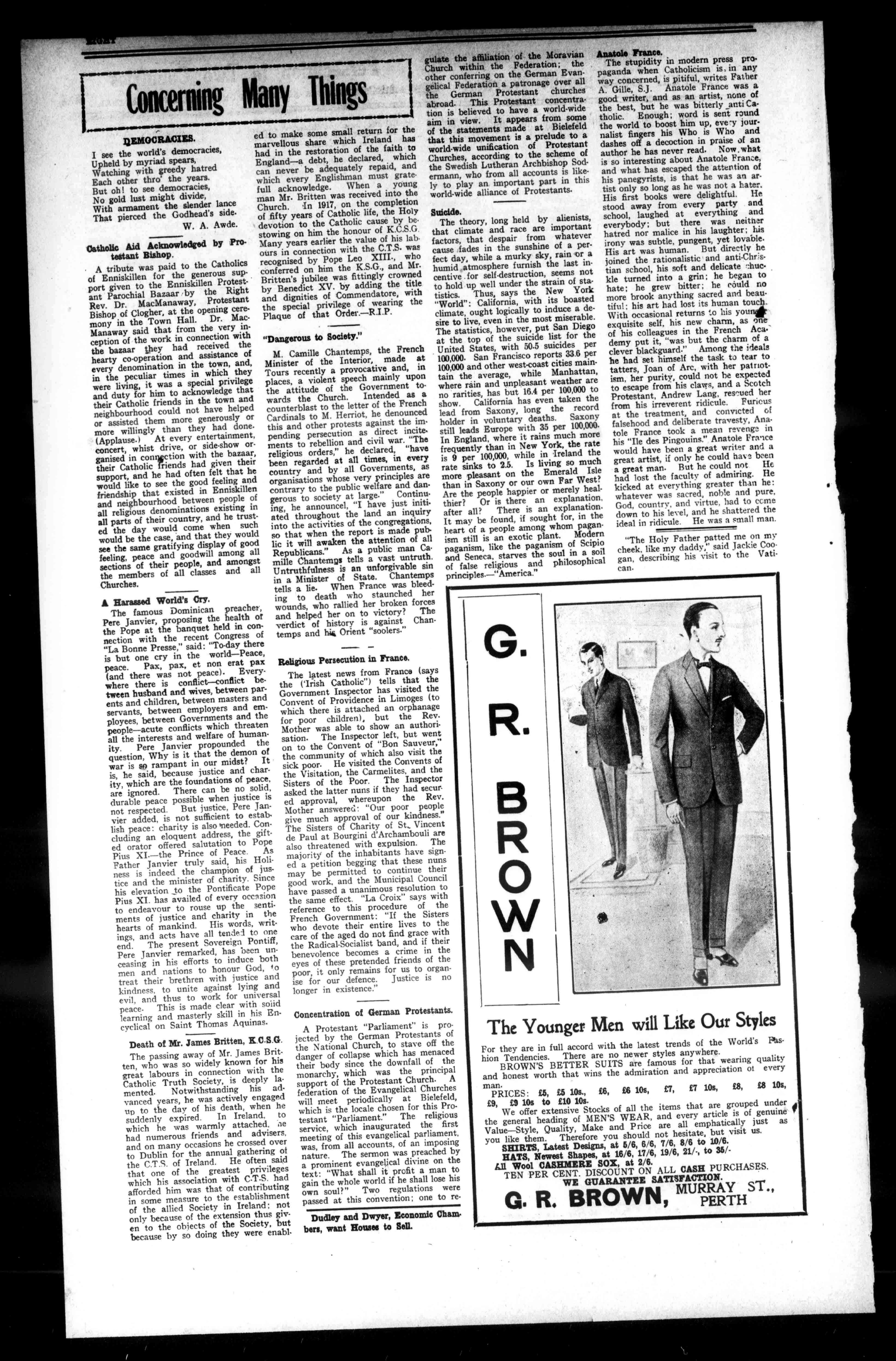 MISSM.McMAHON. ChoicestPastry,Fruits,andConies tionery. 79PIER-STREET.PERTH. (UnderHorseshoeCoffeePalace). TOIRISHMENANDTHOSEOF IRISHDESCENT. THEIRISHNATIONAL FORESTERS InviteEnquiryfromIntending Members. TheSociety'sObjectsAre: Unity,Nationality,Benevolence. BranchSecretaries'Addresses: