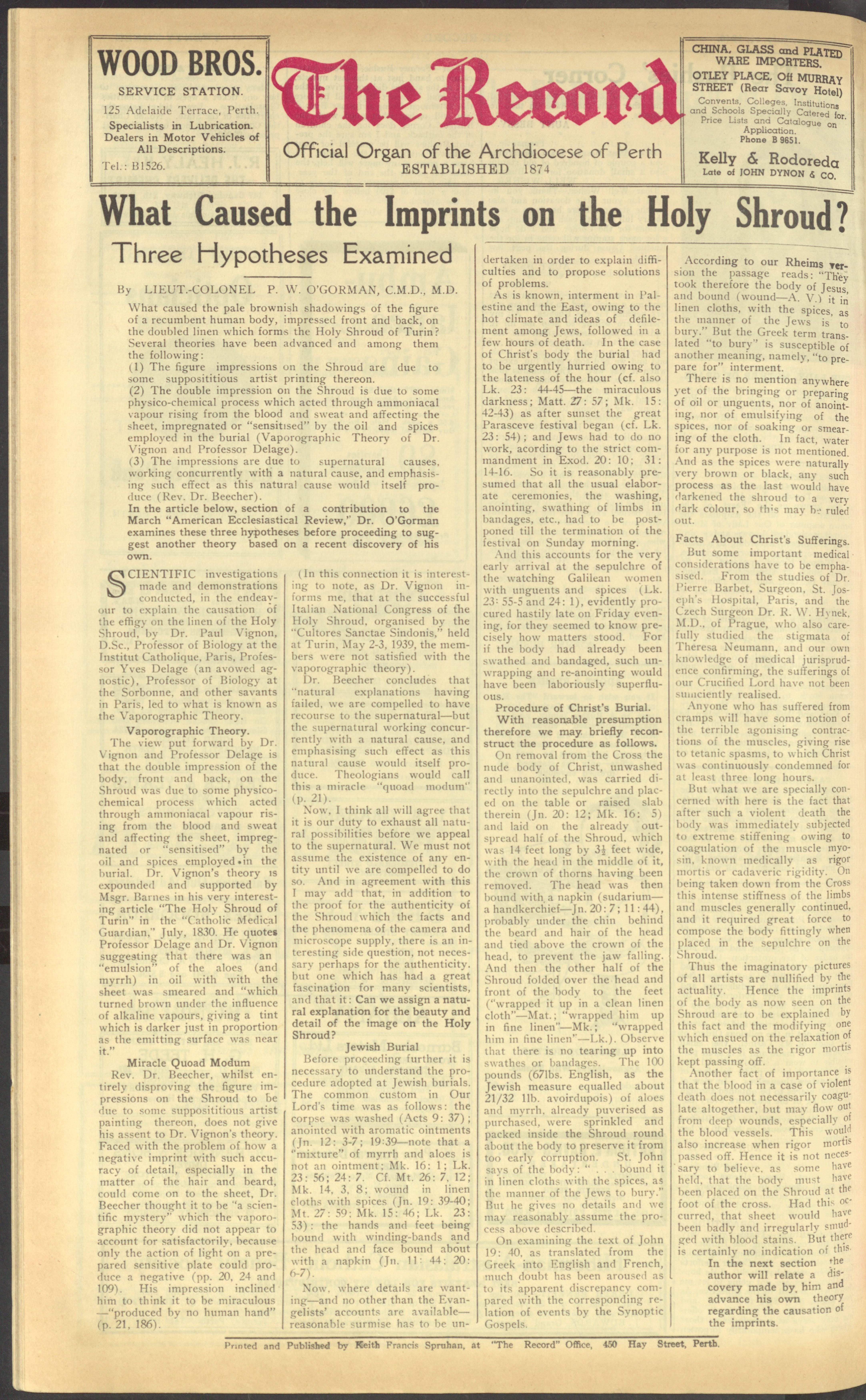 §CIENTIFIC investigations made and demonstrations conducted, in the endeavour to explain the causation of theeffigy on the linen of theHoly Shroud, by Dr Paul Vignon, DSc, Professor of Biologyatthe Institut Catholique,Paris, Professor Yves Delage (an avowed agnostie), Professor of Biology at the Sorbonne, and other savants in Paris, led to what is known as the Vaporographic Theory