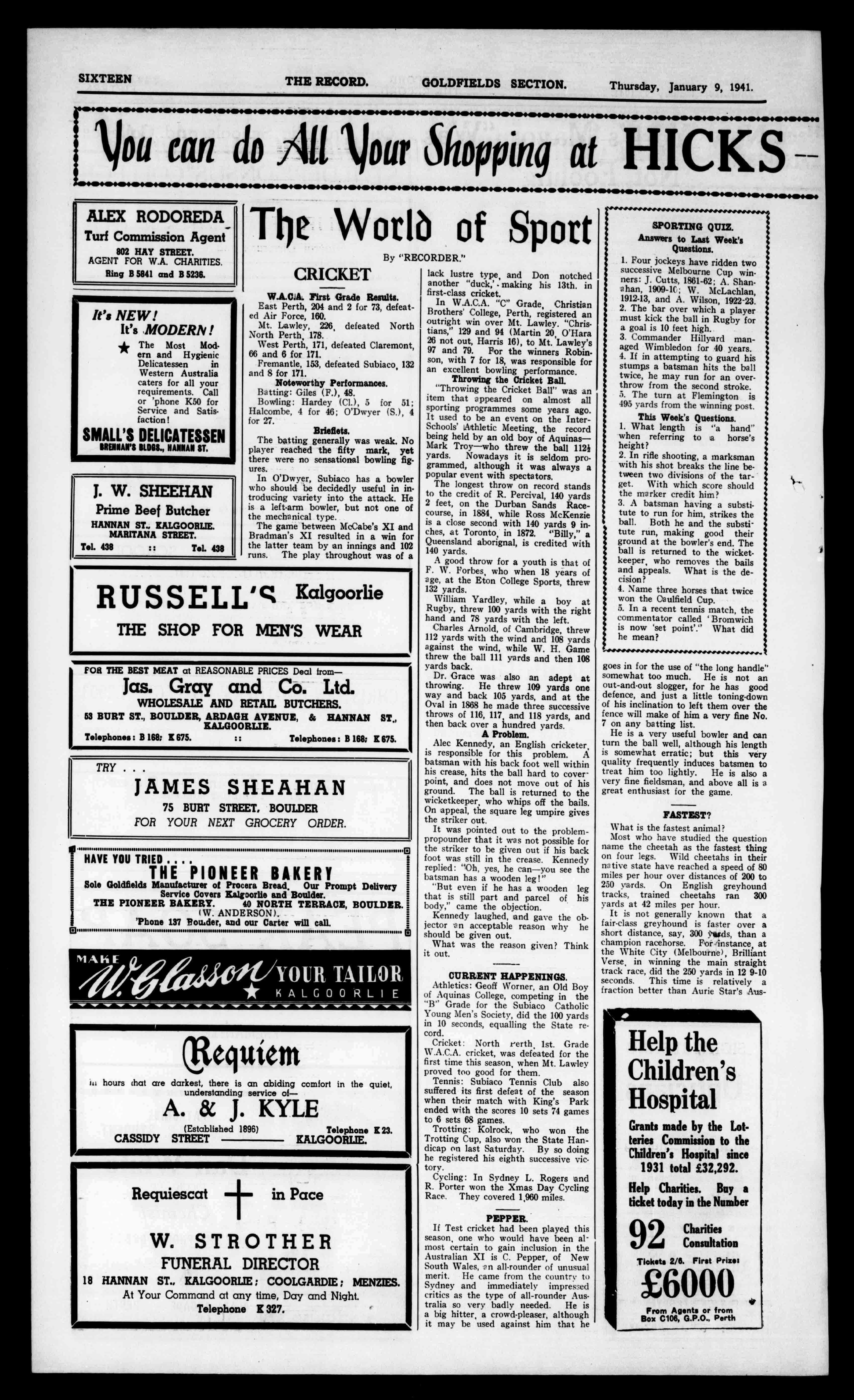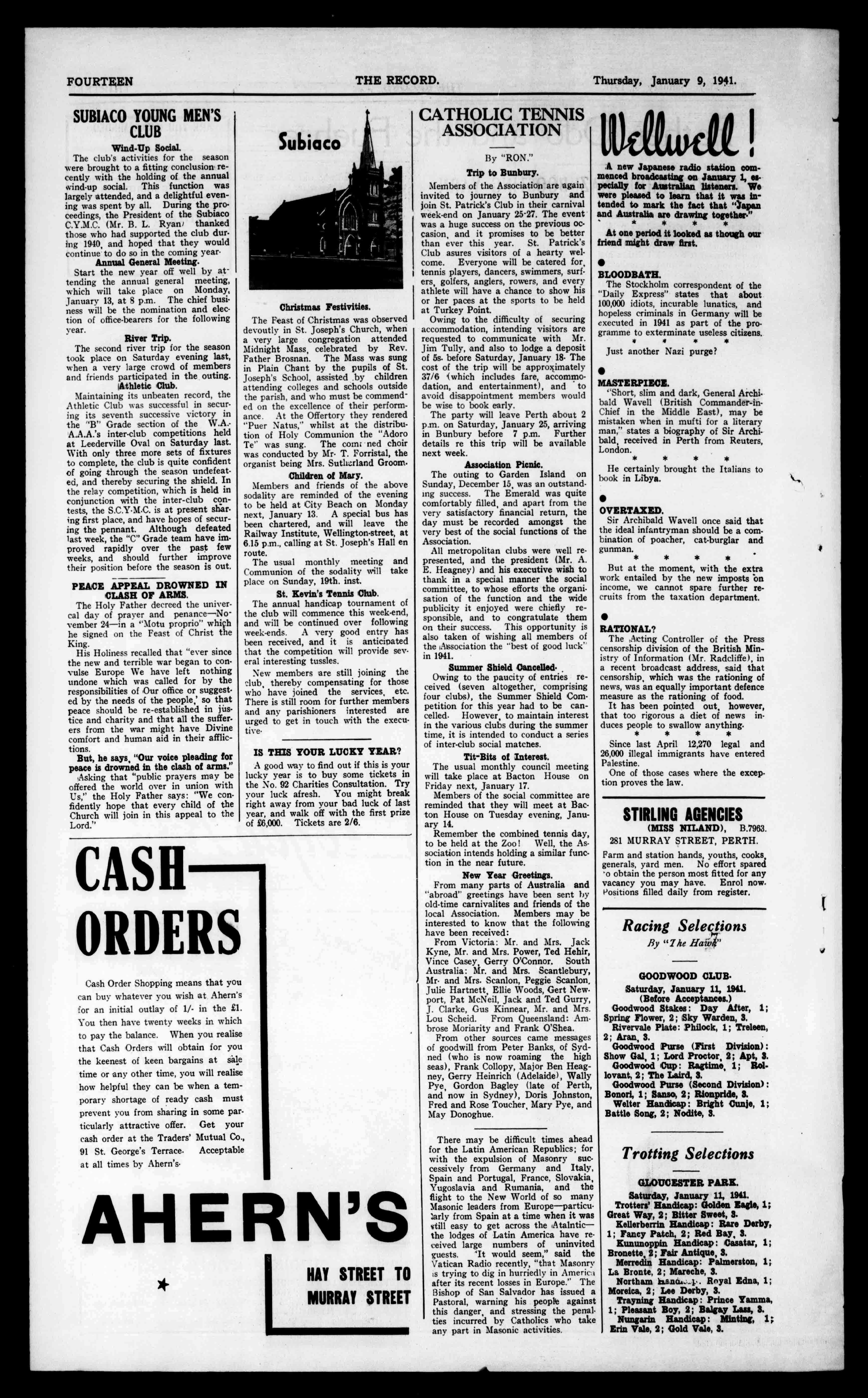 77.,F774-""' ...7-ar04-fbi theG.P.O.,Perth,Mrtransmissionbypost anewspaper. Jrar Consult with our dvertisers for all your Requirements .0,Registered SUITS IA=TAILORED 5-5-0 r\Samplesand8.M. / Free. MdtAN EATING', LADIES'siGIUNTS: TAILORS. NoteNOWAdana: 589aHAYSTREET, PERTH. (Opp.Criterion Hotel). Established42Years. Tel.:B454. PERTH,THURSDAY,JANUARY9,1941. SIXTY-EIGHTHYEAR. MODELS FROM 1,16-7-0 VERYEASY TERMS TheshopforBetterValue.Our PriceslowestinPerth.Anygoods senttocountrynotsatisfactorywepay freight. TheHouseofGoodRadios,Pianos andSewingMachines THOMSONSLTD. HAYSTREET,PERTH(oPP.FoYs) ANDATFREMANTLEANDKALGOORLIE WRITEORCALLFOR CATALOGUE. KLUISINI ,\\\\* \`" 215WilliamSt., Perth Ourmottois:"Wehaveit;wewill getit,oritcannotbegot." RADIOLA Australia'sFinestBroadcast Receiver A.W.A.RADIOVALVES TheValvesofVitality