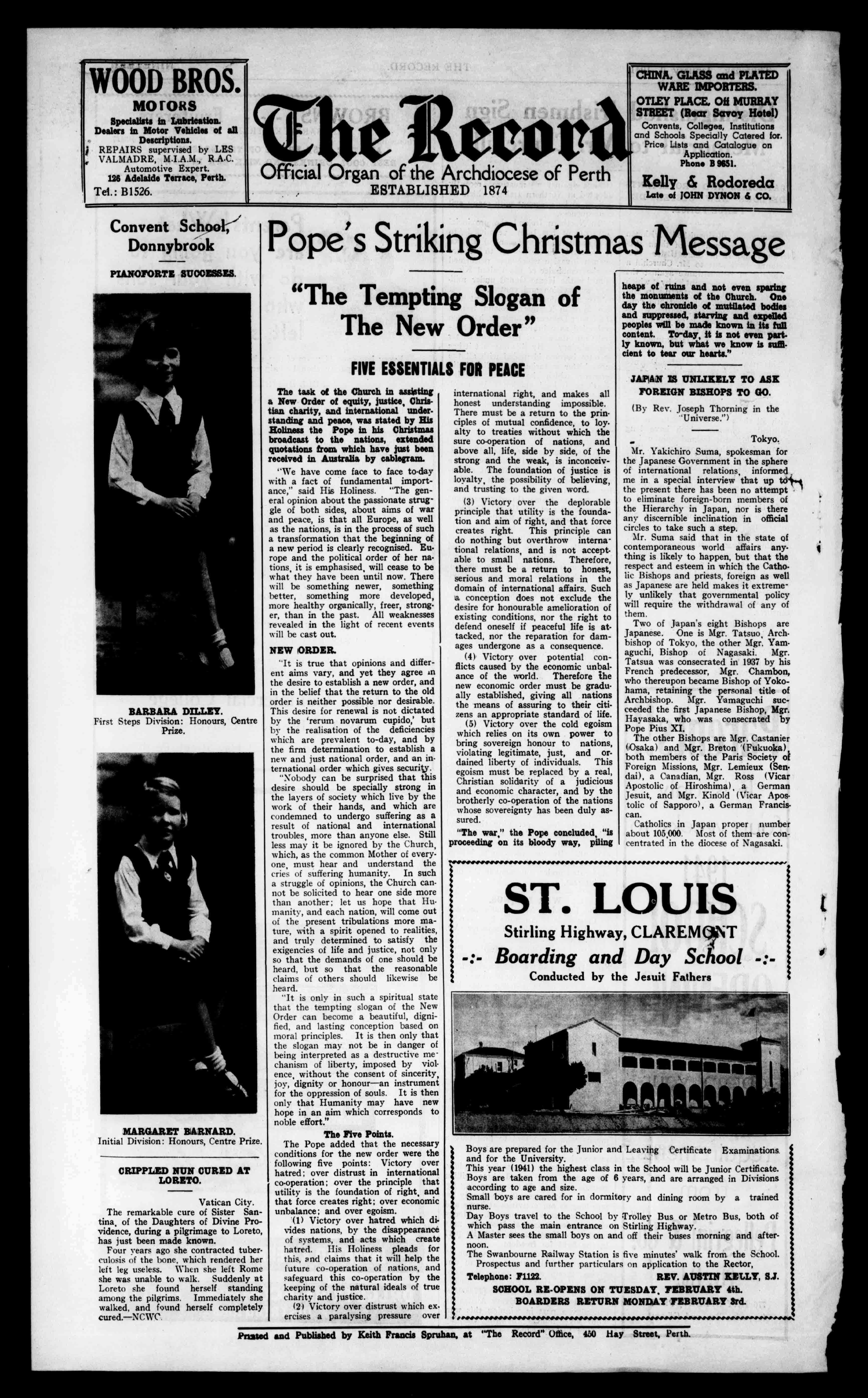 ThetaskoftheChurchinassisting aNewOrderofequity,justice,Christiancharity,andinternationalunderstandingandpeace,wasstatedbyHis HolinessthePopeinhisChristmas broadcasttothenations,extended quotationsfromwhichhavejustbeen receivedinAustraliabycablegram.