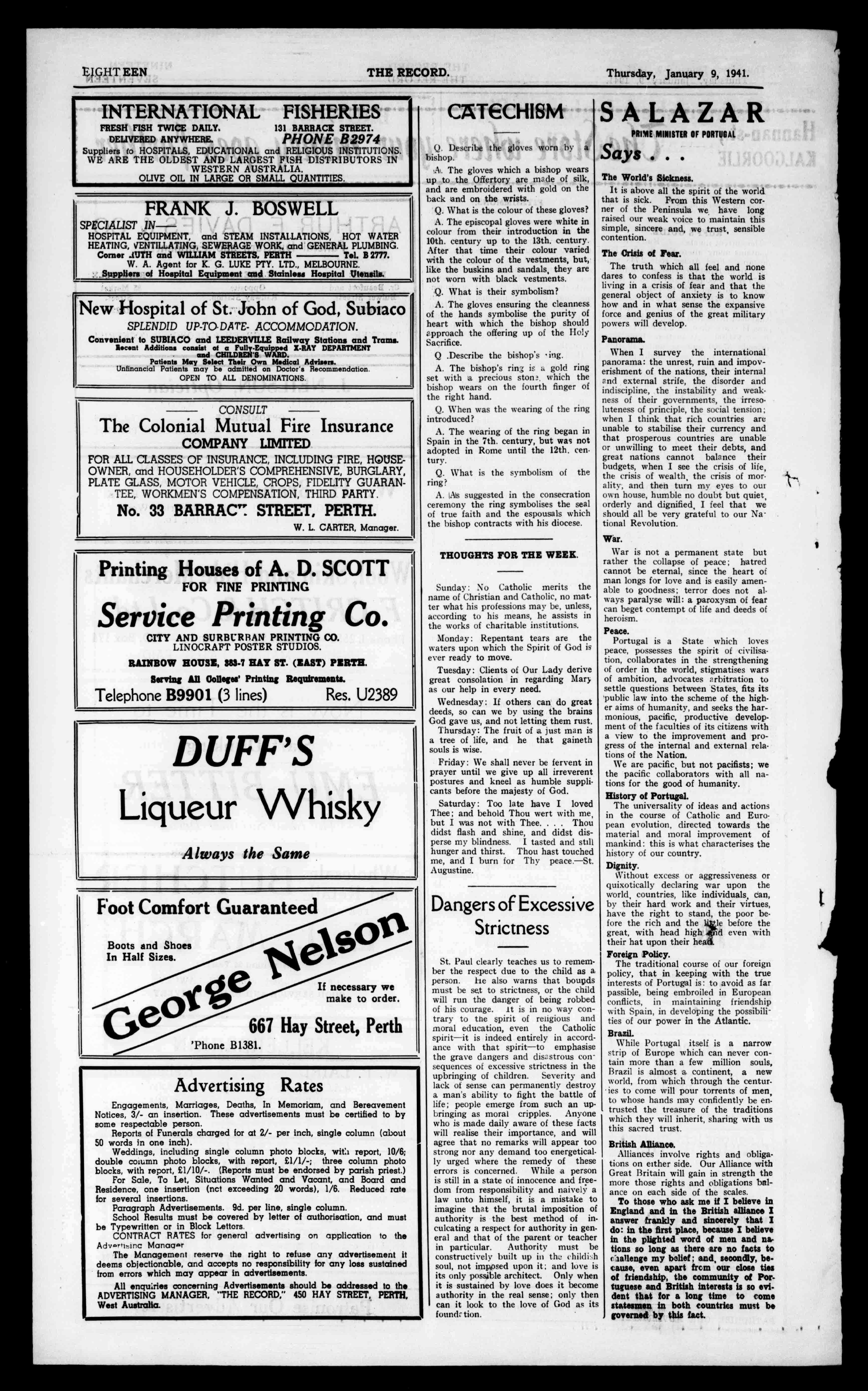 EIGHTEEN THERECORD. Thursday,January9,1941. INTERNATIONALFISHERIES FRESHFISHTWICEDAILY. 131BARRACKSTREET. DELIVEREDANYWHERE. PHONEB2974 SupplierstoHOSPITALS,EDUCATIONALandRELIGIOUSINSTITUTIONS. WEARETHEOLDESTANDLARGESTFISHDISTRIBUTORSIN WESTERNAUSTRALIA. OLIVEOILINLARGEORSMALLQUANTITIES. FRANKJ.BOSWELL SPECIALISTIN HOSPITALEQUIPMENT,andSTEAMINSTALLATIONS,HOTWATER HEATING,VENTILATING,SEWERAGEWORK,andGENERALPLUMBING. CornerRUTHandWILLIAMSTREETS,PERTH Tel.B2777. W.A.AgentforK.G.LUKEPTY.LTD.,MELBOURNE. SuppliersofHospitalEquipmentandStainlessHospitalUtensils. NewHospitalofSt.JohnofGod,Subiaco SPLENDIDUP-TODATE-ACCOMMODATION. ConvenienttoSUBIACOandLEEDERVILLERailwayStationsandTrams. RecentAdditionsconsistofaFully-EquippedX-RAYDEPARTMENT andCHILDREN'SWARD. PatientsMaySelectTheirOwnMedicalAdvisers. UnfinancialPatientsmaybeadmittedonDoctor'sRecommendation OPENTOALLDENOMINATIONS. CONSULT TheColonialMutualFireInsurance COMPANYLIMITED FORALLCLASSESOFINSURANCE,INCLUDINGFIRE,HOMEOWNER,andHOUSEHOLDER'SCOMPREHENSIVE,BURGLARY, PLATEGLASS,MOTORVEHICLE,CROPS,FIDELITYGUARANTEE,WORKMEN'SCOMPENSATION,THIRDPARTY. No.33BARRAC".STREET,PERTH. W.L.CARTER,Manager. PrintingHousesofA.D.SCOTT FORFINEPRINTING ServicePrintingCo. CITYANDSURBURRANPRINTINGCO. LINOCRAFTPOSTERSTUDIOS. RAINBOWHOUSE,383-7HAYST.(EAST)PERTH. ServingAllColleges'PrintingRequirements. TelephoneB9901(3lines) Res.U2389 DUFF'S LiqueurWhisky AlwaystheSame FootComfortGuaranteedse90° BootsandShoes InHalfSizes. ge Ifnecessarywe maketoorder. 667HayStreet,Perth 'PhoneB1381. AdvertisingRates Engagements,Marriages,Deaths,InMemoriam,andBereavement Notices,3/-aninsertion.Theseadvertisementsmustbecertifiedtoby somerespectableperson. ReportsofFuneralschargedforat2/-perinch,singlecolumn(about 50wordsinoneinch). Weddings,includingsinglecolumnphotoblocks,wit:ireport,10/6; doublecoiLmnphotoblocks,withreport,£1/1/-;threecolumnphoto blocks,withreport,£1/10/-.(Reportsmustbeendorsedbyparishpriest.) ForSale,ToLet,SituationsWantedandVacant,andBoardand Residence,oneinsertion(nctexceeding20words),1/6.Reducedrate forseveralinsertions. ParagraphAdvertisements.9d.perline,singlecolumn. SchoolResultsmustbecoveredbyletterofauthorisation,andmust beTypewrittenorinBlockLetters. CONTRACTRATESforgeneraladvertisingonapplicationtothe Manaaor TheManagementreservetherighttorefuseanyadvertisementit deemsobjectionable,andacceptsnoresponsibilityforanylosssustained fromerrorswhichmayappearinadvertisements.